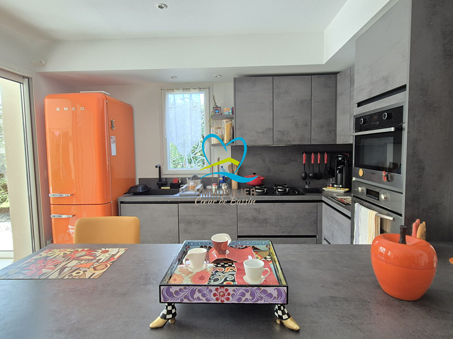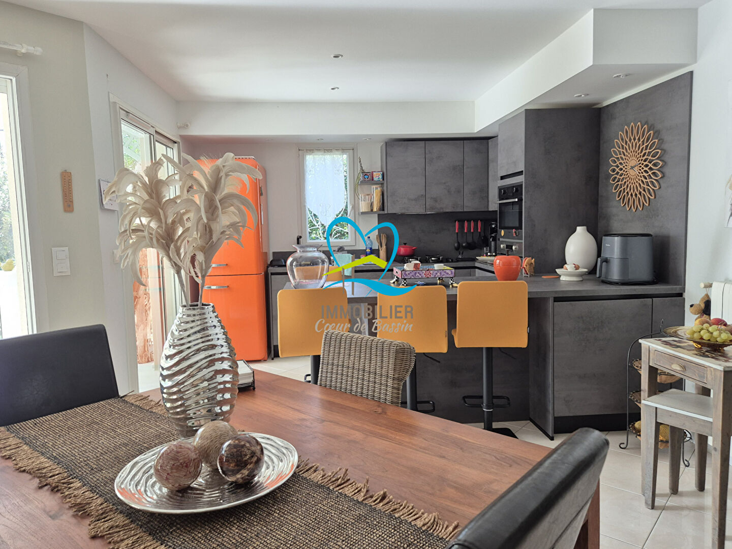 Immobilier Coeur de Bassin vous propose de découvrir cette villa contemporaine construite en 2004 par la société LASSERRE, d'une superficie de 131 m² habitables, située au calme d'un quartier résidentiel bordé par la pinède et le Golf des aiguilles vertes de Cassy. L'ensemble est en très bon état général, prestations de qualité, la villa est élevée d'un simple rez-de-chaussée composé de : - une vaste entrée avec vestiaire donnant sur un séjour lumineux exposé plein Sud-Ouest, ouvert par 3 larges baies vitrées et permettant l'accès à la terrasse couverte et carrelée. L'entrée donne également vers un garage de 20m2 (carrelé et isolé, avec porte électrique ) attenant à la maison (chaudière gaz FRISQUET). - une cuisine ouverte aménagée et équipée, un cellier buanderie. - un espace parental composé d'une chambre ouvrant sur le jardin Sud-Ouest , un dressing et une salle d'eau avec douche italienne, plan carrelé avec vasque, un wc. - à l'opposé un espace "invités" comprenant deux chambres avec placards, un wc indépendant et une salle d'eau. EXTERIEUR : Larges trottoirs carrelés , allée en enrobé avec parking aérien d'environ 4 places, un abri de jardin de 18m2. Puits foré, arrosage automatique. Le jardin a été idéalement paysager et aménagé. Vastes terrasses intimistes dont une transformée en jardin d'hiver avec climatisation réversible (15m2). Jardin agrémenté de diverses essences végétales et florales, piscinable est exposé plein SUD, sans vis à vis, avec une vue imprenable sur la pinède. Contacter Chrystel au 06.17.30.39.60, agent commercial inscrit au RSAC de Bordeaux 840 160 451. (3.64 % honoraires TTC à la charge de l'acquéreur.) Chrystel DADOLE (EI) Agent Commercial - Numéro RSAC : 840160451 - BORDEAUX.