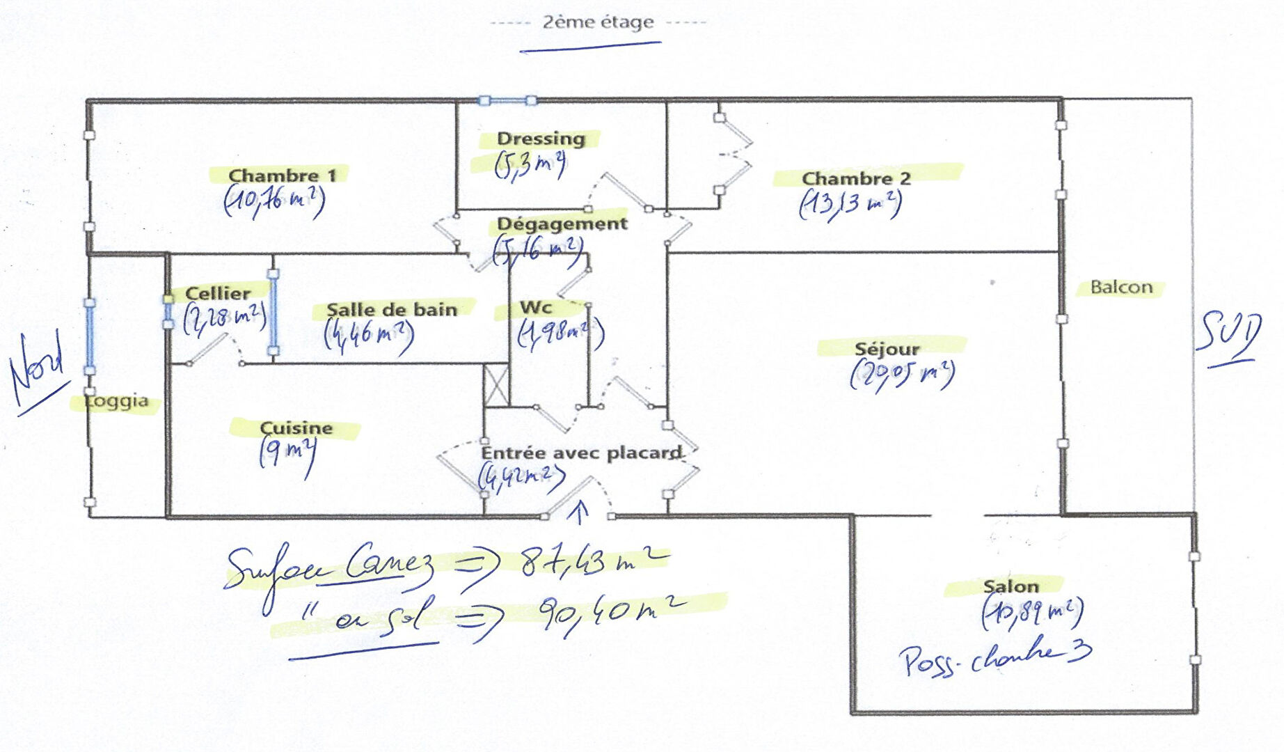 Au 2 ème étage plein sud, découvrez ce spacieux T4 de 90 m² au sol (87,43 m² loi Carrez) comprenant :
