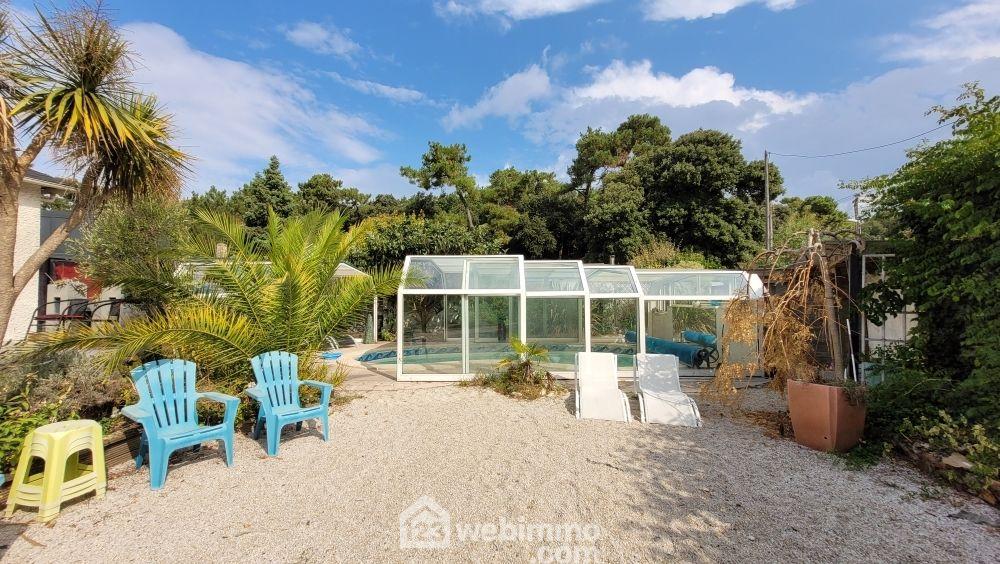 Votre agence 123webimmo l'immobilier au meilleur prix vous présente : Belle demeure composée d'une grande pièce de vie avec cheminée insert, un magnifique cuisine aménagée et équipée avec ouverture sur un patio, une pièce intermédiaire, 5 grandes chambres dont 2 avec salle de bain ou salle d'eau / WC, un salle d'eau / WC indépendante, un WC avec coté lave mains, un dégagement avec des penderies, une véranda et une cave. À l'étage une chambre et un WC. Une dépendance avec poêle à granules et véranda ouvrant sur le patio. Sur un terrain de 790 m² avec piscine chauffée et couverte, une grande terrasse, un coté couvert avec barbecue et un grand carport. La plage du Rocher à 200m. Bien rare à découvrir avec Valérie au 06 76 26 97 79.