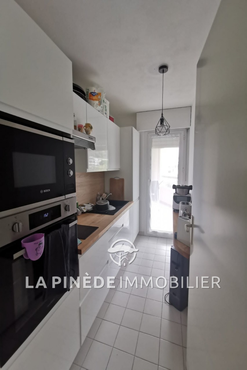 entrée, séjour lumineux sur une belle terrasse de 15m² Ouest, cuisine indépendante équipée, chambre, salle de bain, wc indépendant, parking sous-sol et cave.