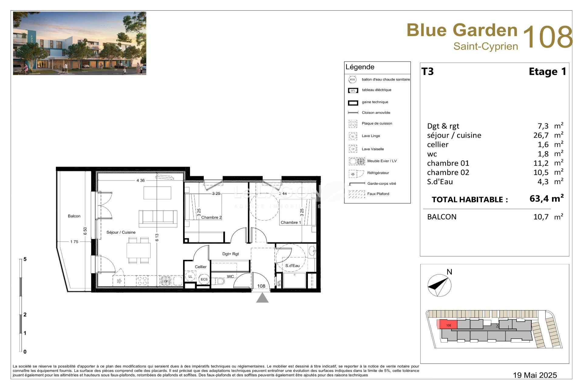 Au premier étage, un appartement NEUF de type 3 d'une superficie de 63,40 m² comprenant une entrée avec placard aménagé, un séjour-salon-cuisine d'environ 27 m² ouvert sur une terrasse d'environ 11 m² plein Sud, 2 belles chambres dont une avec placard aménagé, une salle d'eau équipée avec douche à l'italienne et WC, un cellier.