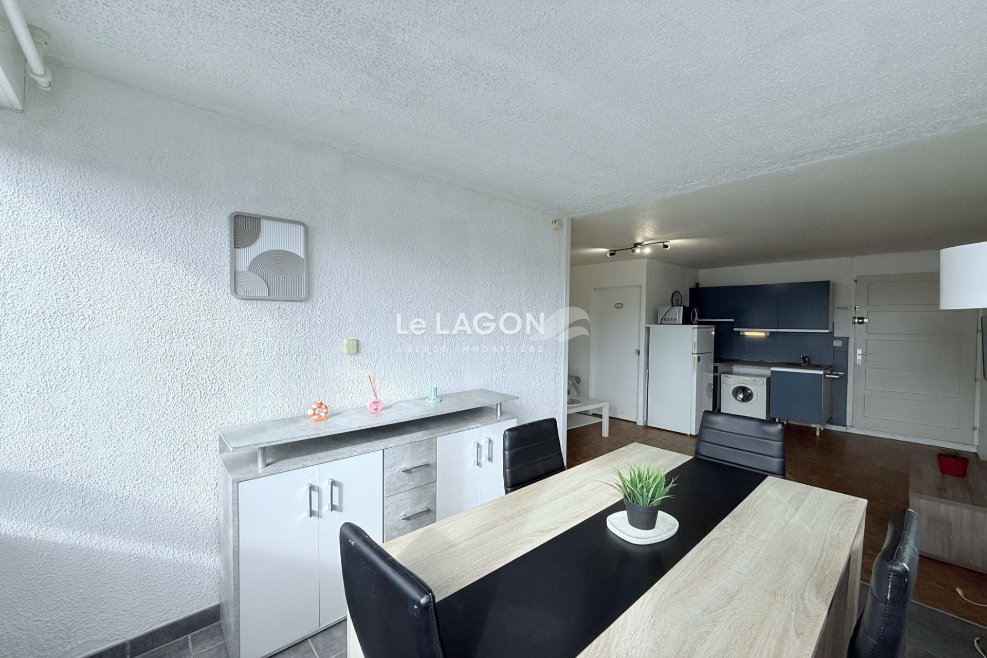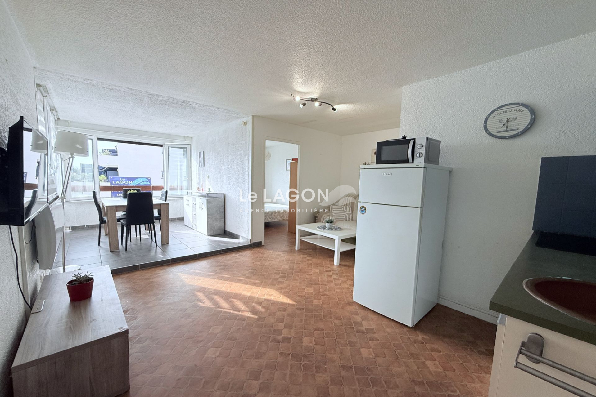 FRONT DE MER : À 2 pas de toutes les commodités, dans une résidence sécurisée, appartement MEUBLÉ au premier étage comprenant une entrée sur un séjour-salon coin cuisine équipée de plus de 22 m2 (S.U.), une chambre-cabine, une salle d'eau avec WC.