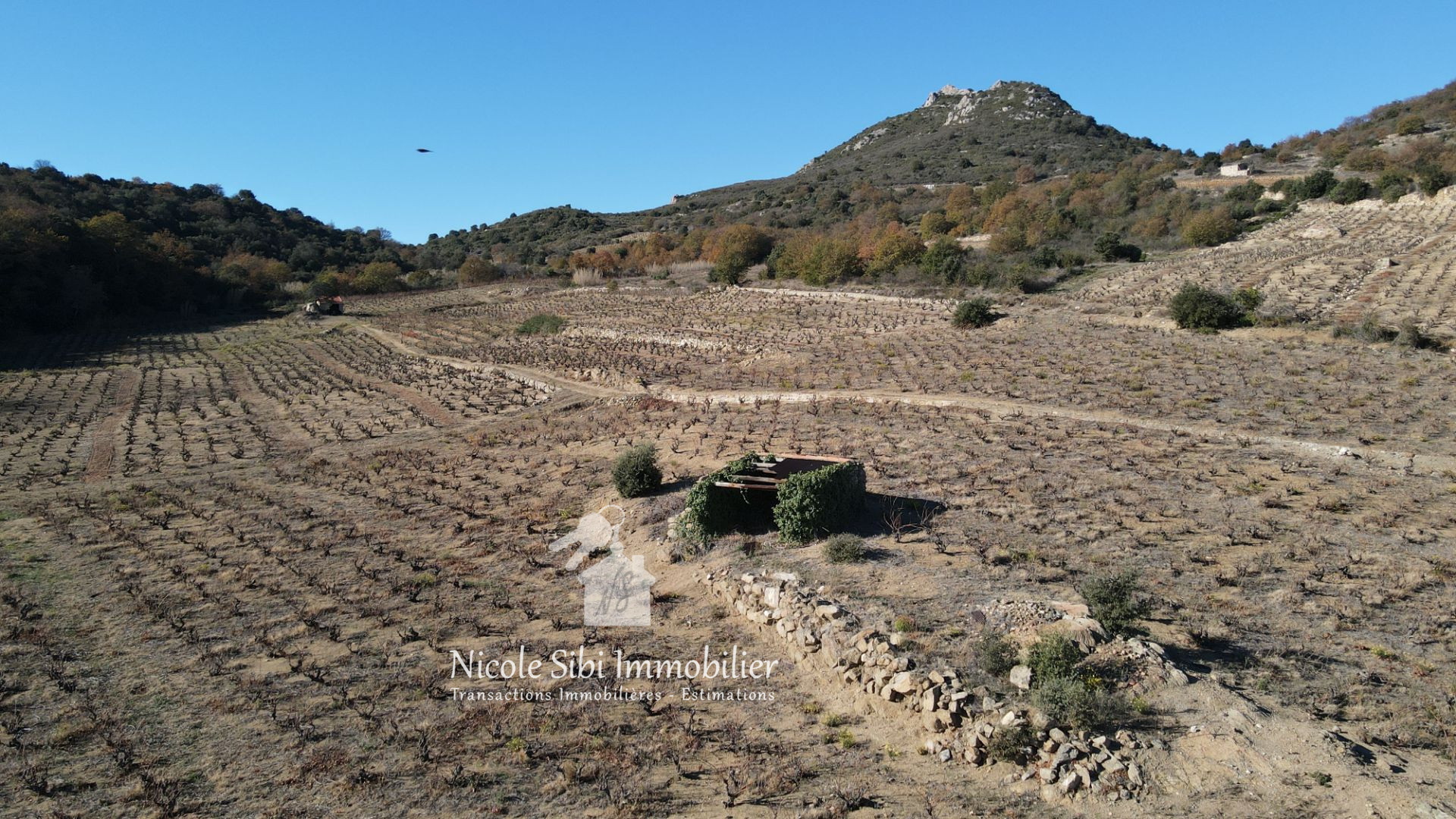 Parcelle de 8700 m² composée d'une vigne de type carignan noir avec cazot, plat, isolé, accessible en véhicule par chemin en terre, idéal pour un projet agricole ou de loisir.