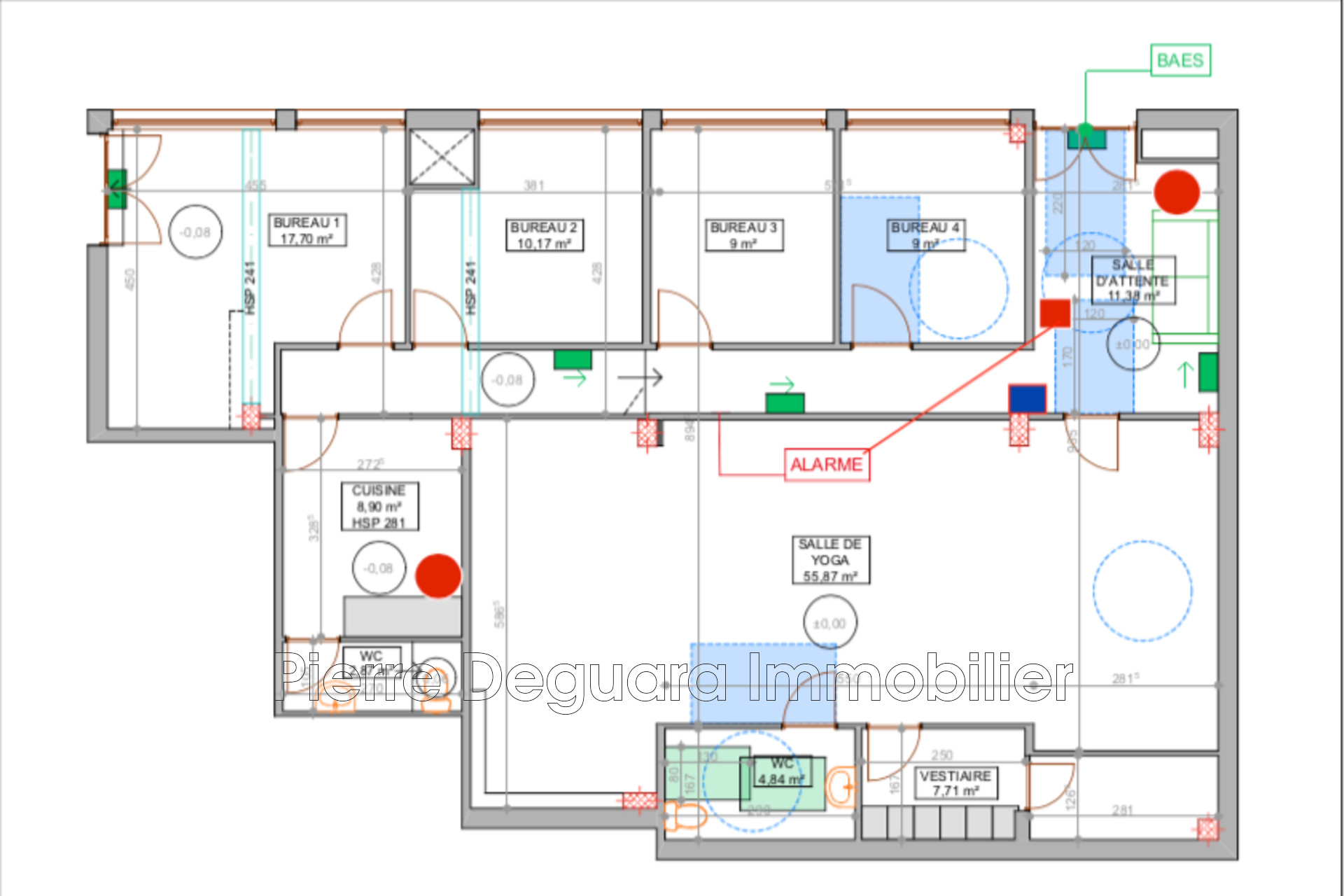 Etat général excellent, entièrement climatisé qui dispose d'une salle d'attente, 4 bureaux, une grande salle de 56m2, cuisine, vestiaire et wc.