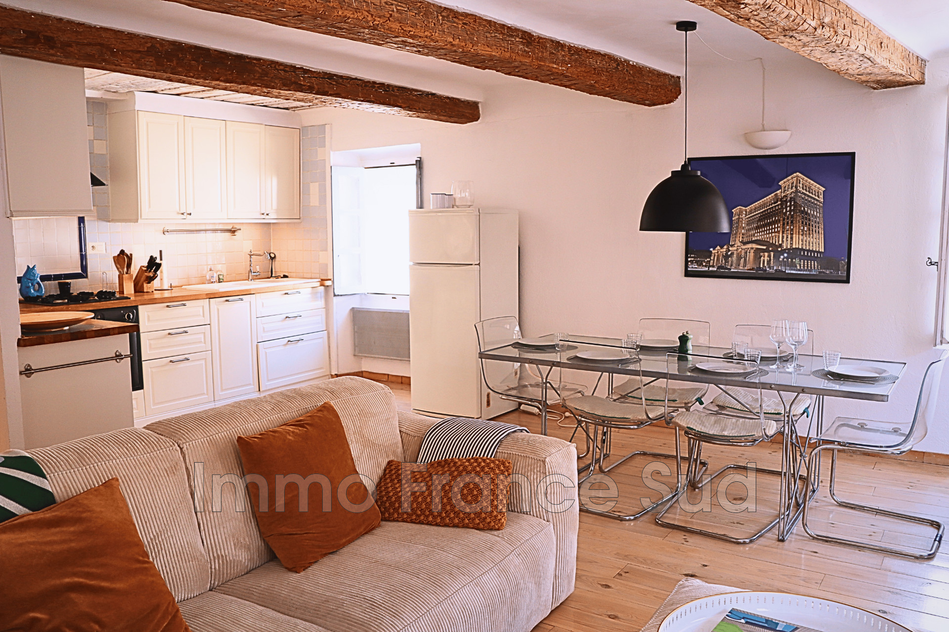 Une cuisine ouverte conviviale et un salon chaleureux, parfaits pour partager des repas et des moments de détente en famille ou entre amis.