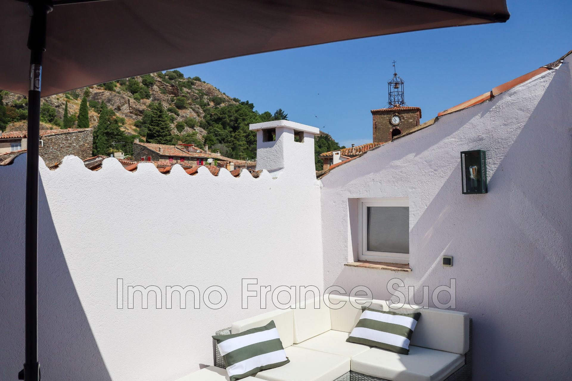 Une terrasse tropézienne, idéale pour savourer un café le matin ou un apéritif en soirée, tout en profitant de la vue sur les toits du village.