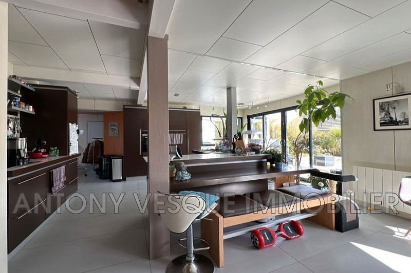 Au rez-de-chaussée, une grande entrée dessert un spacieux séjour/salon lumineux, une cuisine aménagée et équipée ouverte sur le séjour, une arrière-cuisine, une buanderie, cinq chambres dont une suite parentale avec salle d'eau et dressing, deux salles d'eau supplémentaires, une salle de sport, un dégagement et des WC. À l'étage, une mezzanine de 35 m² avec 4 mètres de plafond, intégrant une partie « en trampoline » donnant sur le séjour et un accès à un toit-terrasse.