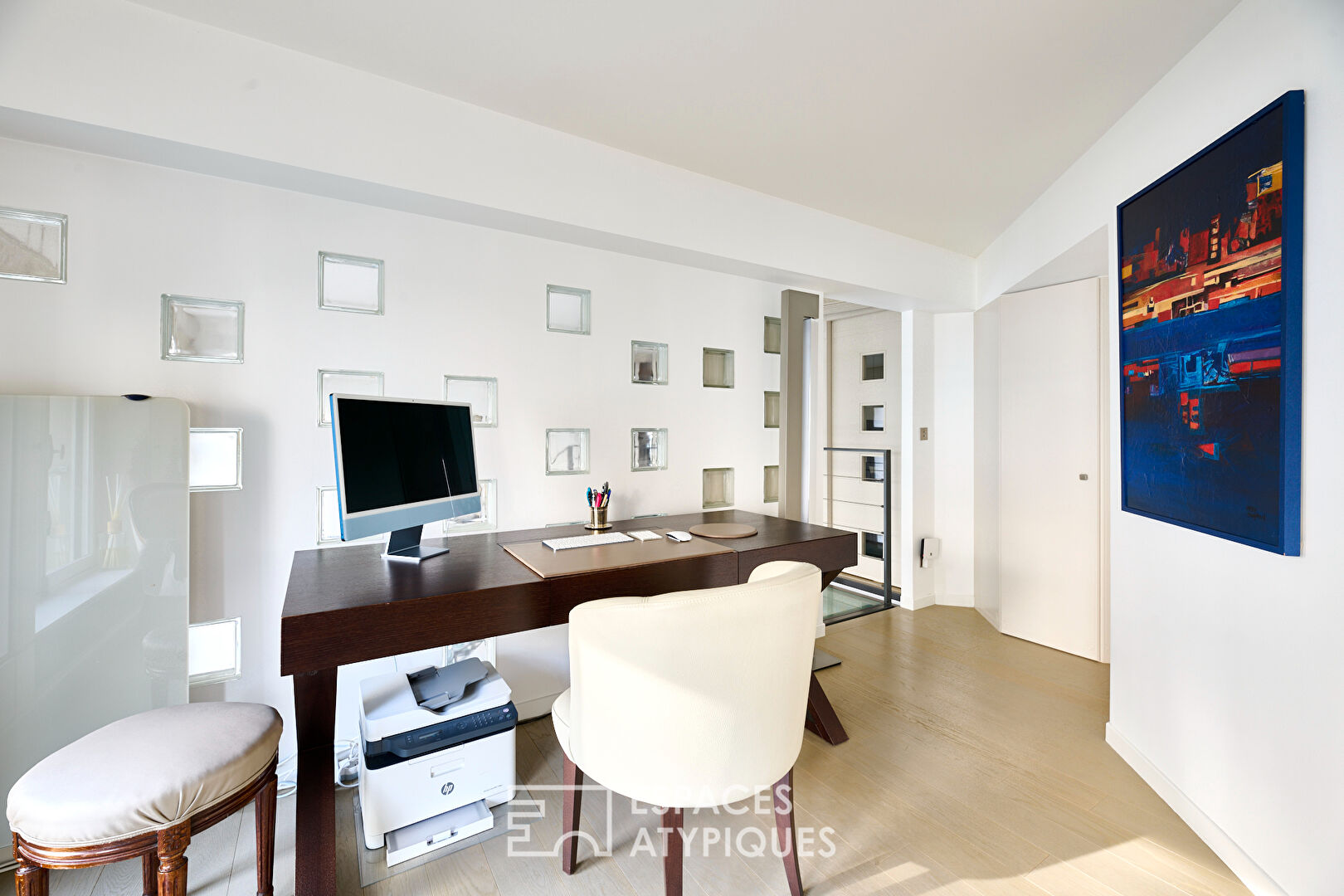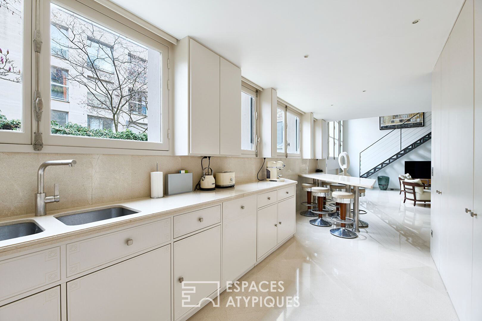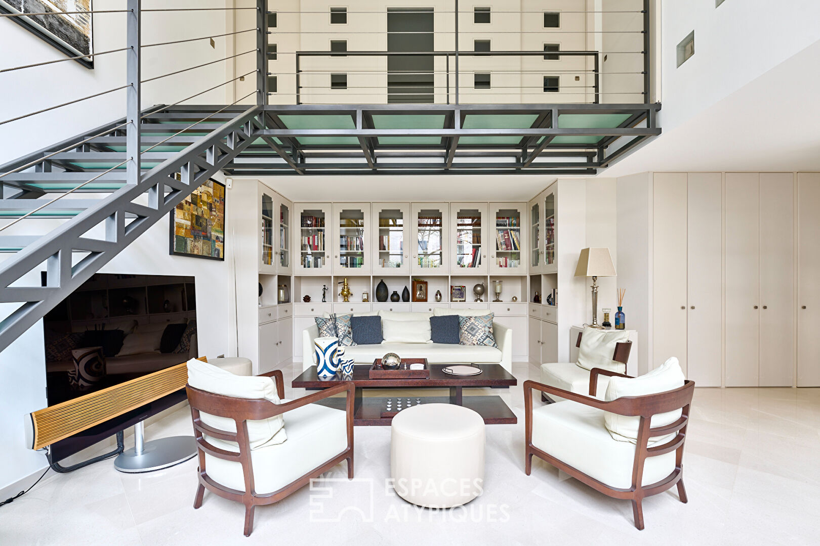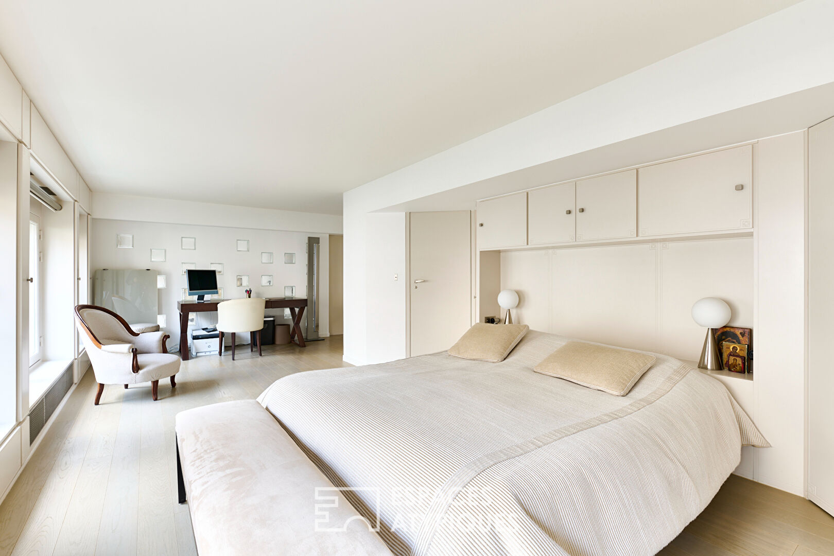 Situé très au calme, dans la villa privée la plus convoitée du 17e arrondissement, au sein d'un bâtiment charismatique, ce duplex de 119,97 m2 (117,21 m2 Carrez) offre de véritables prestations haut de gamme. Vous serez d'abord saisi par la majestuosité de l'édifice qui abrite ce bien tout à fait exceptionnel. Passé le sas vitré du bâtiment, vous êtes accueilli par un élégant hall entièrement habillé de bois qui distribue les appartements des quelques privilégiés de l'adresse. Une fois le seuil de l'appartement franchi, l'harmonie de ce bien d'expression vous transporte. L'entrée, équipée de nombreux placards, présente un sanitaire suivi de toilettes invités. L'espace de vie lui succède, parfaitement lumineux grâce aux nombreuses fenêtres et à la double hauteur de 4m90. La bibliothèque sur mesure alterne entre niches lumineuses et placards vitrés. De son côté, la cuisine, dînatoire et ouverte, est entièrement sertie de pierre marbrière, équipée haut de gamme et pourvue de placards de rangement. Le robuste escalier-structure, composé de marches et de dalles de verres lumineuses, allumées selon les humeurs, vous conduit à l'étage composé de deux chambres. La master suite de 33 m2 offre d'innombrables petits et grands placards de rangement et intègre une salle de bain avec grande baignoire, douche à l'italienne et toilettes. La "mini-suite" de 19 m2, en second jour, bénéficie de nombreux placards dressing et d'une salle de douche à l'italienne avec toilettes. L'orchestration menée par l'architecte est sans aucune mesure : tout est détail, rien n'a été laissé au hasard, du sur mesure à l'état pur, où l'Art Déco côtoie le contemporain avec élégance et cohérence. Stores électriques intérieur et extérieur, équipement Meljac, alarme etc. Possibilité d'acquérir en sus une place de parking en sous-sol du bâtiment. Bien soumis au régime de copropriété avec gardiennage 24/24. Métro et RER Neuilly - Porte Maillot Contact : Vivien +33 6 58 66 19 75 Copropriété de 6 lots (Pas de procédure en cours). Charges annuelles : 2400 euros.