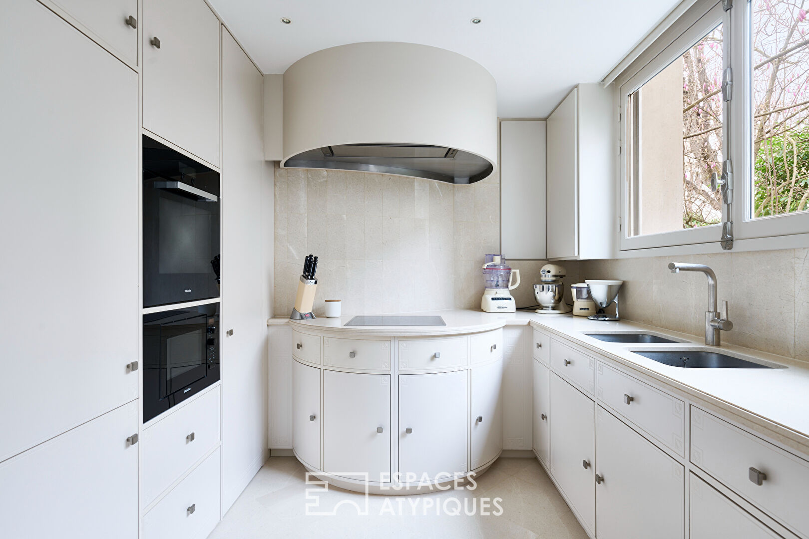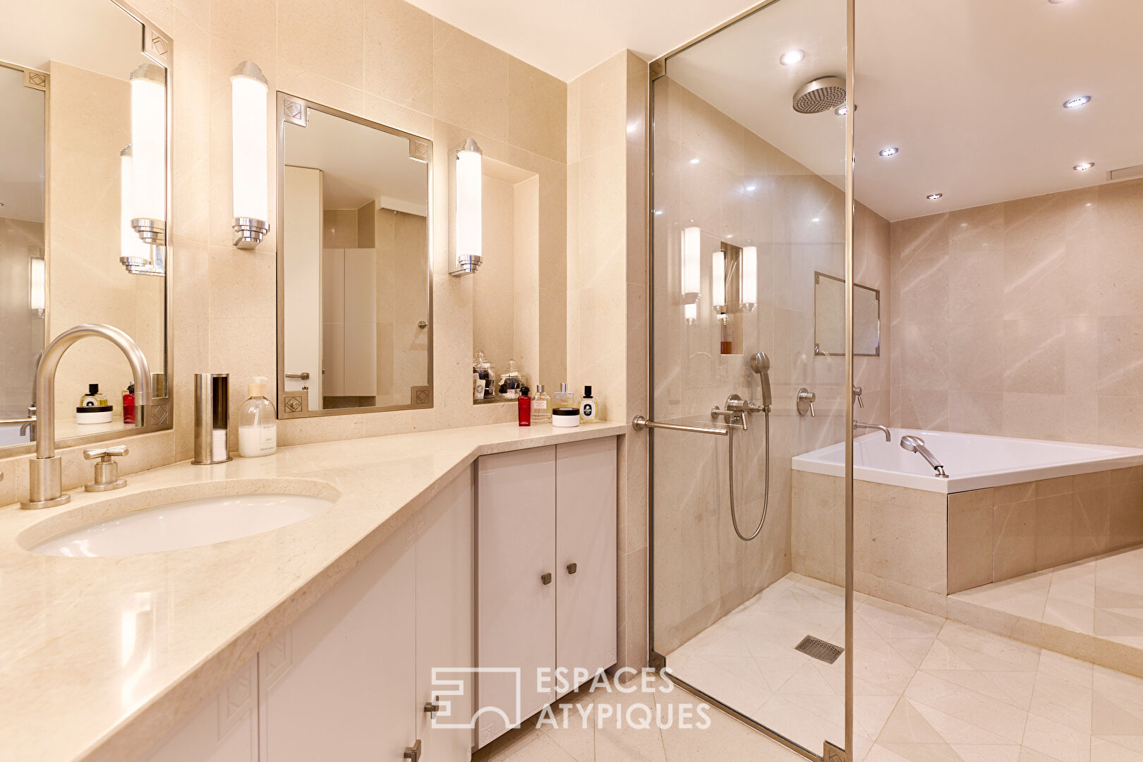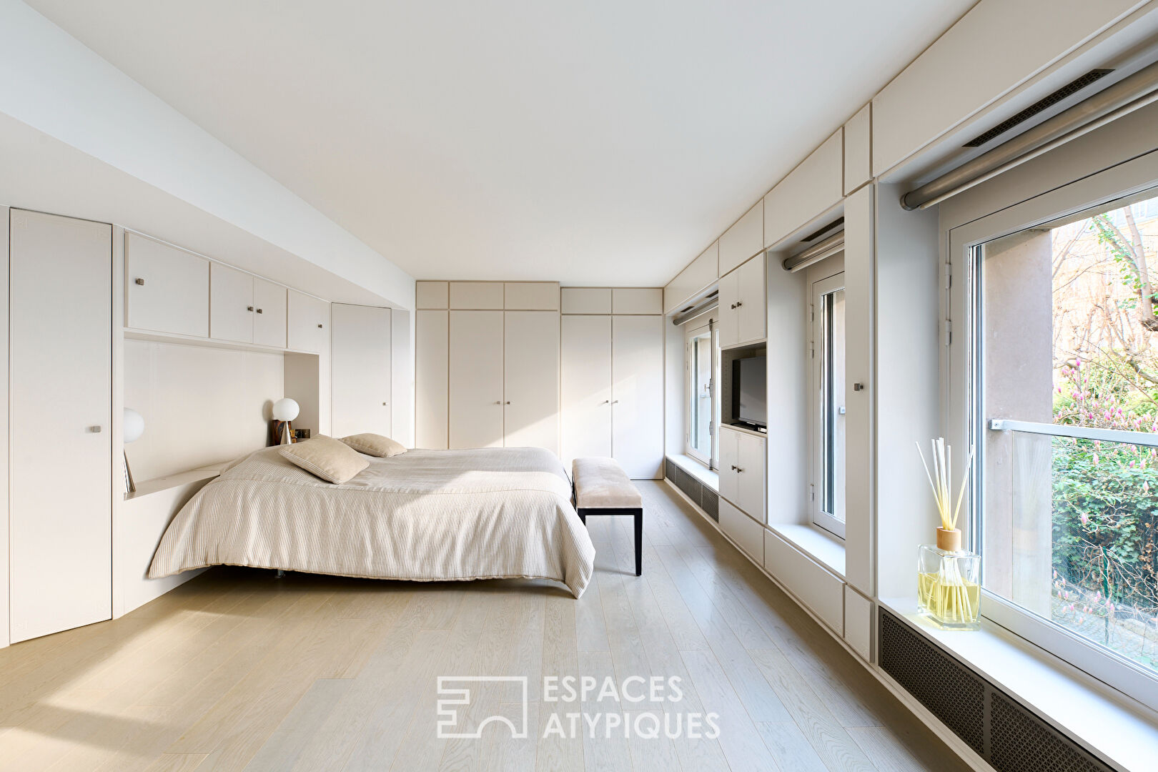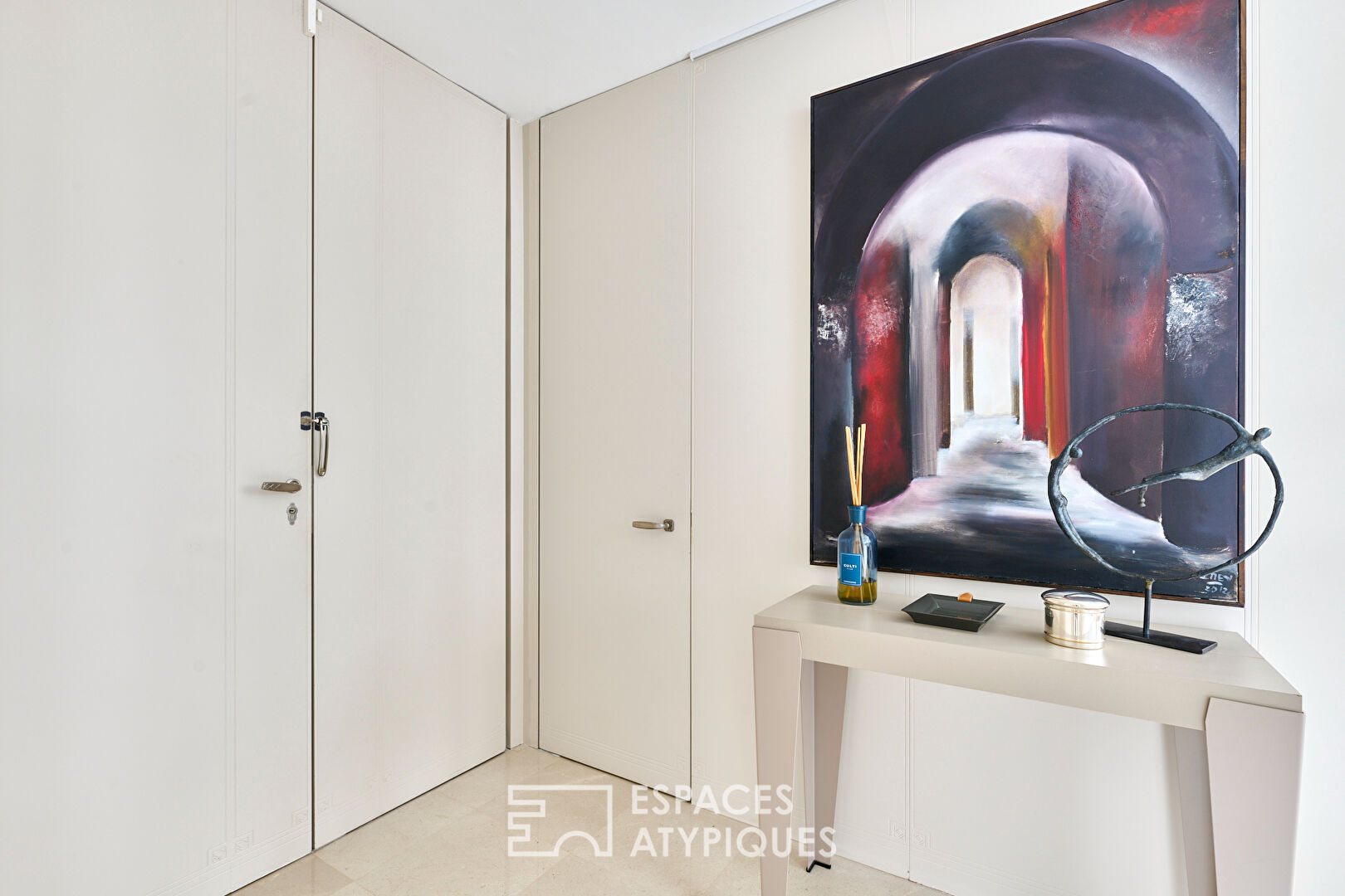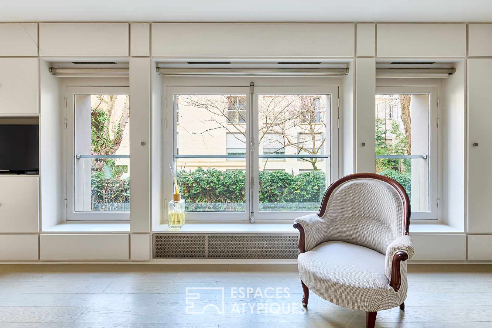 Situé très au calme, dans la villa privée la plus convoitée du 17e arrondissement, au sein d'un bâtiment charismatique, ce duplex de 119,97 m2 (117,21 m2 Carrez) offre de véritables prestations haut de gamme. Vous serez d'abord saisi par la majestuosité de l'édifice qui abrite ce bien tout à fait exceptionnel. Passé le sas vitré du bâtiment, vous êtes accueilli par un élégant hall entièrement habillé de bois qui distribue les appartements des quelques privilégiés de l'adresse. Une fois le seuil de l'appartement franchi, l'harmonie de ce bien d'expression vous transporte. L'entrée, équipée de nombreux placards, présente un sanitaire suivi de toilettes invités. L'espace de vie lui succède, parfaitement lumineux grâce aux nombreuses fenêtres et à la double hauteur de 4m90. La bibliothèque sur mesure alterne entre niches lumineuses et placards vitrés. De son côté, la cuisine, dînatoire et ouverte, est entièrement sertie de pierre marbrière, équipée haut de gamme et pourvue de placards de rangement. Le robuste escalier-structure, composé de marches et de dalles de verres lumineuses, allumées selon les humeurs, vous conduit à l'étage composé de deux chambres. La master suite de 33 m2 offre d'innombrables petits et grands placards de rangement et intègre une salle de bain avec grande baignoire, douche à l'italienne et toilettes. La "mini-suite" de 19 m2, en second jour, bénéficie de nombreux placards dressing et d'une salle de douche à l'italienne avec toilettes. L'orchestration menée par l'architecte est sans aucune mesure : tout est détail, rien n'a été laissé au hasard, du sur mesure à l'état pur, où l'Art Déco côtoie le contemporain avec élégance et cohérence. Stores électriques intérieur et extérieur, équipement Meljac, alarme etc. Possibilité d'acquérir en sus une place de parking en sous-sol du bâtiment. Bien soumis au régime de copropriété avec gardiennage 24/24. Métro et RER Neuilly - Porte Maillot Contact : Vivien +33 6 58 66 19 75 Copropriété de 6 lots (Pas de procédure en cours). Charges annuelles : 2400 euros.