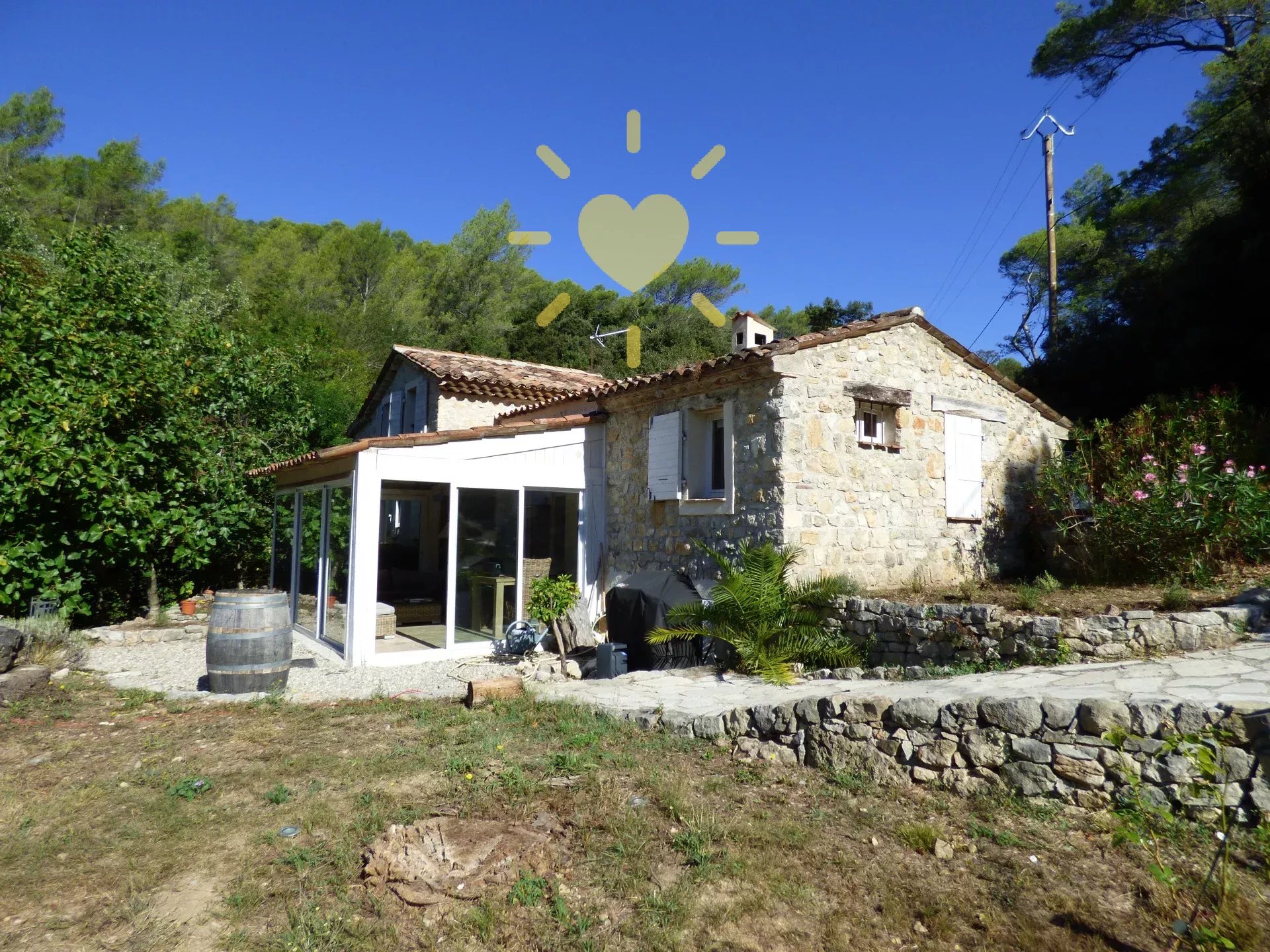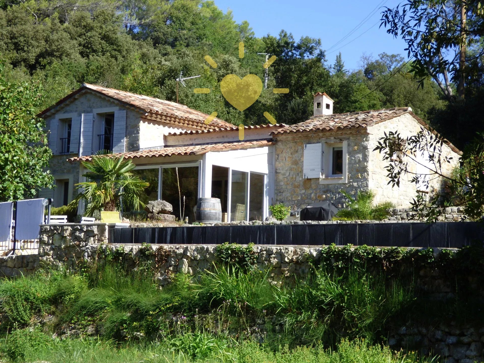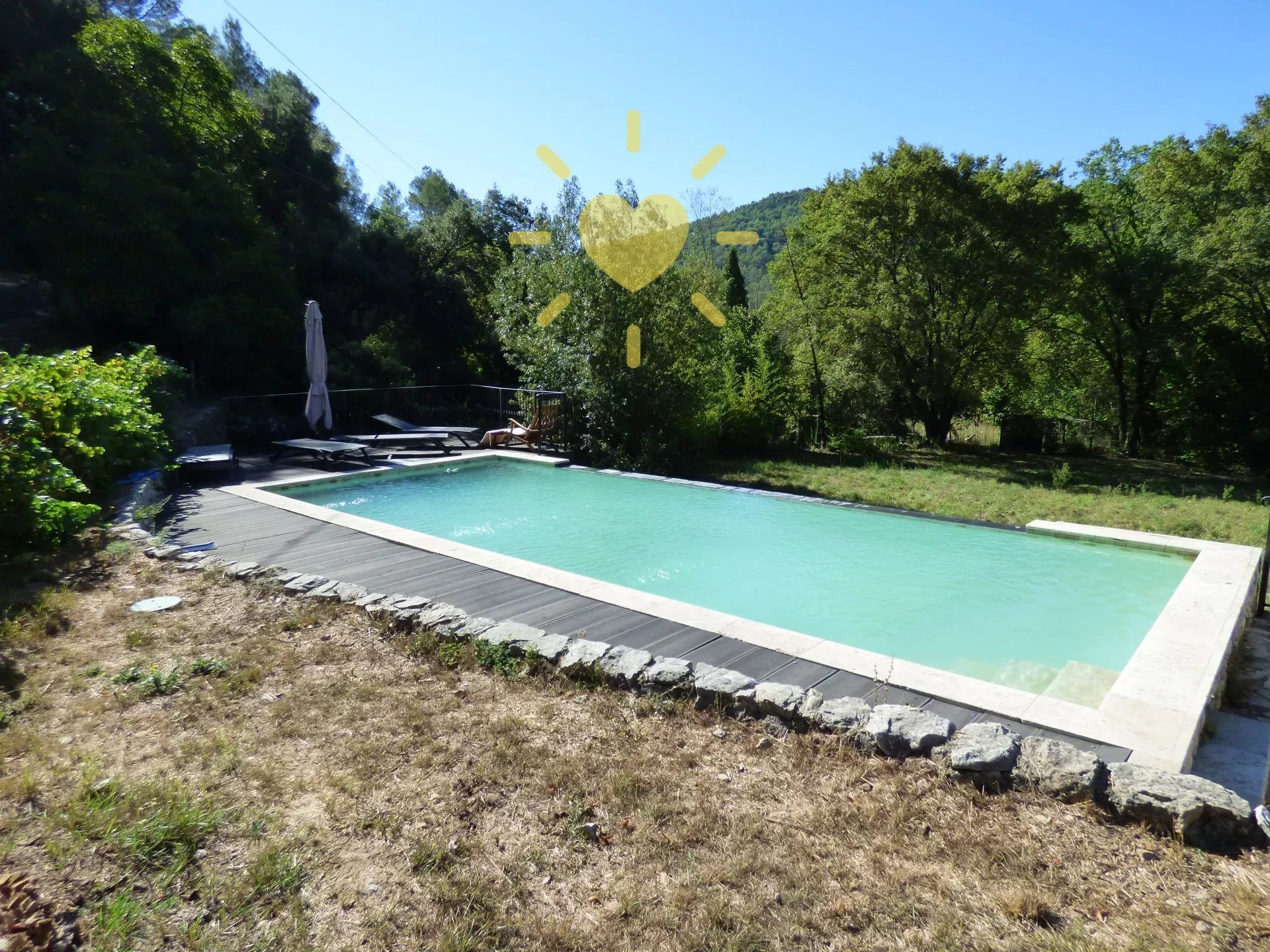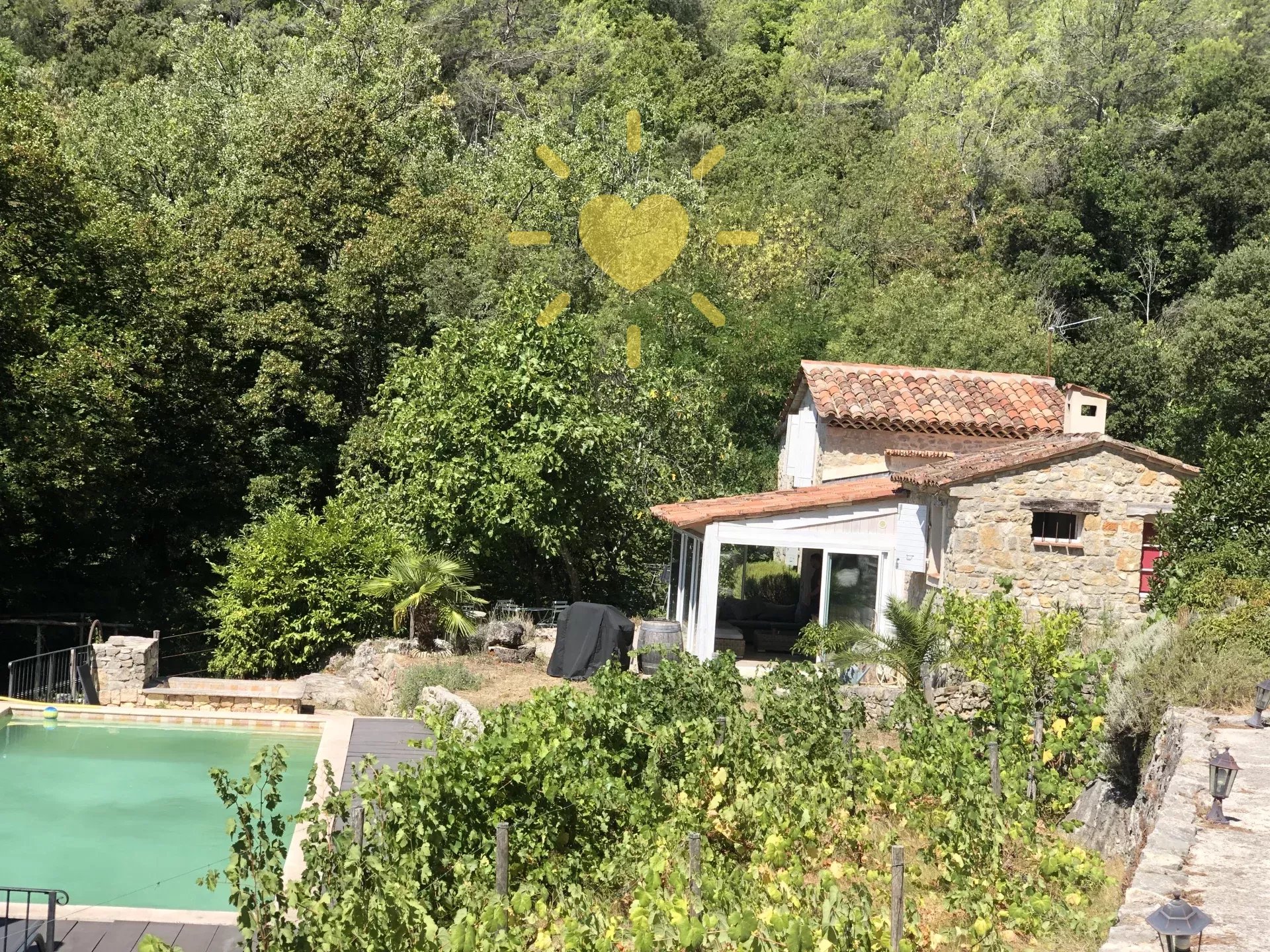 Sur un terrain de 2 600 m2, mas rénové et agrandit comprenant : véranda, séjour, cuisine équipée avec cheminée, bureau/chambre, salle d'eau avec WC. A l'étage : chambre avec salle d'eau et WC. Piscine 10 m x 4 m. Eau par pompage avec microfiltre et anti-tartre. Toiture en partie neuve. Exposition Sud. Vue sur la nature. Pas d'agrandissement possible.