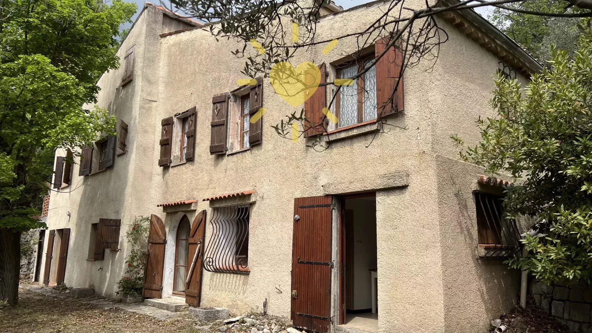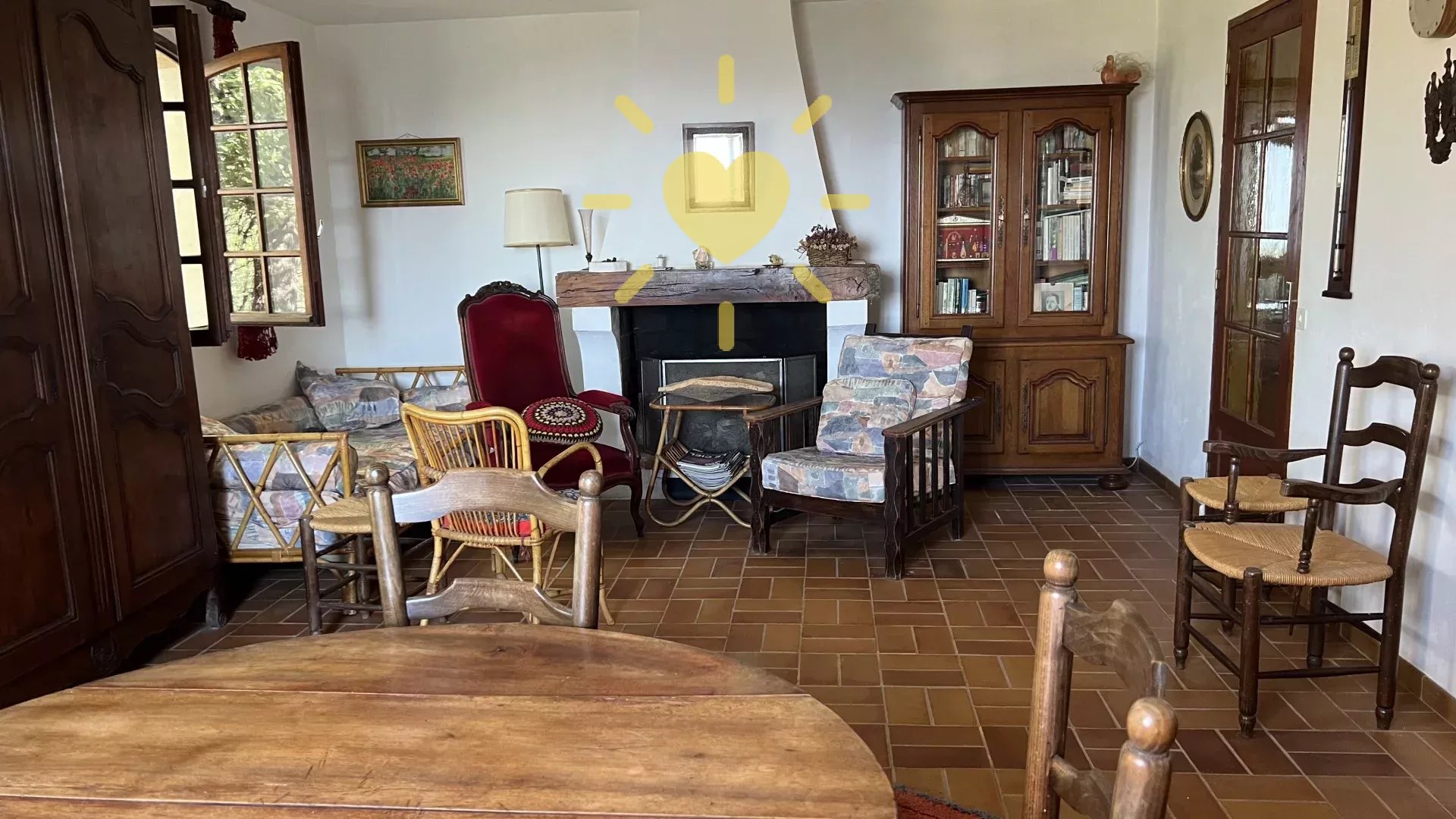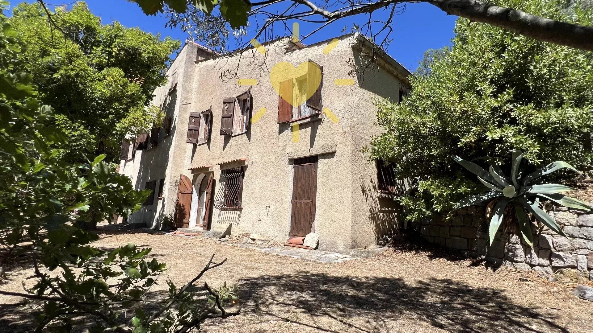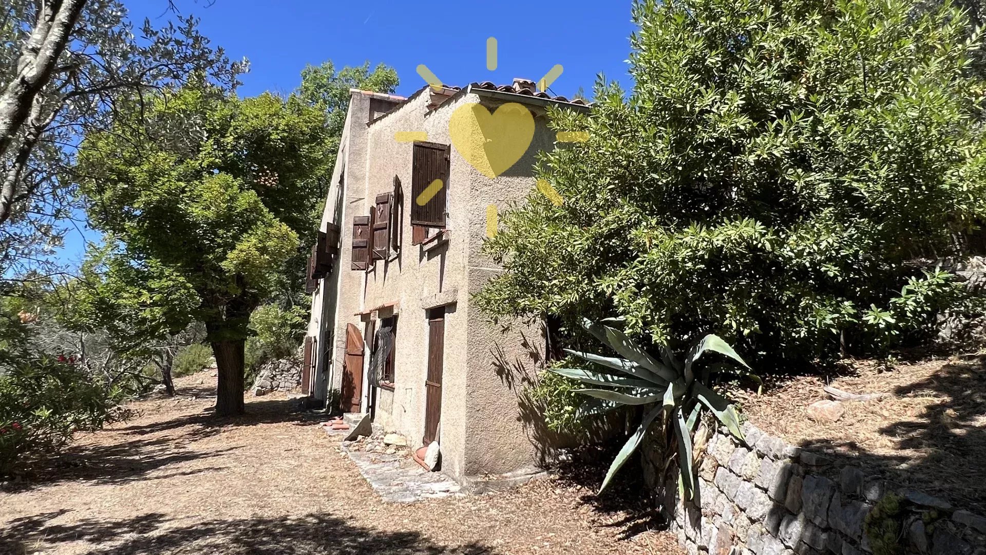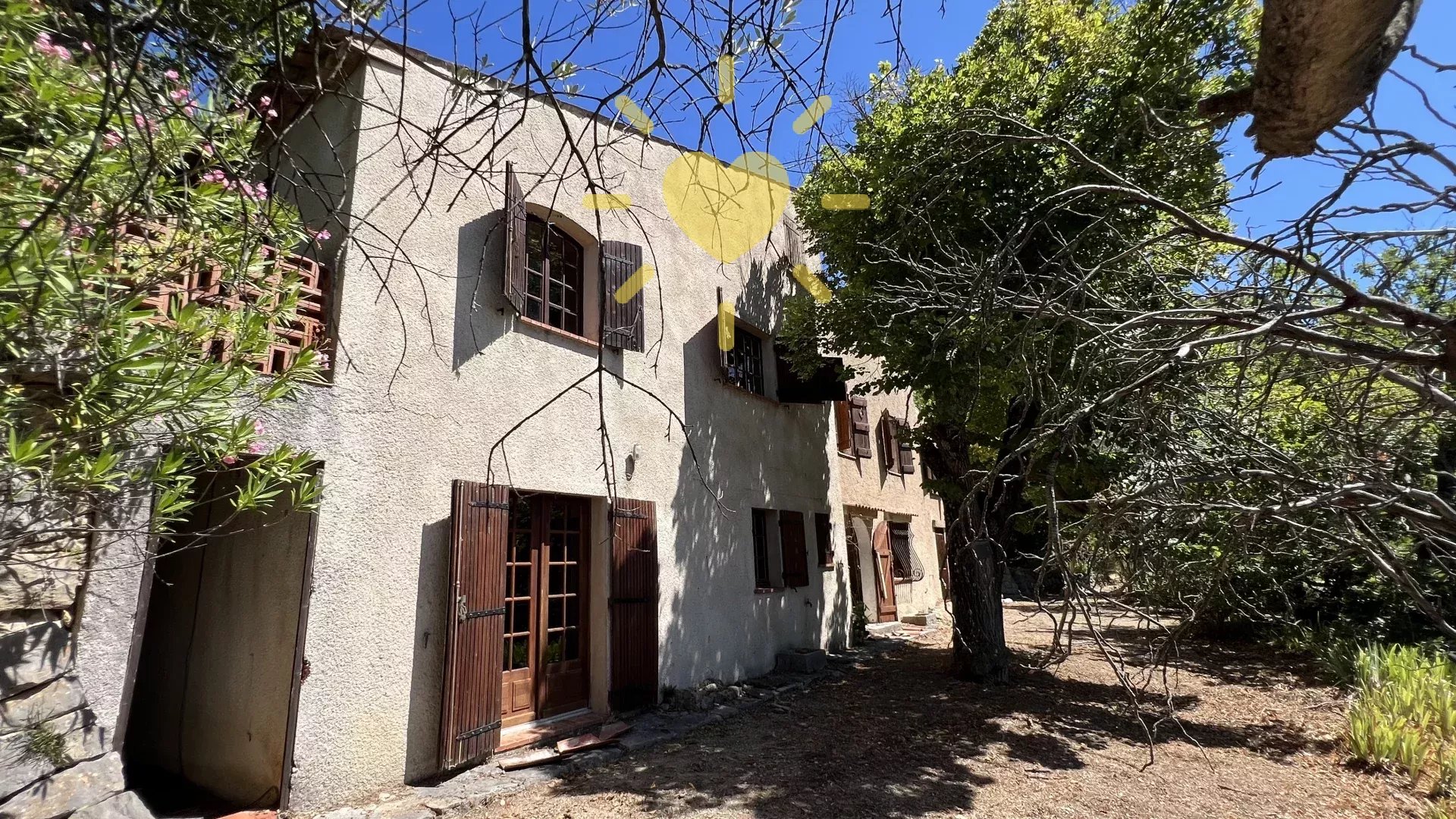 Sur un terrain de plus d’un hectare, au calme avec vue panoramique, maison style « Bastide » comprenant : Rez-de-chaussée : Entrée, séjour avec cheminée, cuisine, 2 chambres, salle d’eau avec WC. Rez-de-jardin : 2 chambres, salle d’eau, WC indépendant, buanderie. Cabanon indépendant, double garage. Très beau potentiel ! Exposition Sud. Beau terrain en restanques avec de belles parties plates et ombragées. Travaux à prévoir. Environ 2 km du village.
