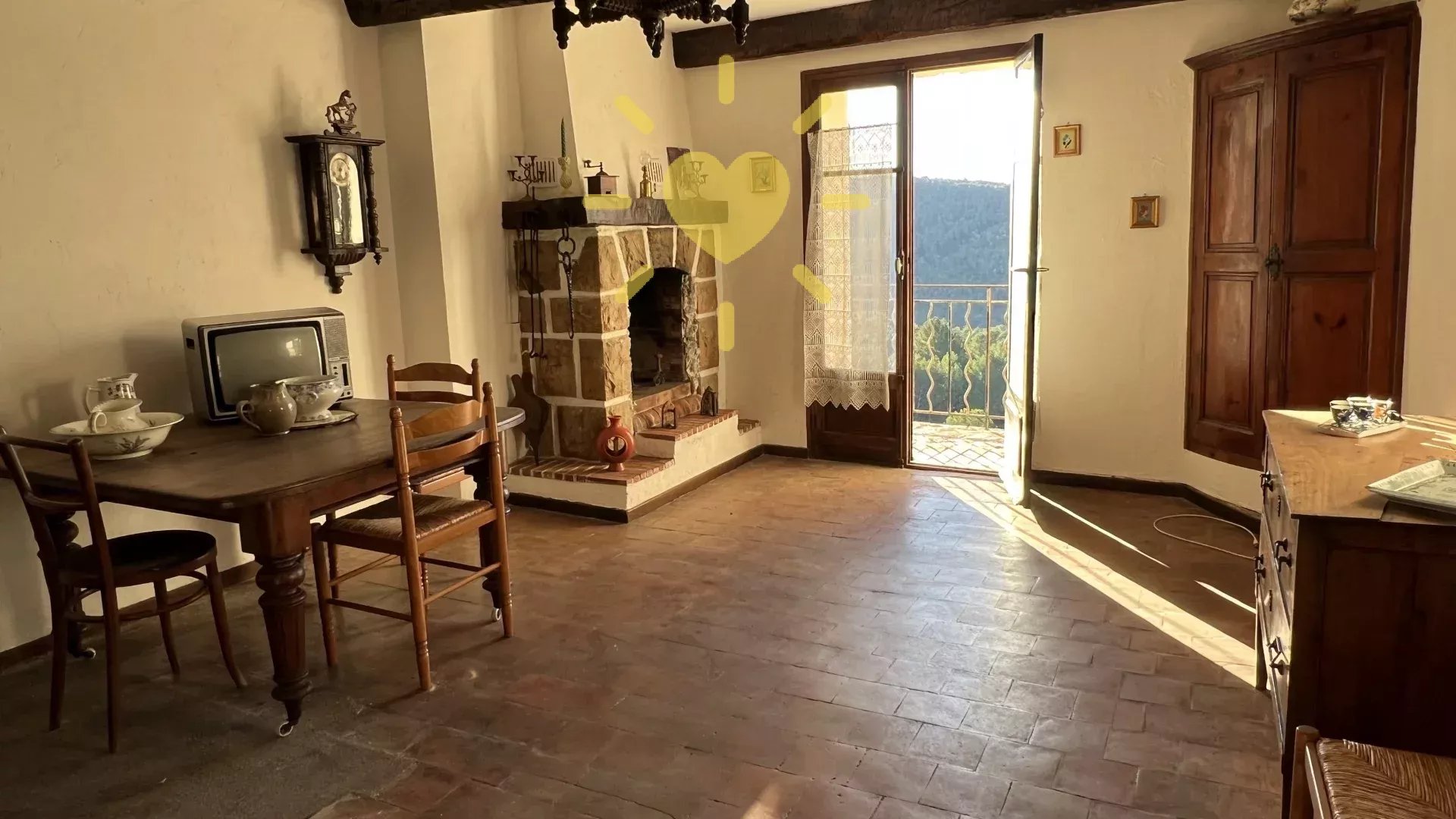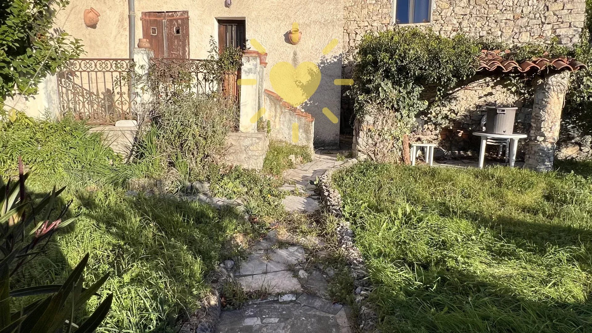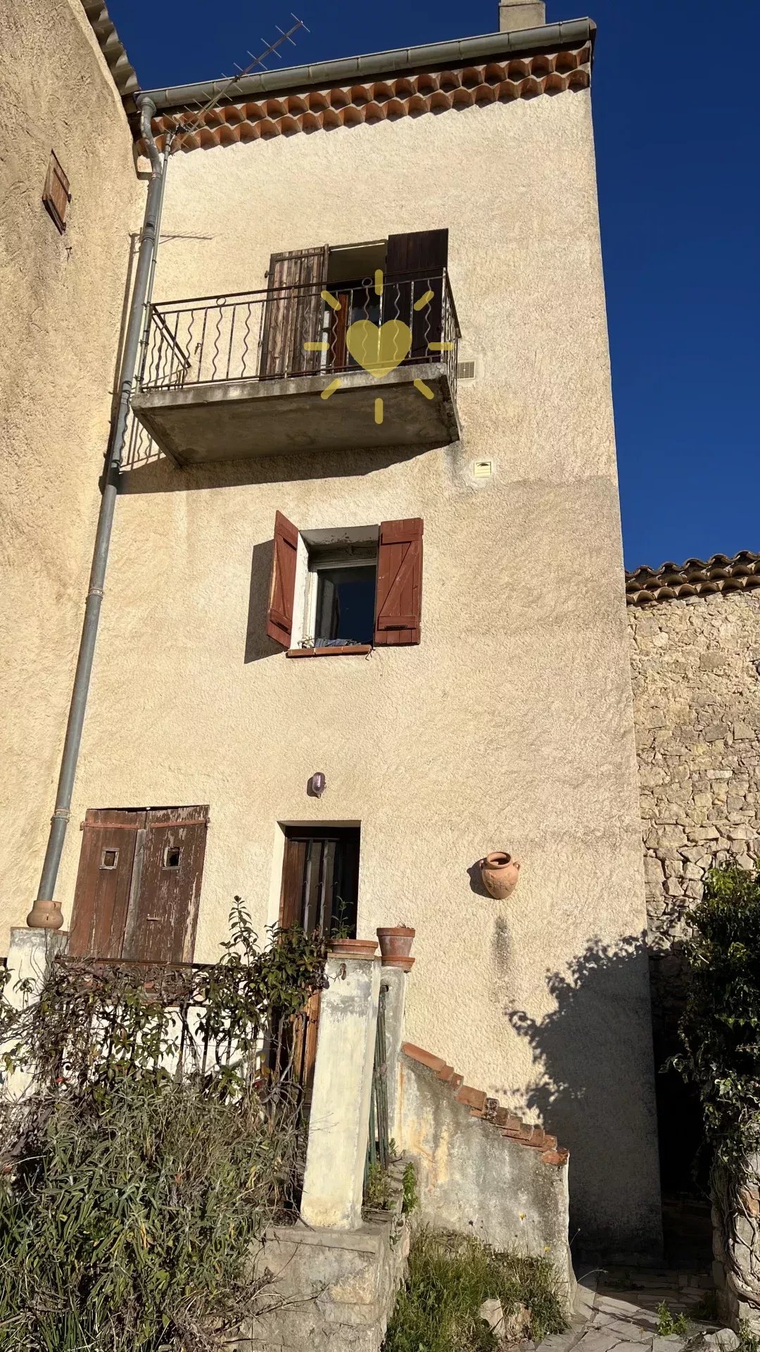 Dans une maison de village, au rez-de-chaussée, un appartement avec accès privatif comprenant : entrée, cuisine avec coin repas, salon avec cheminée et balcon, chambre, salle d'eau, WC indépendant. A l'étage : 2 greniers. Remise en sous-sol. Rez-de-jardin : un studio indépendant avec un séjour/cuisine donnant sur terrasse, une salle d'eau WC. Jardin de 250 m2. Vue panoramique, exposition Sud, au calme. Travaux à prévoir.