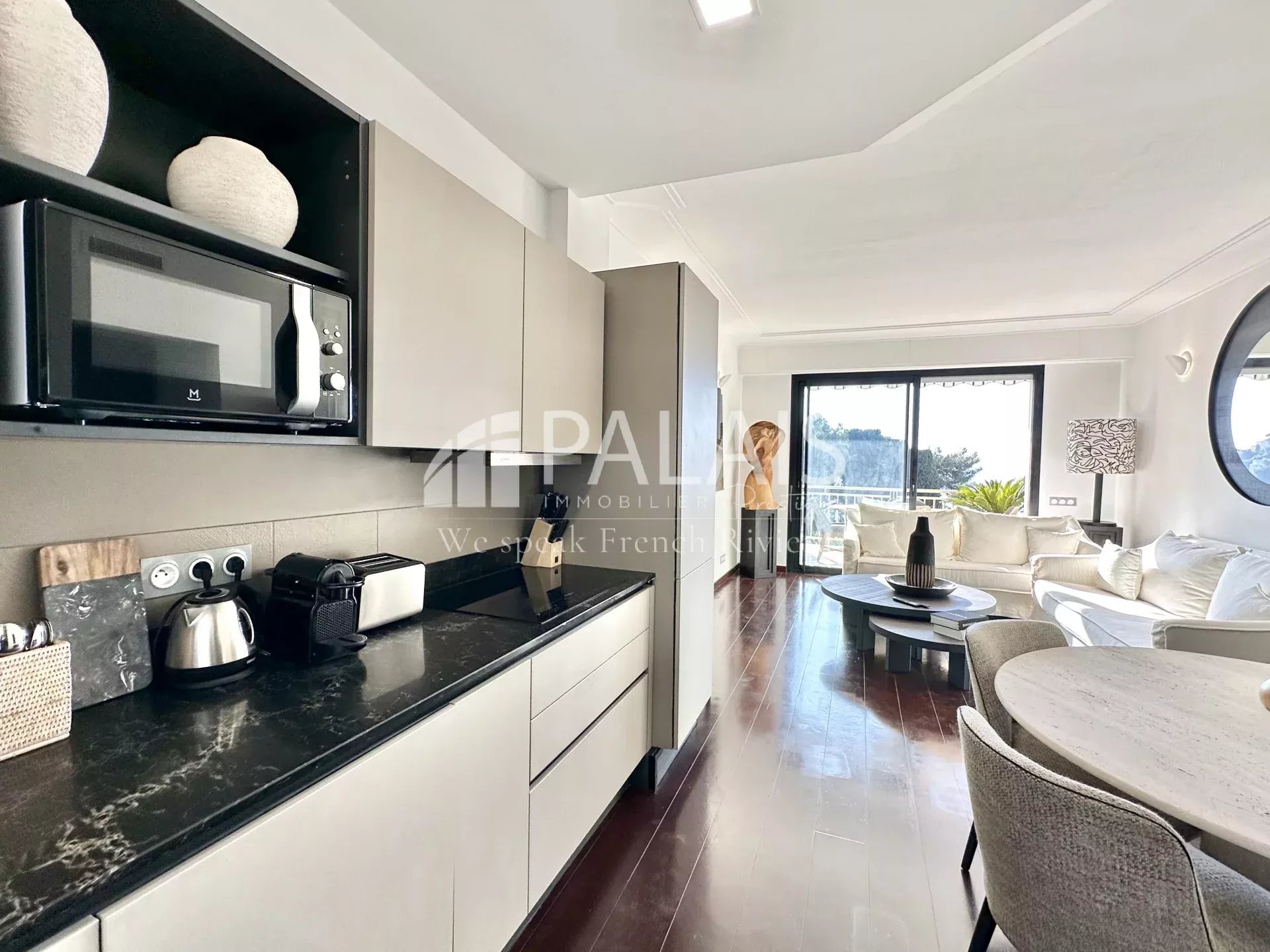 Dans le quartier, très recherché du port de Nice, Boulevard Franck Pilatte, dans l'une des résidences de standing avec gardien, piscine d'eau de mer et tennis, venez découvrir ce beau trois-pièces, entièrement rénové et vendu meublé, au calme jouissant d'une vue dégagée sur la Mer et la Réserve.