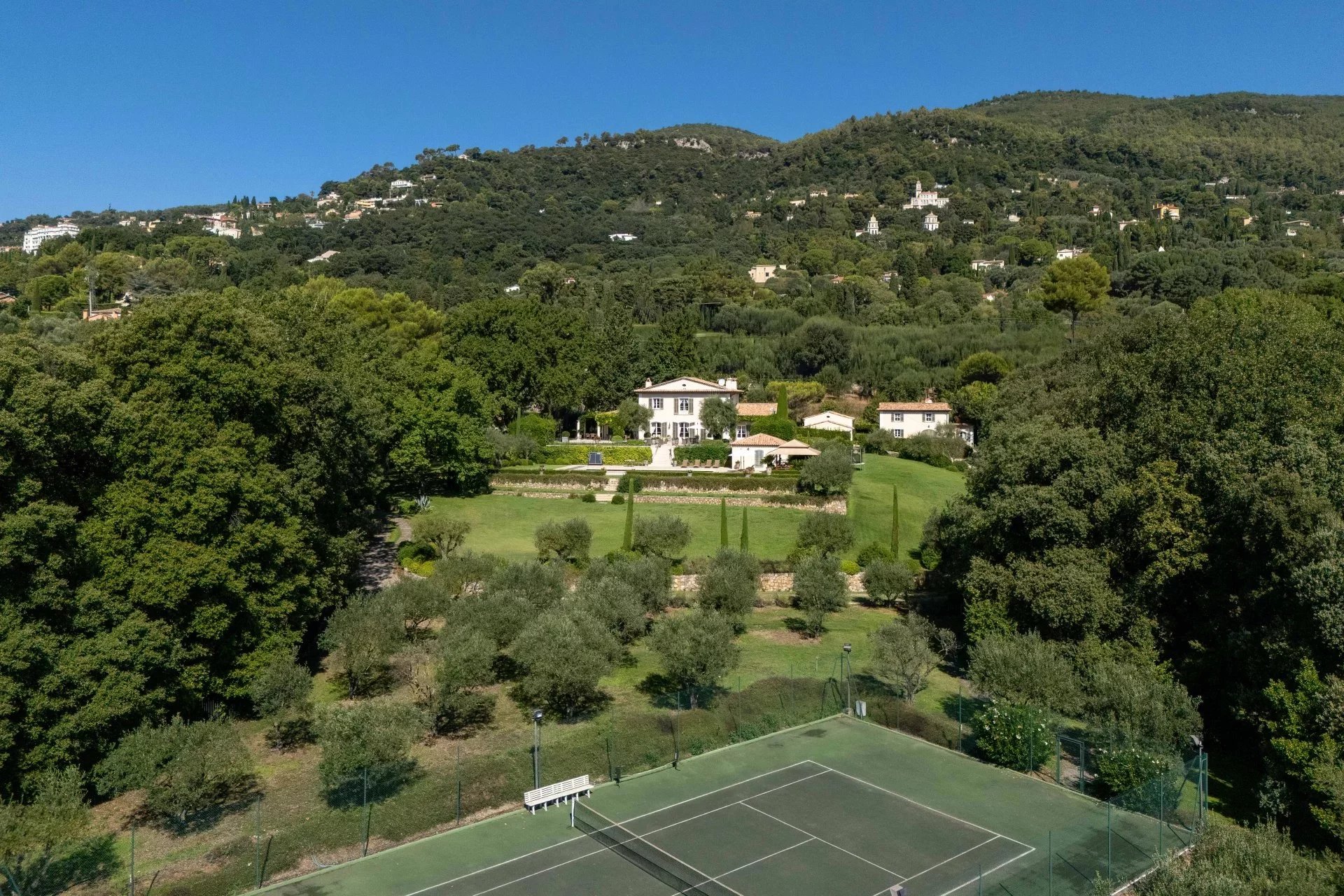 Nichée au cœur du quartier résidentiel paisible et prisé de Grasse Saint-Mathieu, cette propriété d’exception offre une rare combinaison de discrétion, d’élégance et de confort. Son accès confidentiel ne laisse en rien deviner la splendeur qui se dévoile une fois le portail franchi. Sur un parc paysager d’environ un hectare, un chemin pavé en demi-cercle serpente entre les jardins soignés et un terrain de tennis green-set éclairé, menant à une bastide aixoise raffinée idéalement située en position dominante. Exposée plein sud / sud-est, la bastide offre une vue dégagée sur le jardin, la grande piscine (15x7m) élégante avec son pool-house, et les collines verdoyantes des vallons environnants. La bastide se compose au rez-de-chaussée d’une entrée qui donne sur un salon lumineux avec cheminée, une vaste salle à manger baignée de lumière grâce à ses élégantes portes-fenêtres, une cuisine semi-ouverte avec îlot et arrière cuisine, une grande bibliothèque, une chambre type « master » avec une jolie vue, une grande salle de douche, WC et dressing, un WC invité. À l’étage, trois belles chambres en suite offrent chacune une vue apaisante sur le magnifique paysage. Au niveau R-1 où se trouvent une grande chambre ouvrant sur une terrasse exposée à l’est, une salle de fitness, une buanderie, un espace technique regroupant les installations électriques, domotiques et de sécurité. À l’arrière de la bâtisse principale se trouvent une charmante maison d’amis de type 3 pièces, un logement de service de 2 pièces, deux garages, un local technique, un terrain de pétanque, ainsi qu’une belle cave à vin en pierre de taille – véritable joyau pour les amateurs. Cette demeure très élégante est conçue avec des matériaux nobles et de grande qualité. La surface habitable est de 450 m² environ. Toutes les pièces principales sont climatisées. La toiture ainsi que les gouttières en cuivre ont été entièrement refaites en 2023/2024. La propriété est équipée d’un système d’alarme et d’une clôture électrique de haute performance, garantissant tranquillité et sécurité.