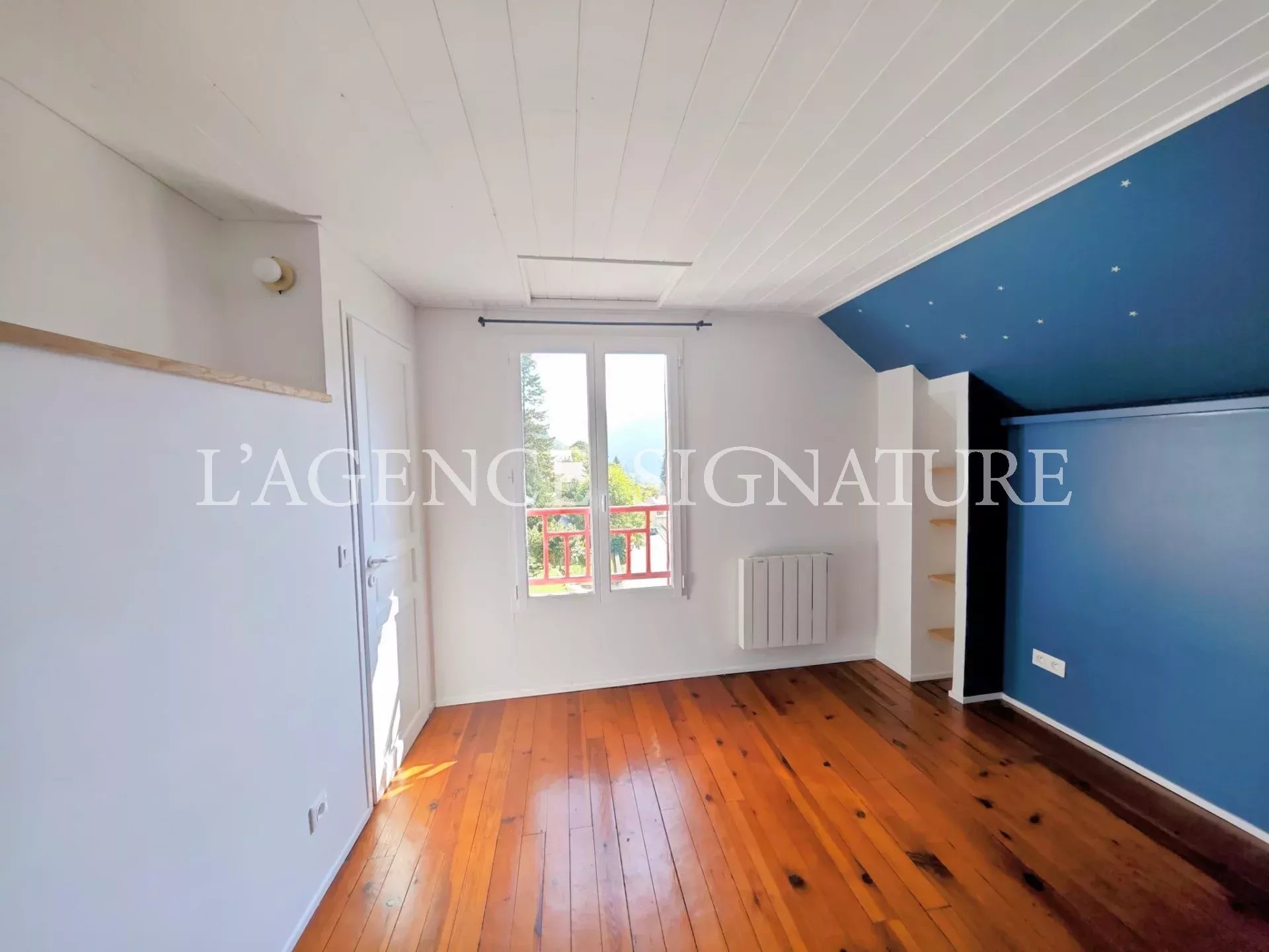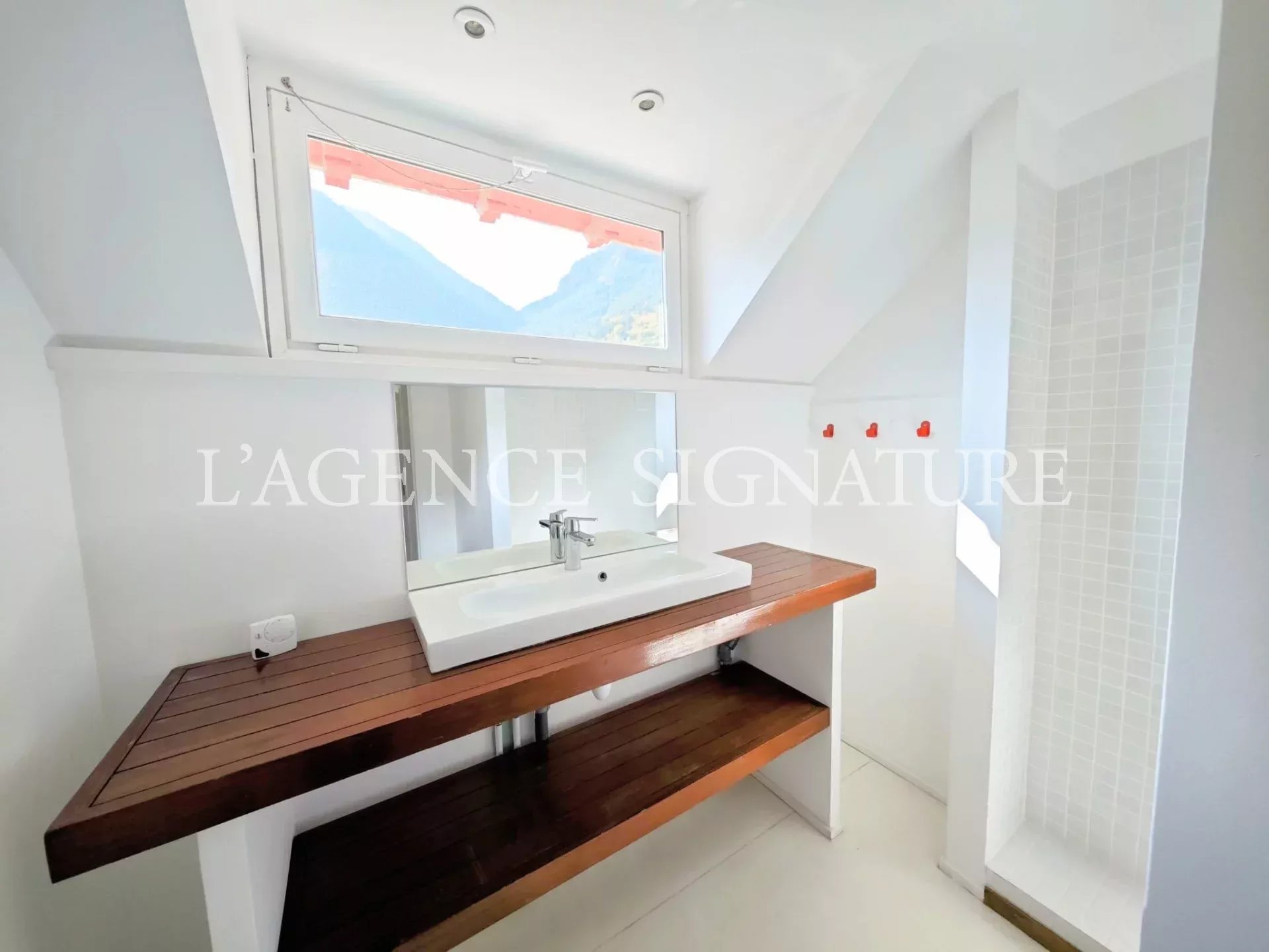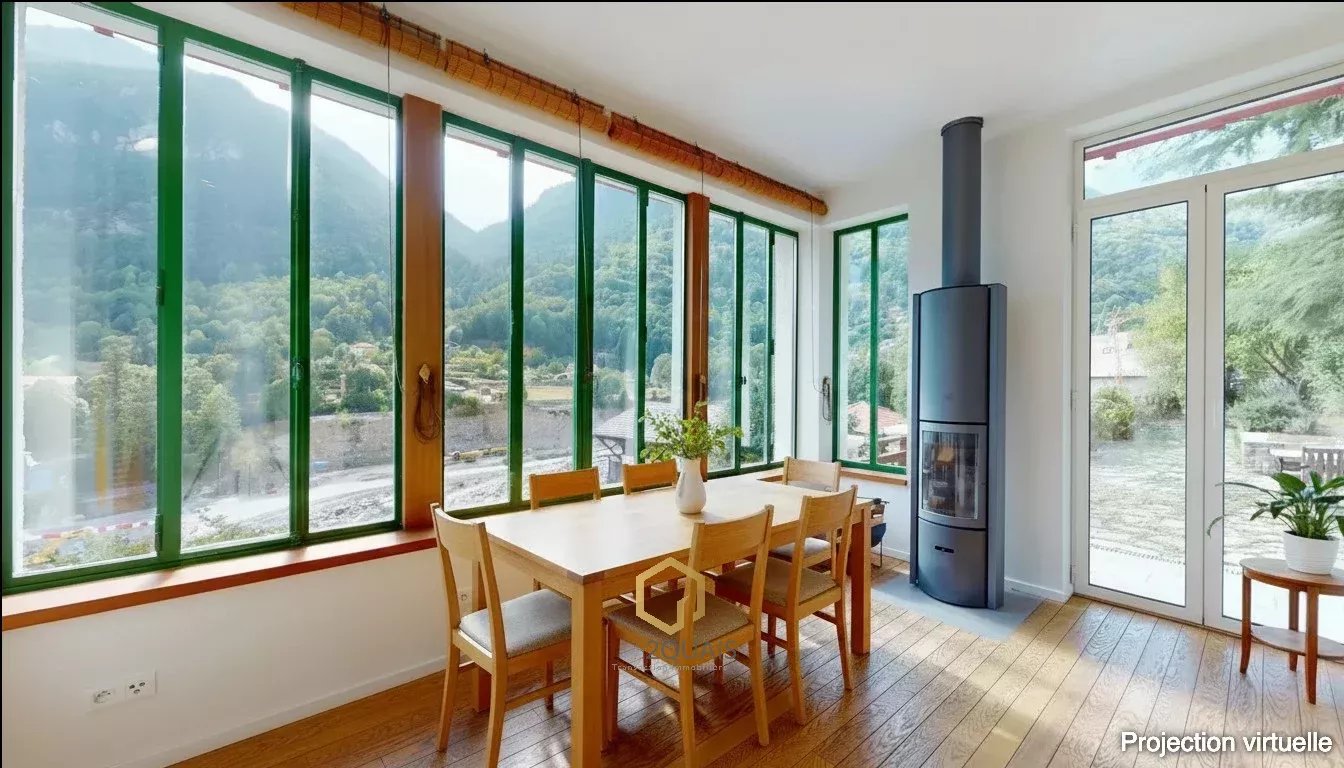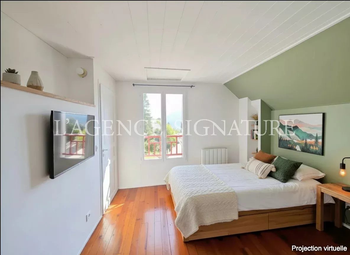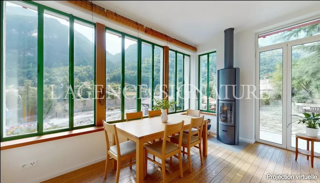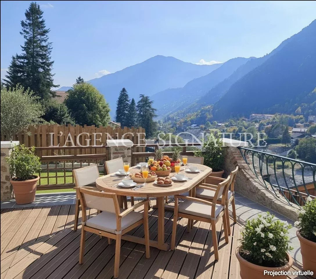• 1er étage : séjour, cuisine américaine ouverte sur la salle à manger avec vue dégagée sur les montagnes, deux immenses terrasses et un jardin, WC indépendants.