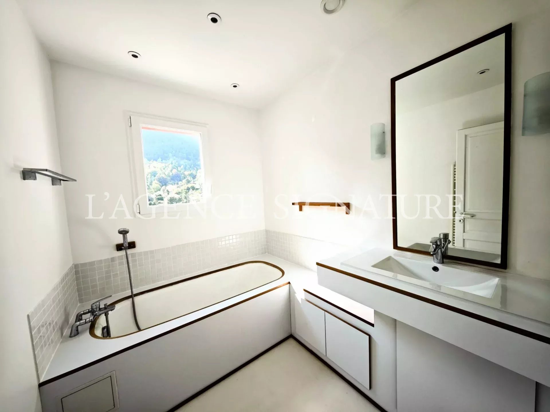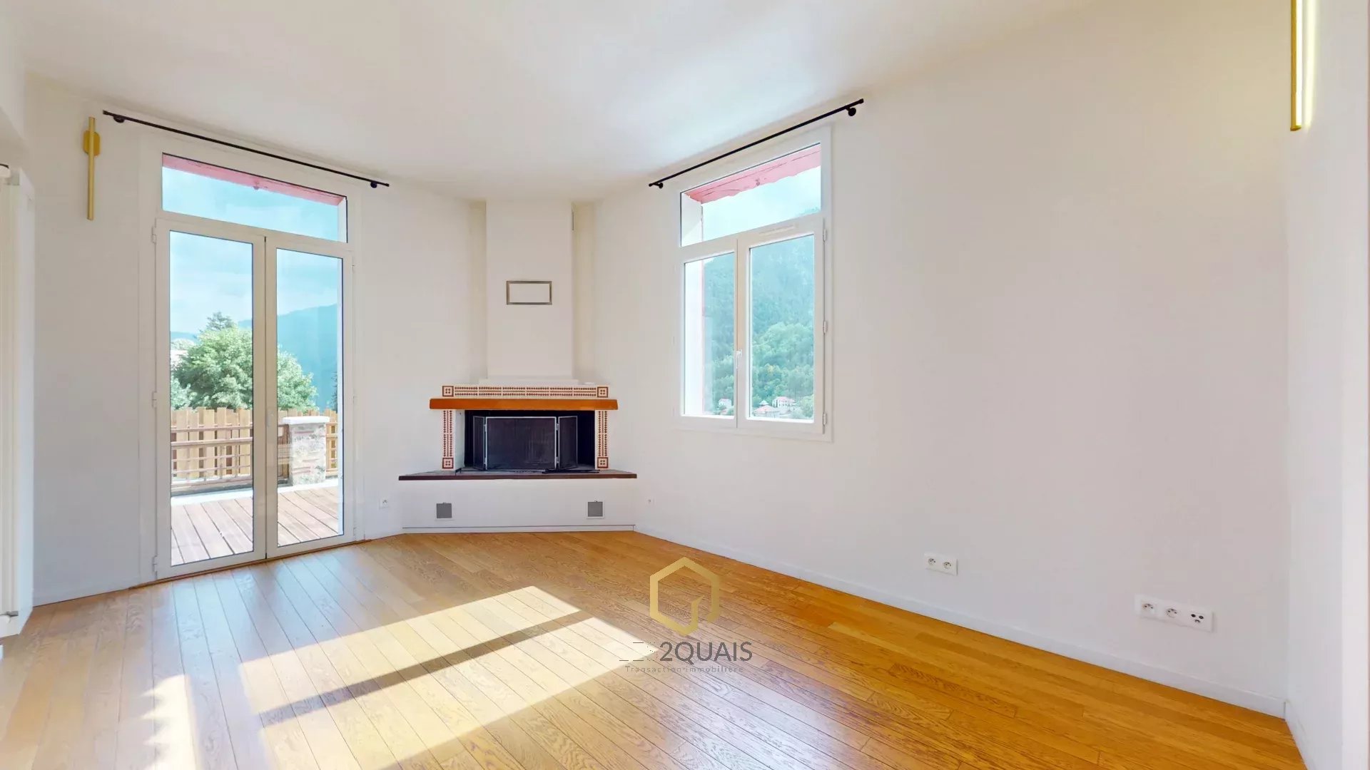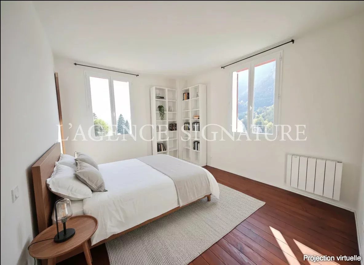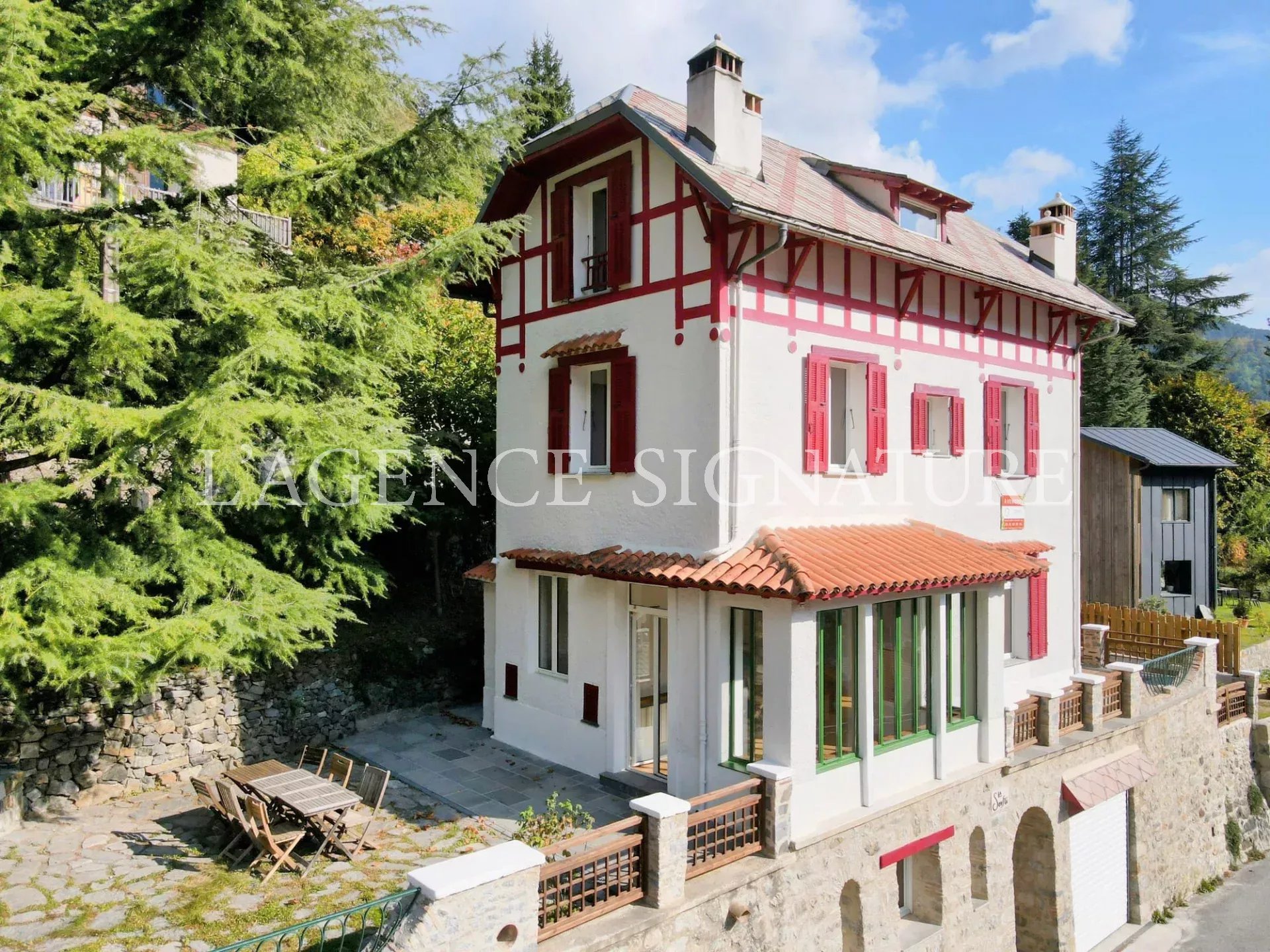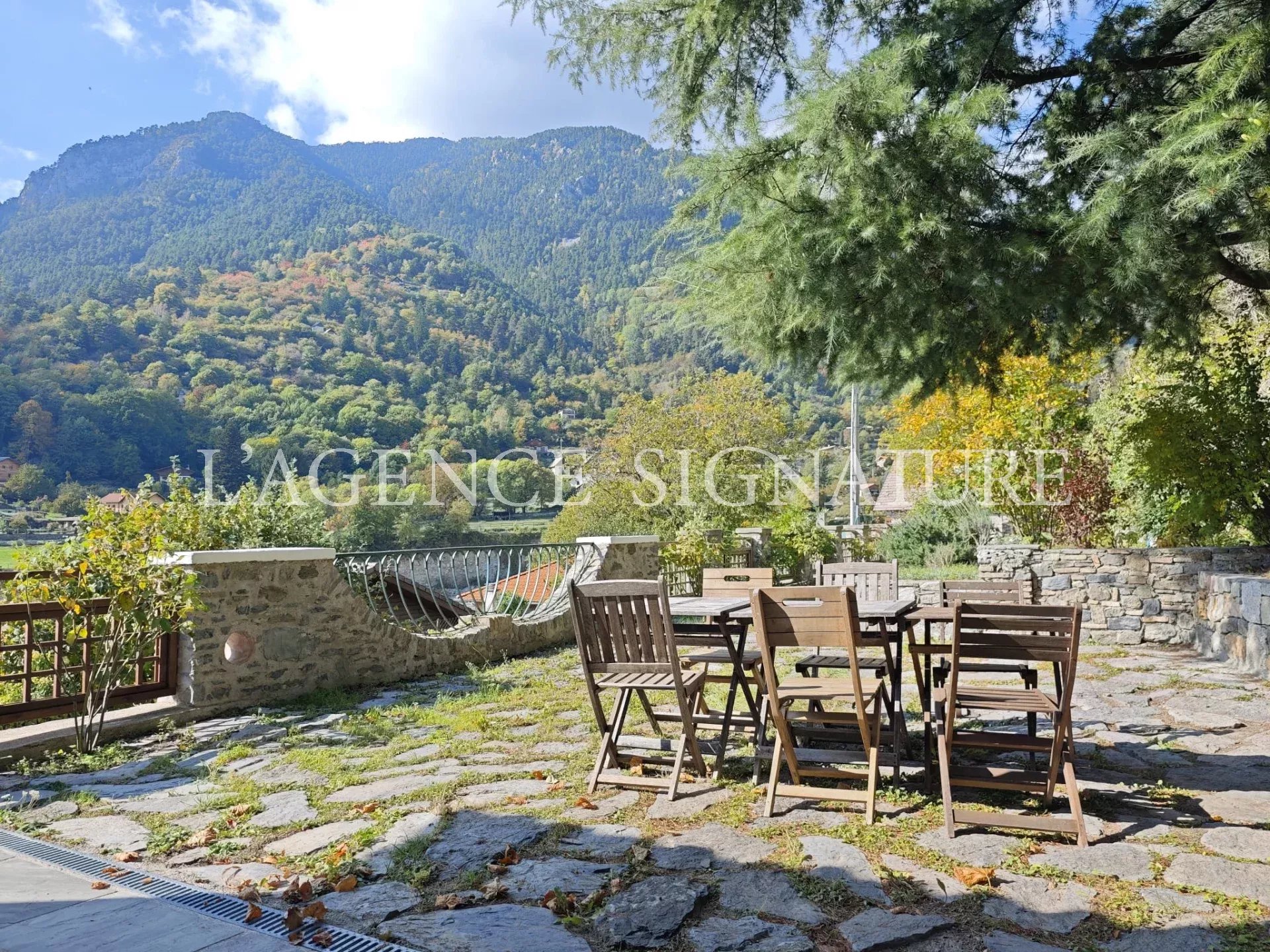 • 1er étage : séjour, cuisine américaine ouverte sur la salle à manger avec vue dégagée sur les montagnes, deux immenses terrasses et un jardin, WC indépendants.