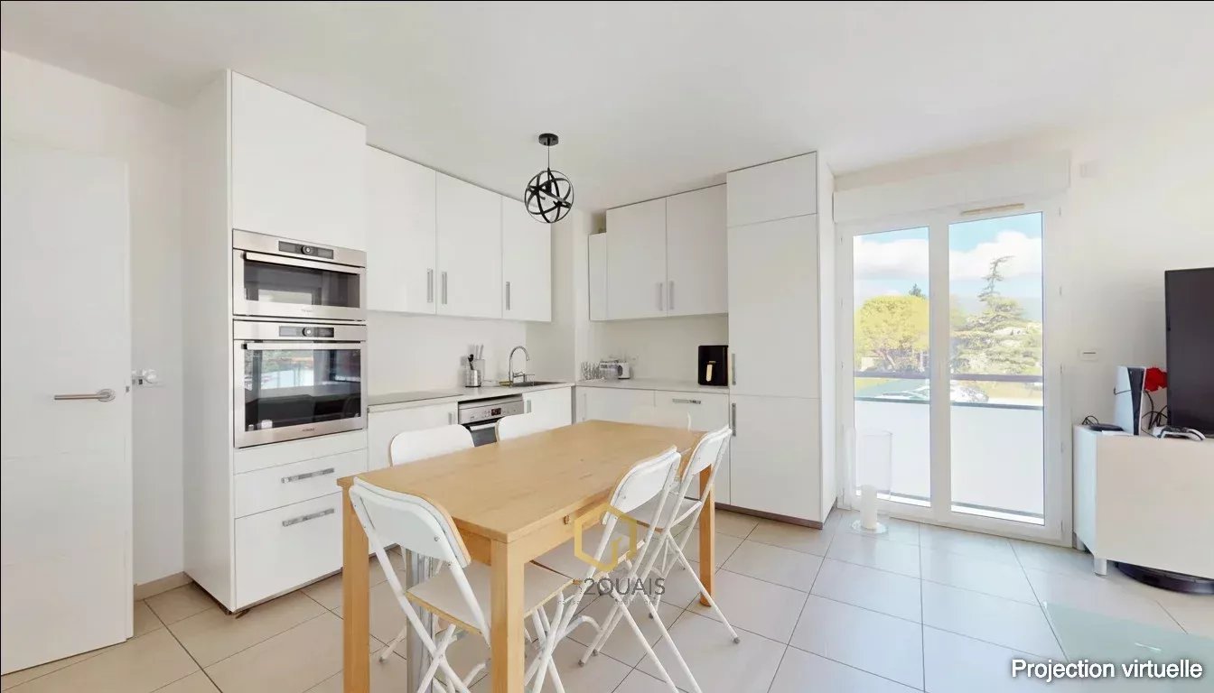 La cuisine entièrement aménagée et équipée est ouverte sur le séjour créant un espace de vie convivial de 25m2, ouvrant sur une spacieuse terrasse, idéale pour vos moments de détente.