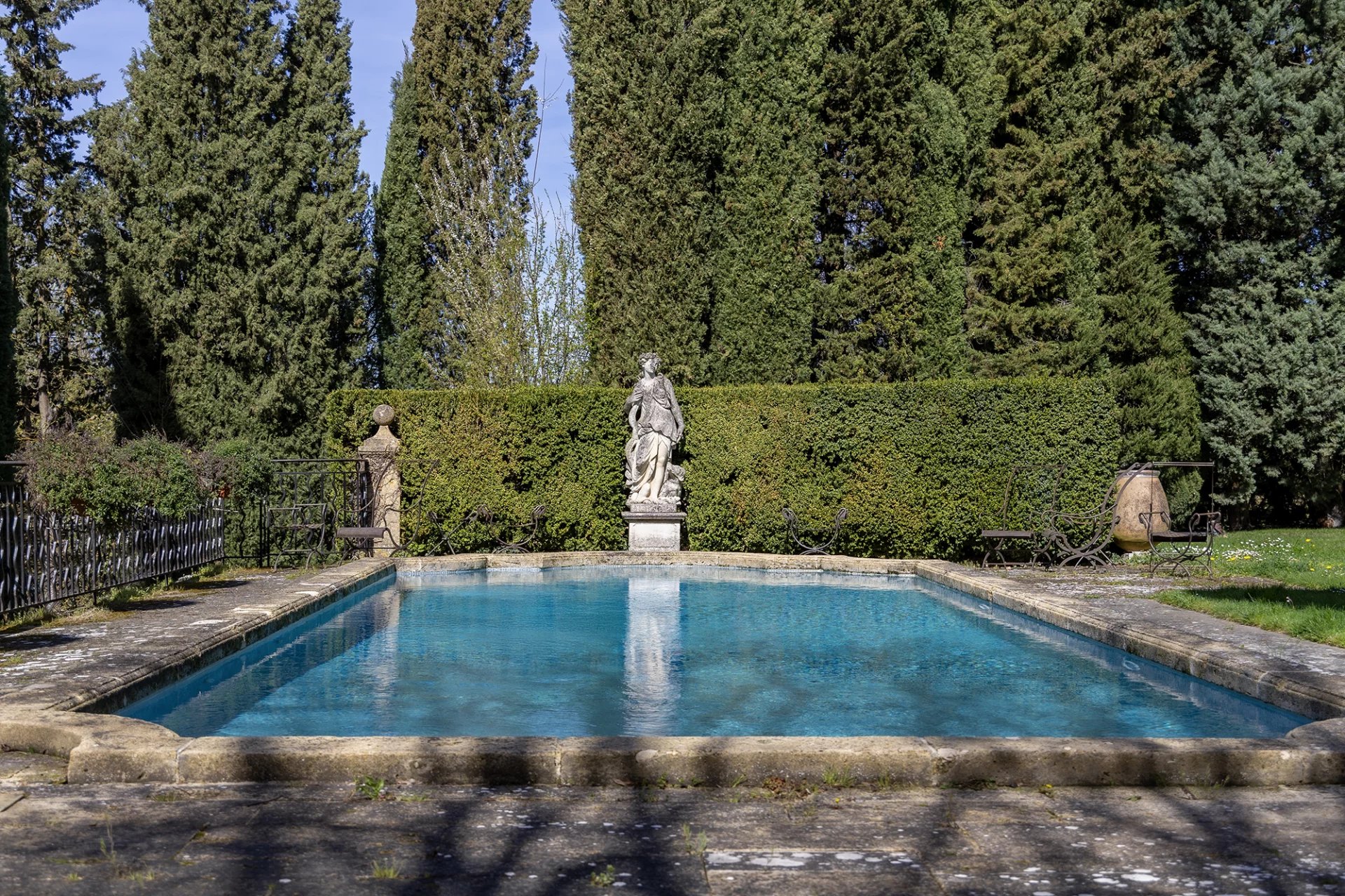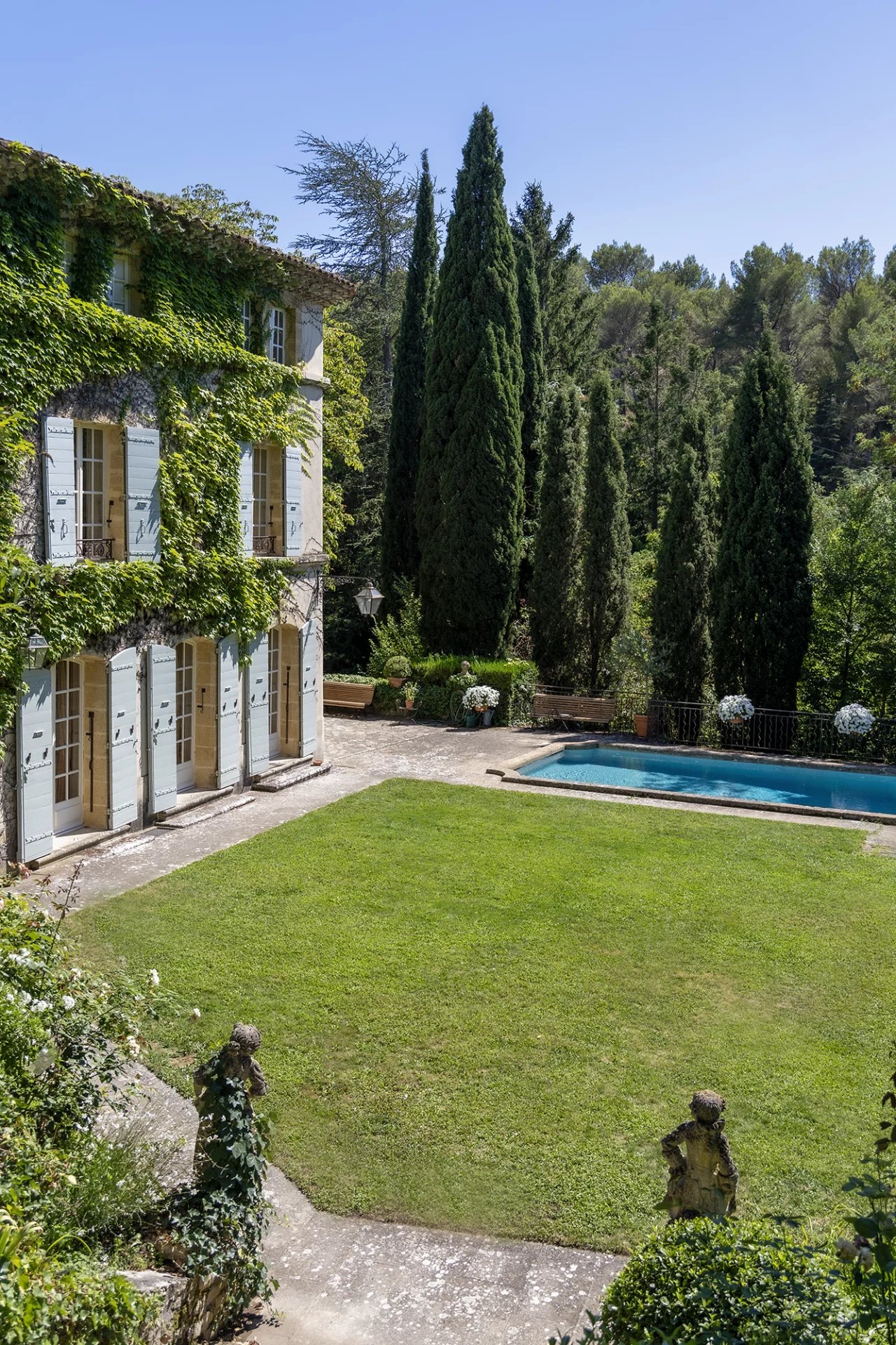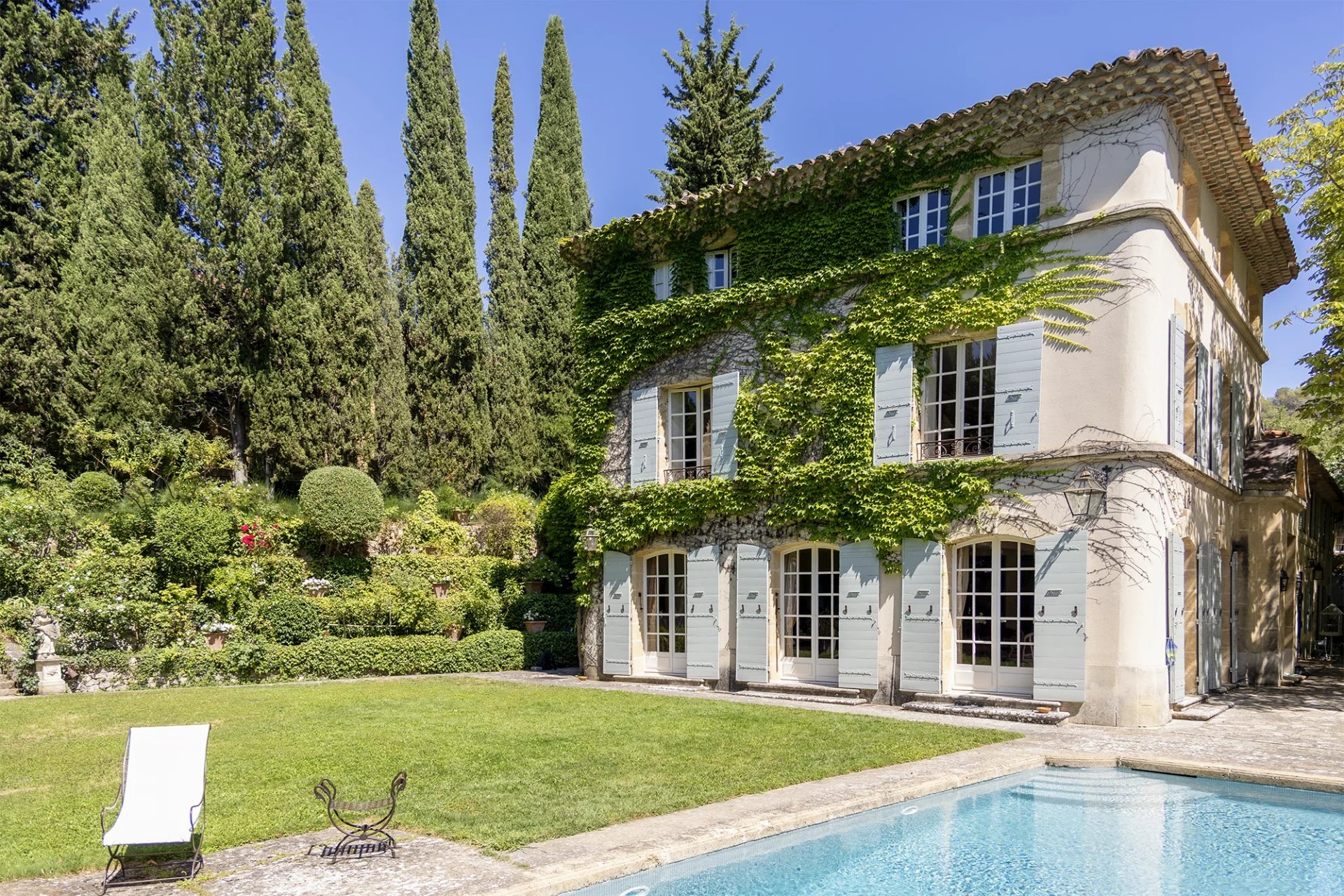 À moins de dix minutes du Cours Mirabeau (4 km), La Grange s'ouvre sur 4,5 hectares de nature soignée : une oliveraie, des fontaines, des statues couvertes de végétation, une chapelle, deux piscines et un court de tennis. L'ensemble respire la sérénité d'une Provence encore authentique, telle qu'aimaient la peindre Cézanne et ses héritiers.