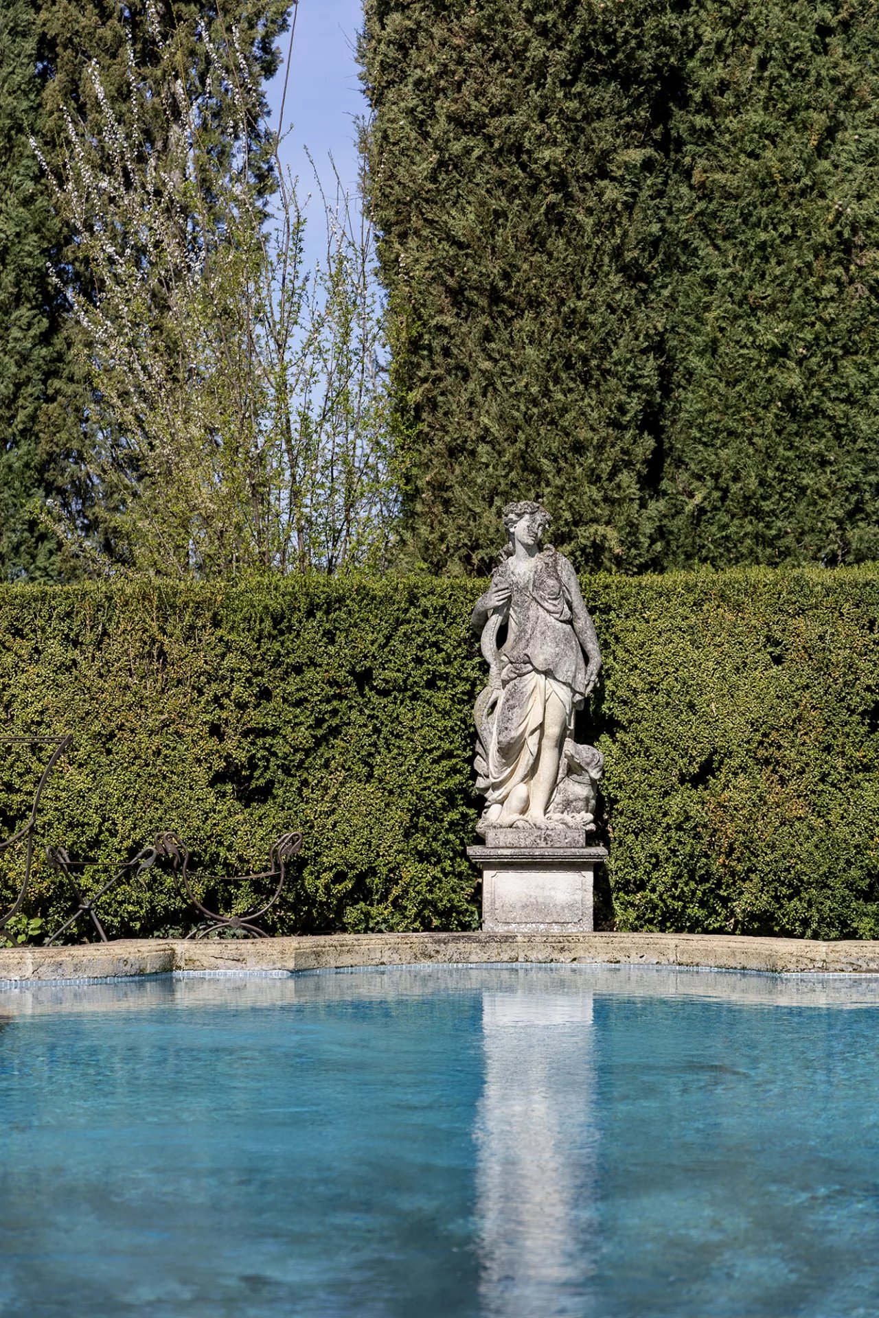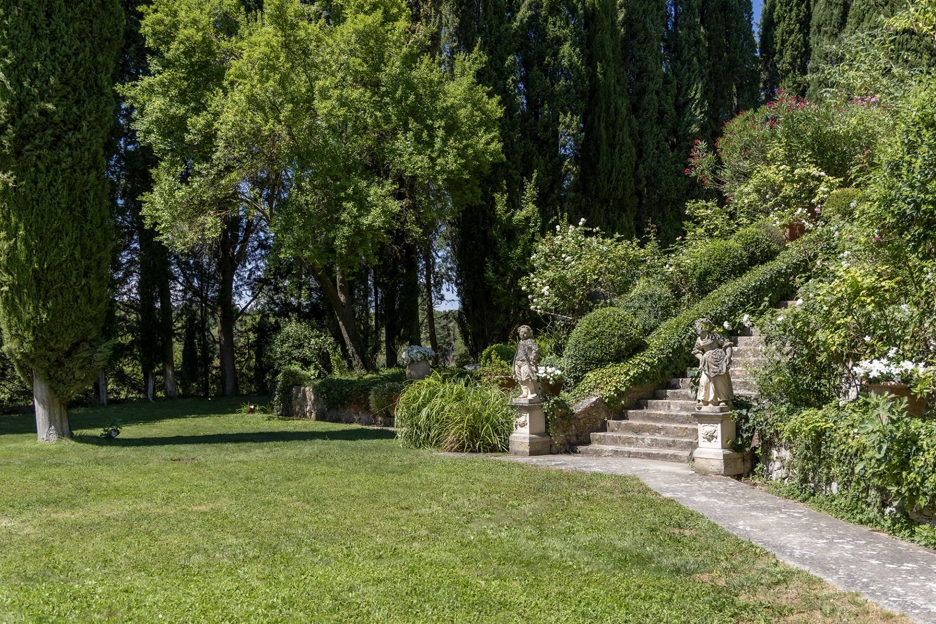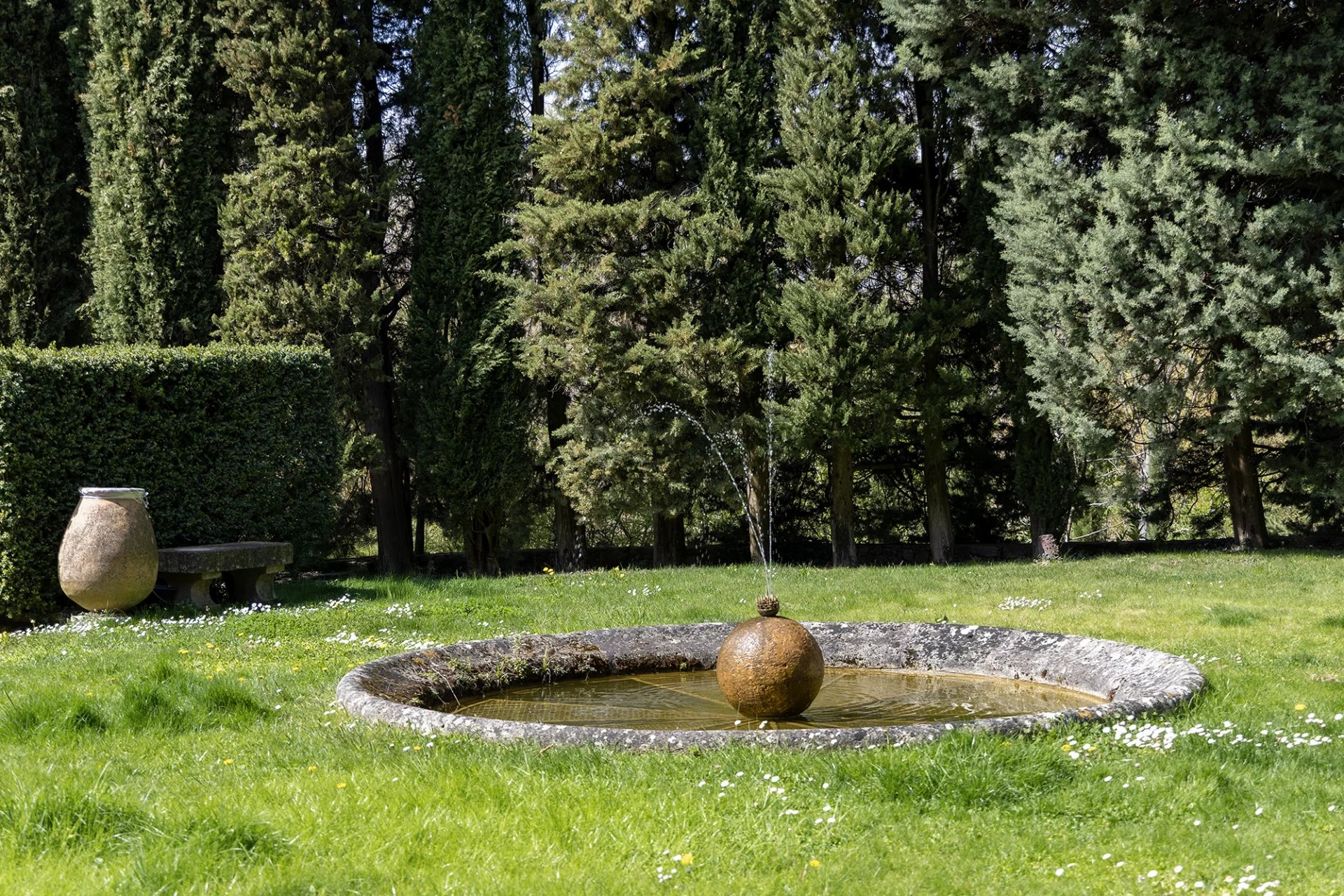 À moins de dix minutes du Cours Mirabeau (4 km), La Grange s'ouvre sur 4,5 hectares de nature soignée : une oliveraie, des fontaines, des statues couvertes de végétation, une chapelle, deux piscines et un court de tennis. L'ensemble respire la sérénité d'une Provence encore authentique, telle qu'aimaient la peindre Cézanne et ses héritiers.