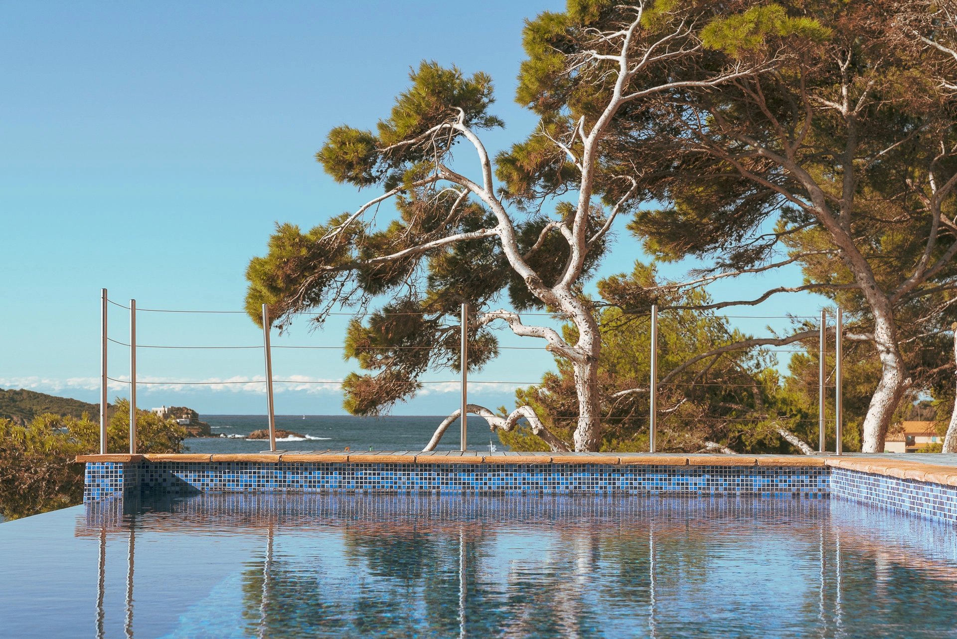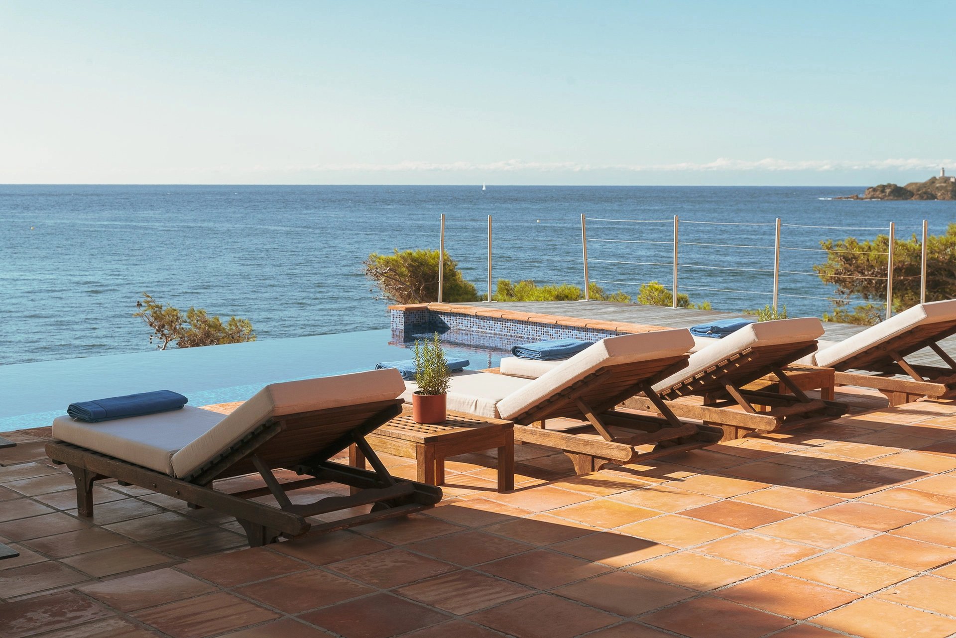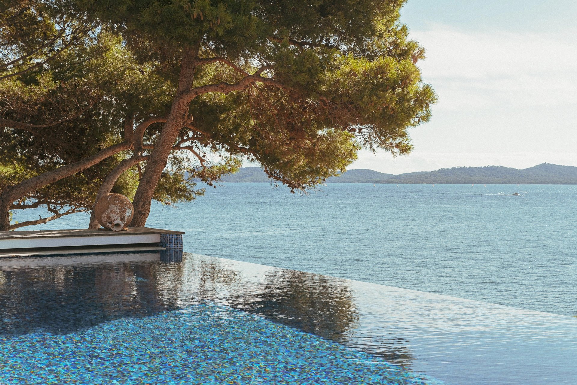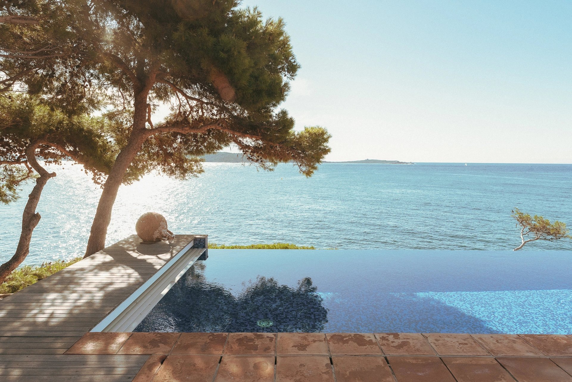 La piscine à débordement dont la simple vue évoque déjà un sentiment de plénitude, se confond avec la mer bleu azur face à l’île de Porquerolles, propice au bonheur et au bien-être.
