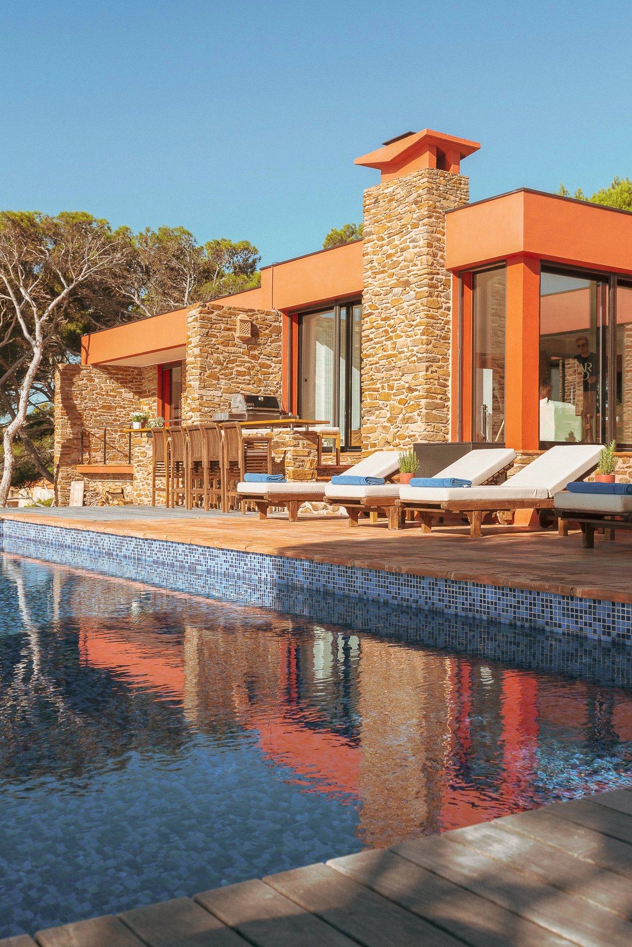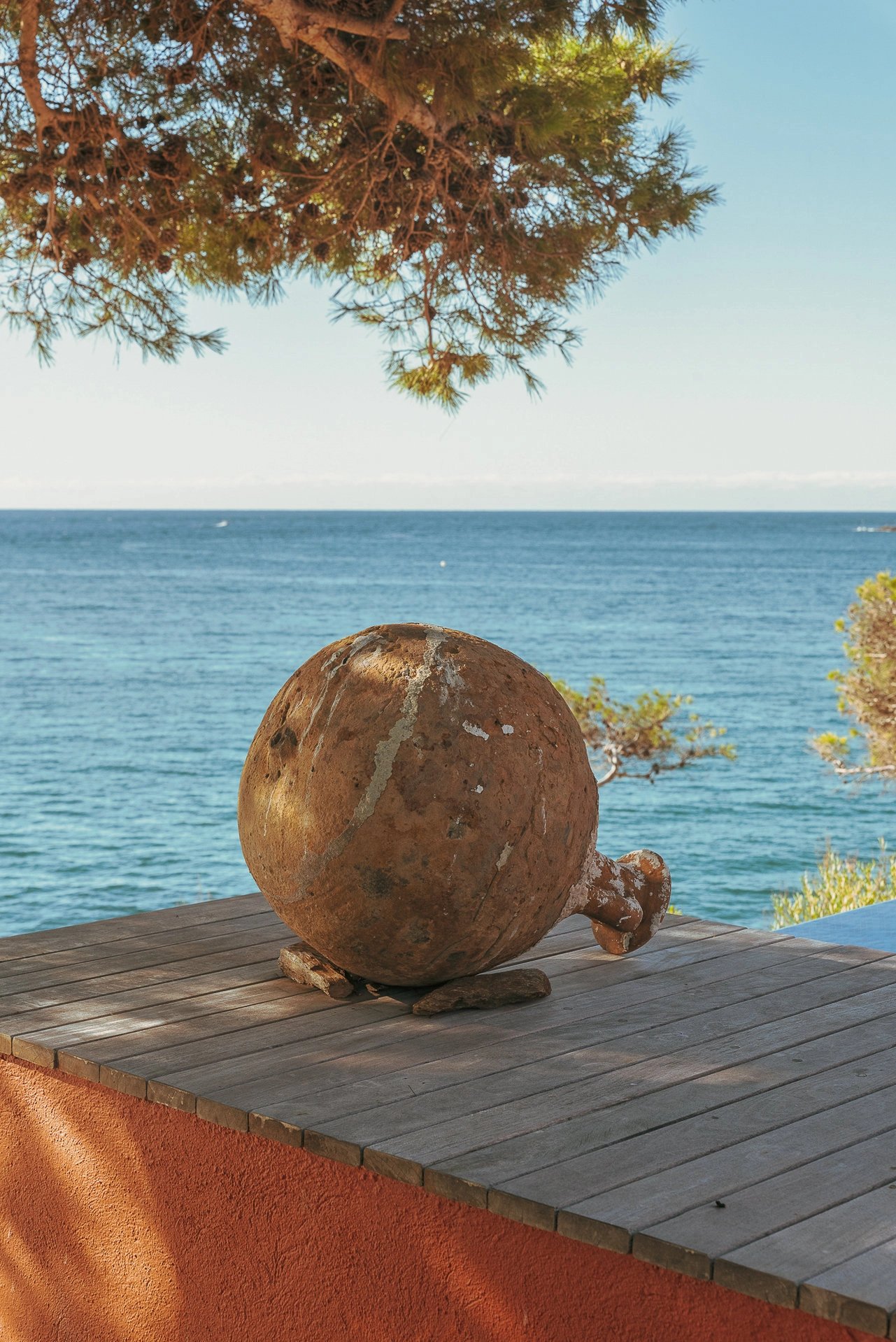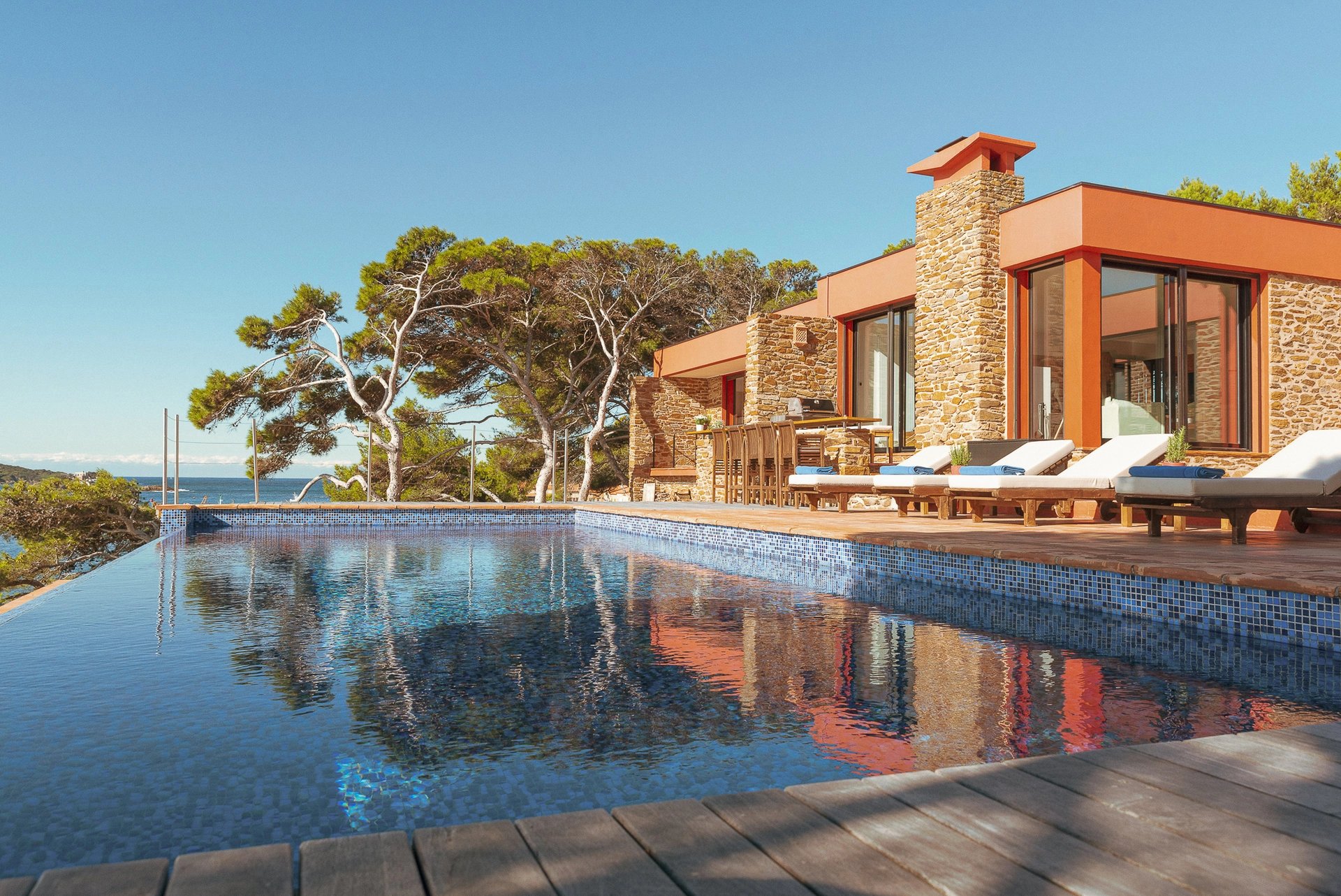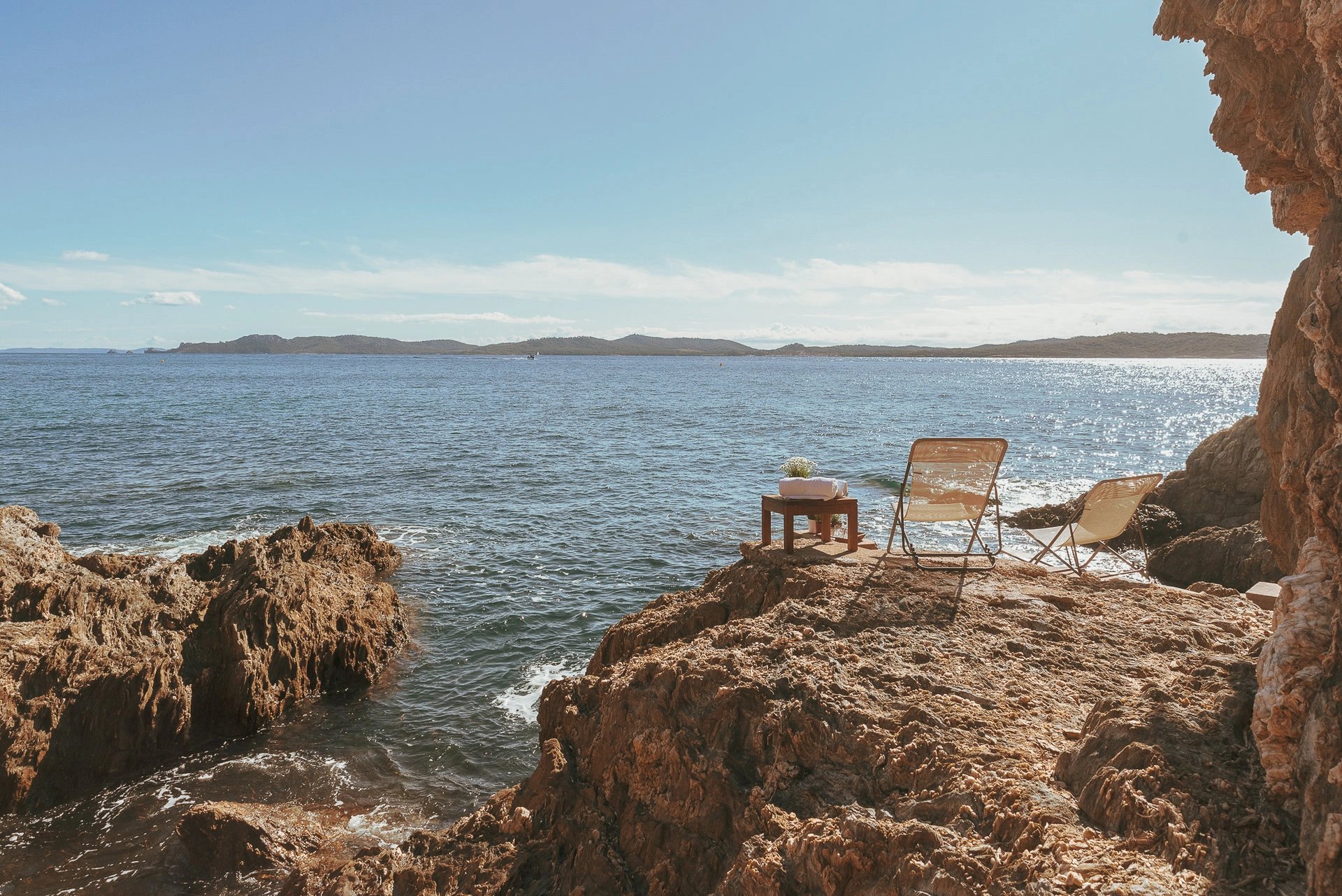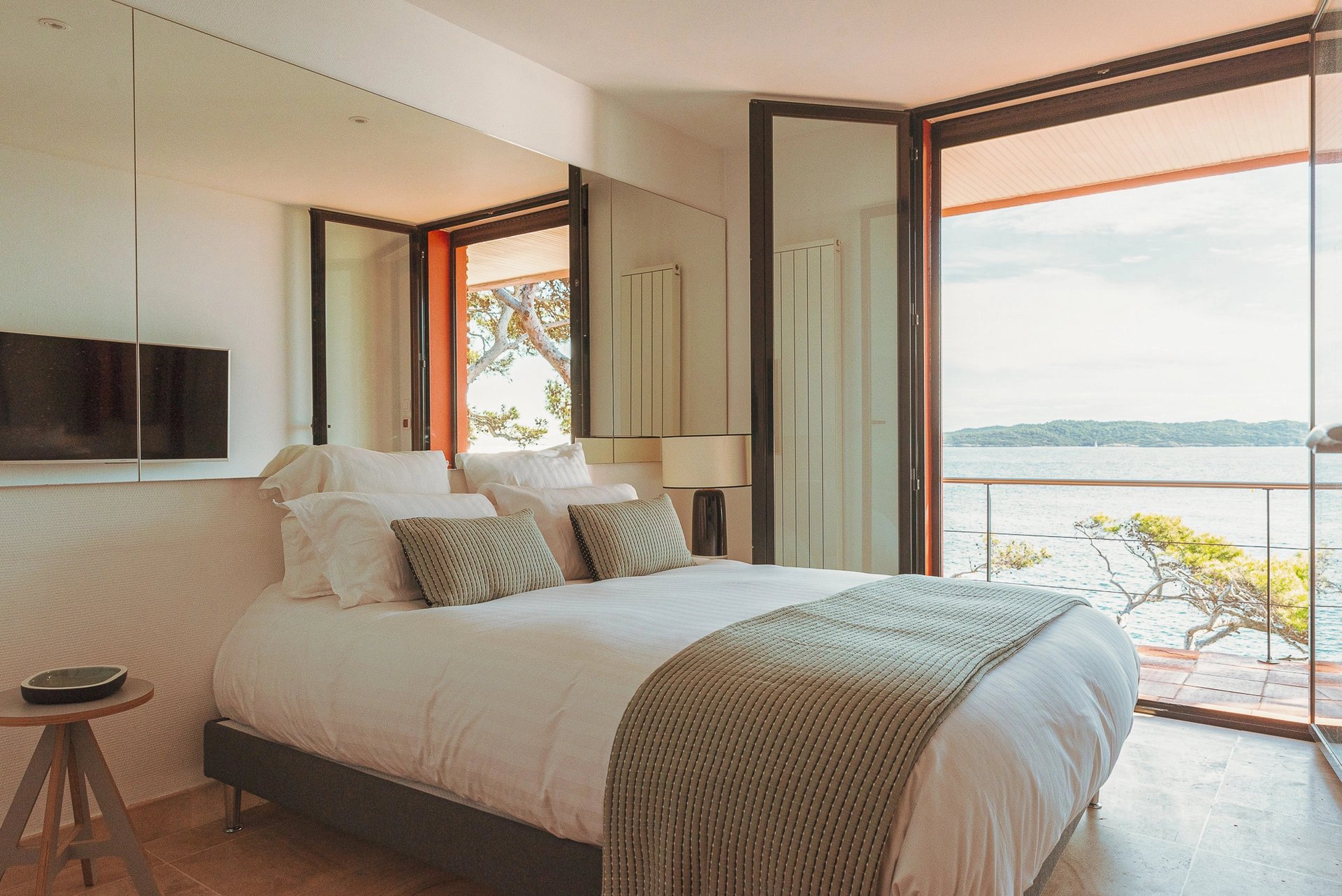 La piscine à débordement dont la simple vue évoque déjà un sentiment de plénitude, se confond avec la mer bleu azur face à l’île de Porquerolles, propice au bonheur et au bien-être.