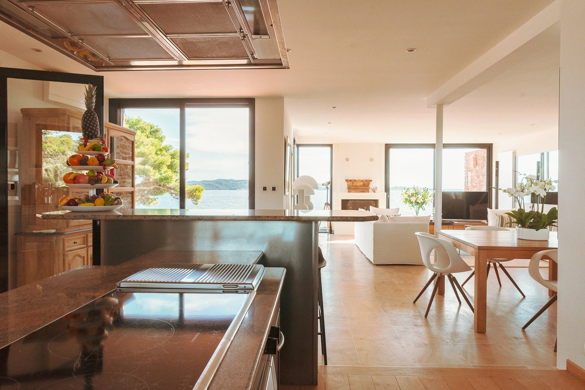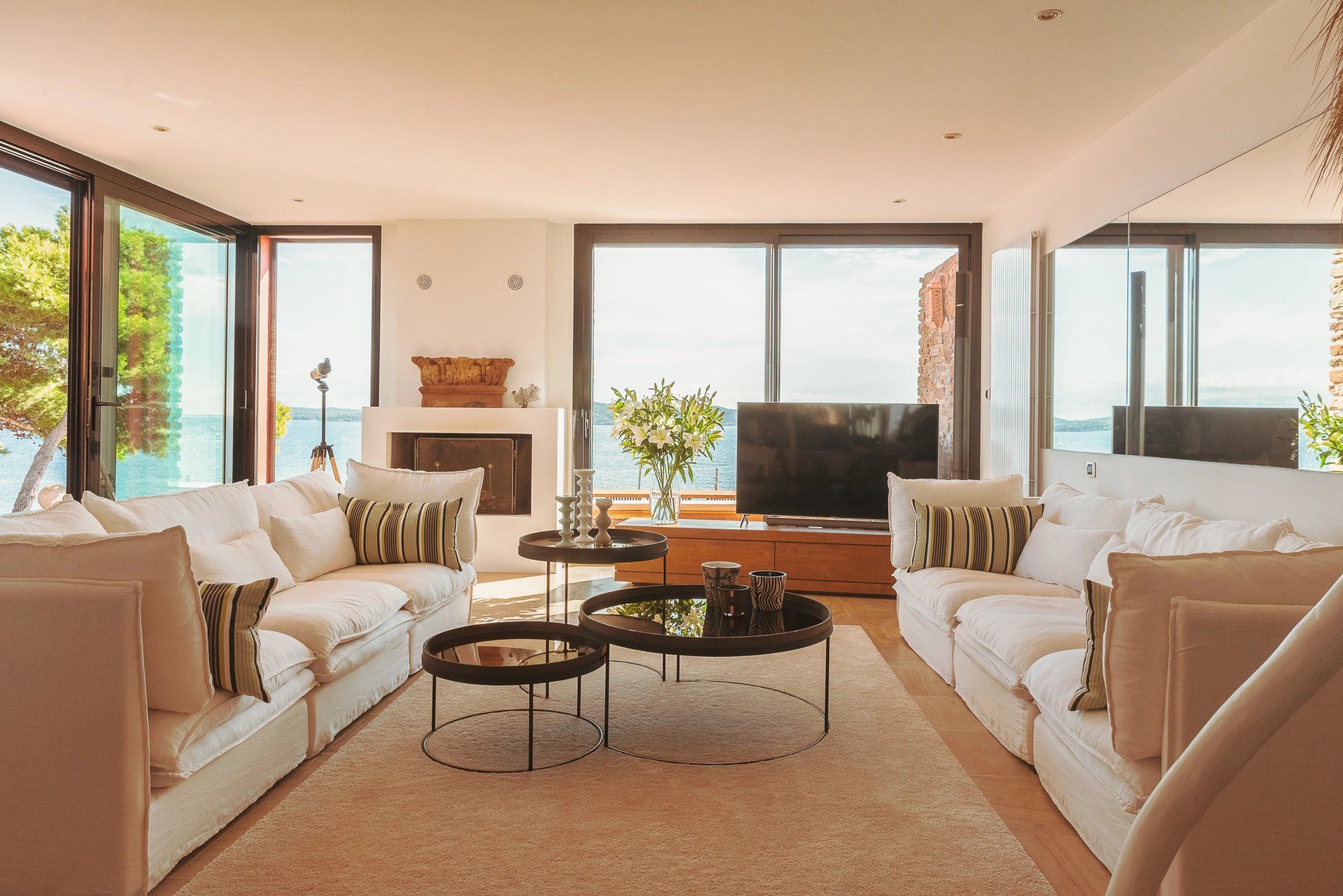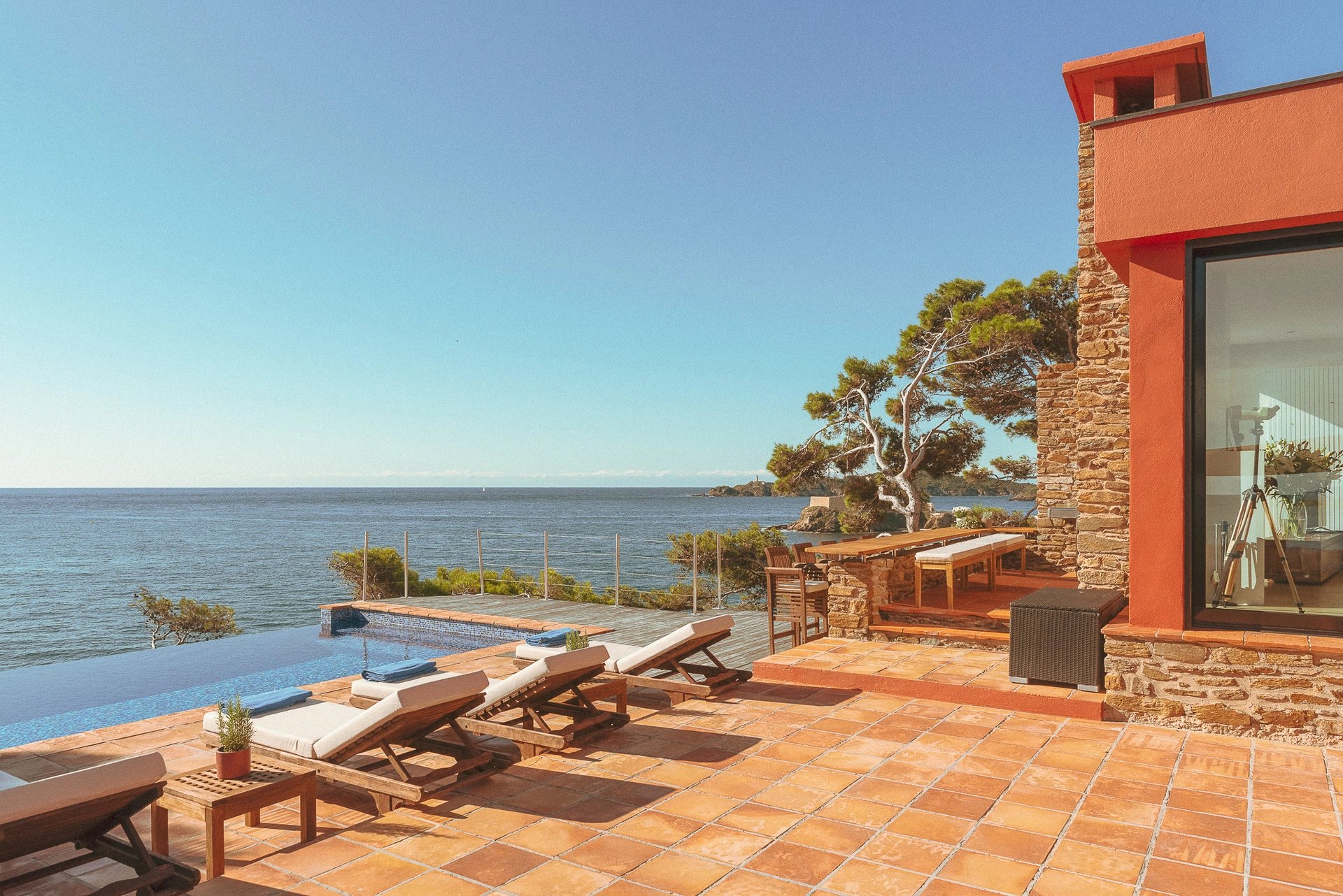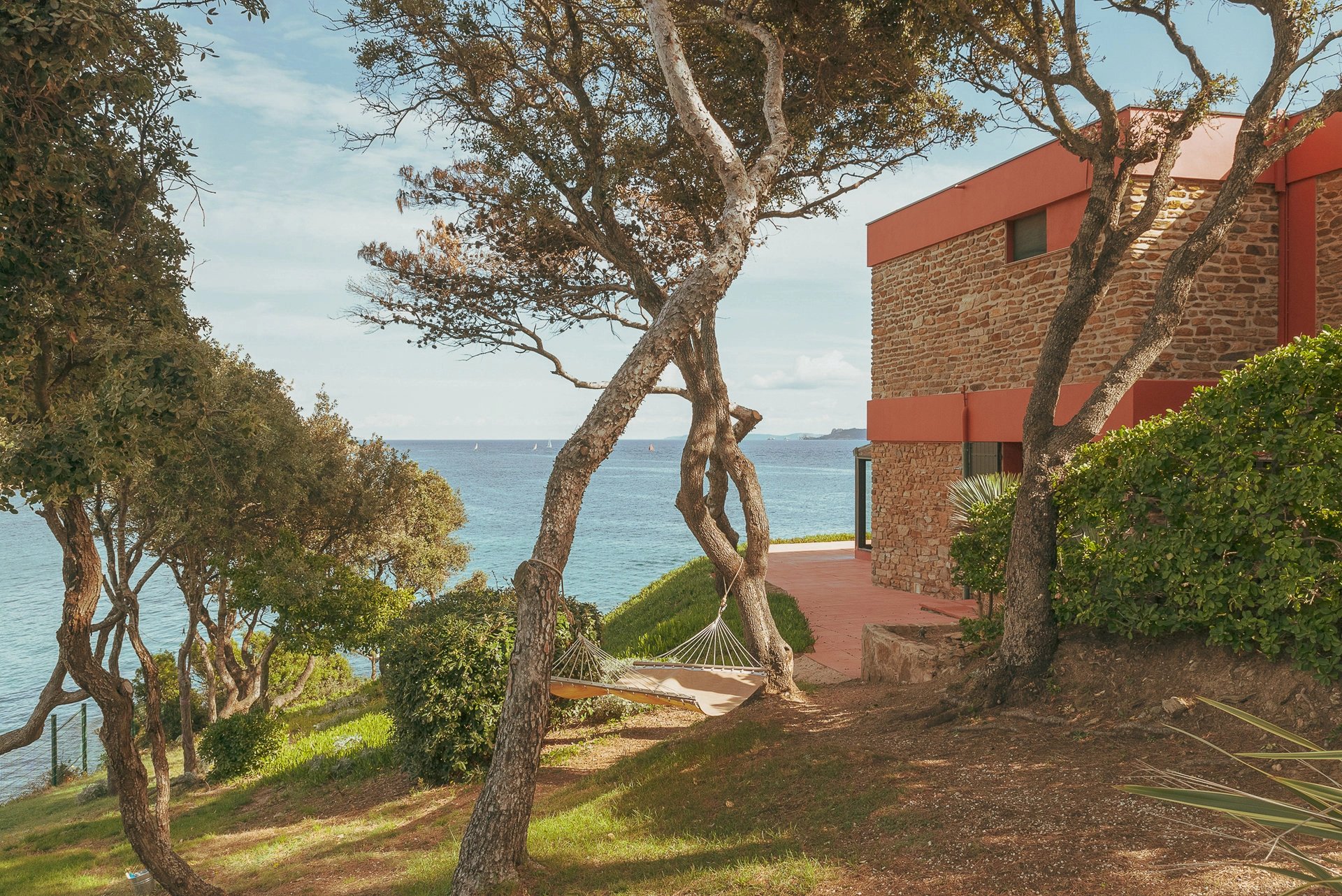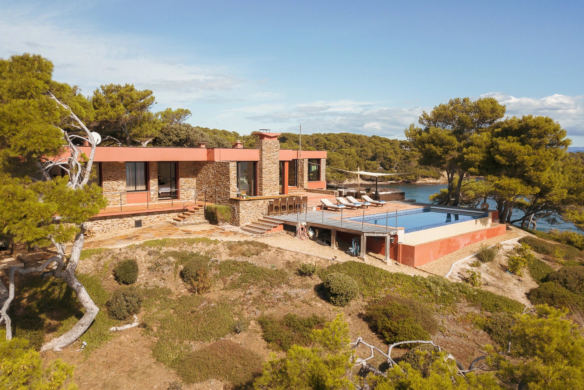 Bordée par la méditerranée, à l’abri du mistral et des regards, la villa Éole bénéficie d’une situation exceptionnelle qui permet de profiter du soleil tout au long de la journée. Les espaces extérieurs et intérieurs sont largement ouverts sur la mer et profitent d’une vue panoramique sur toute la baie et les îles d’Or.