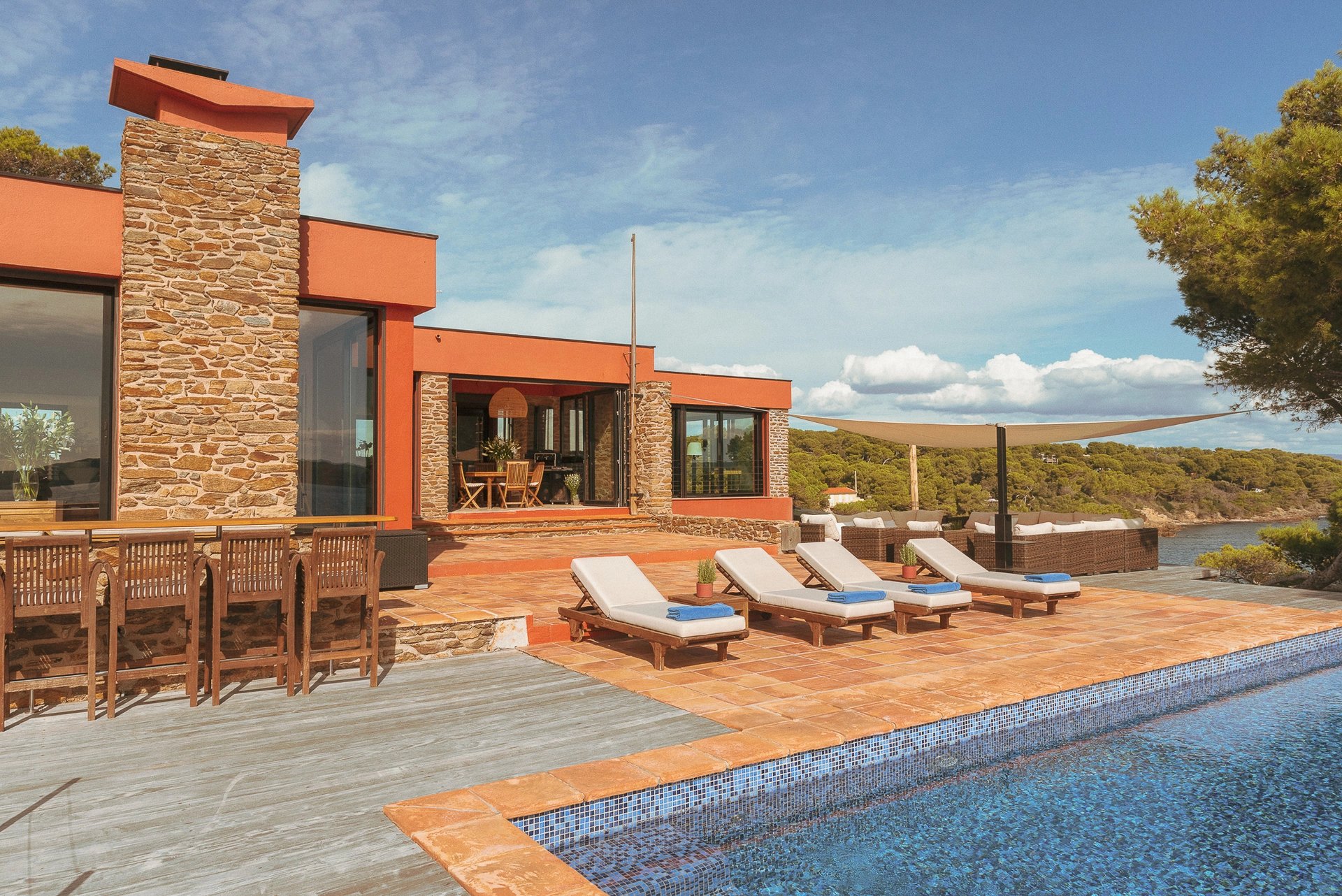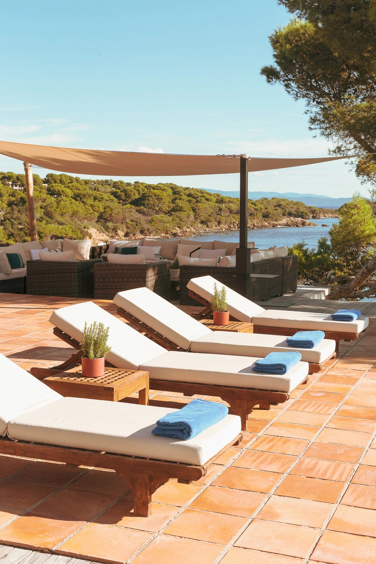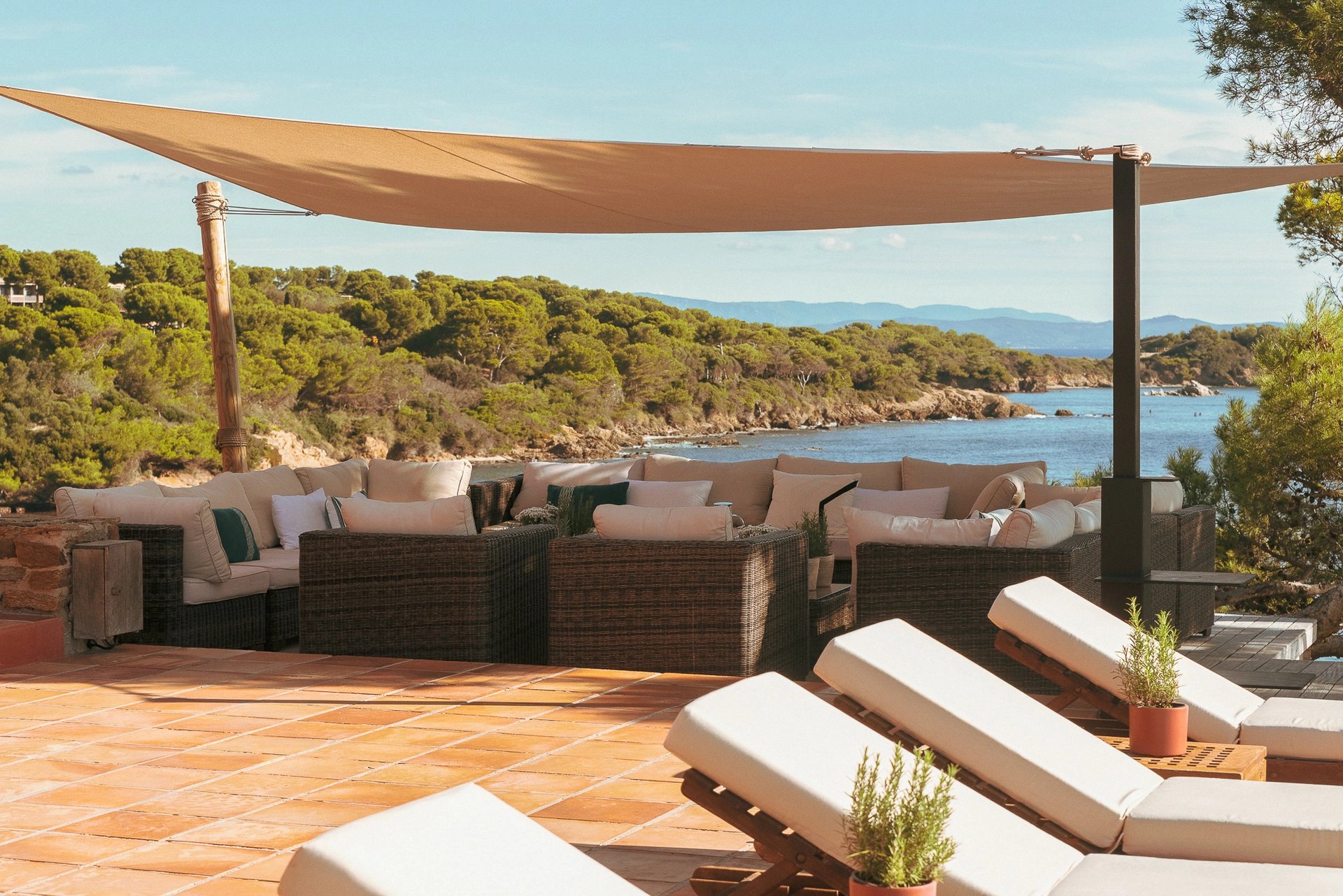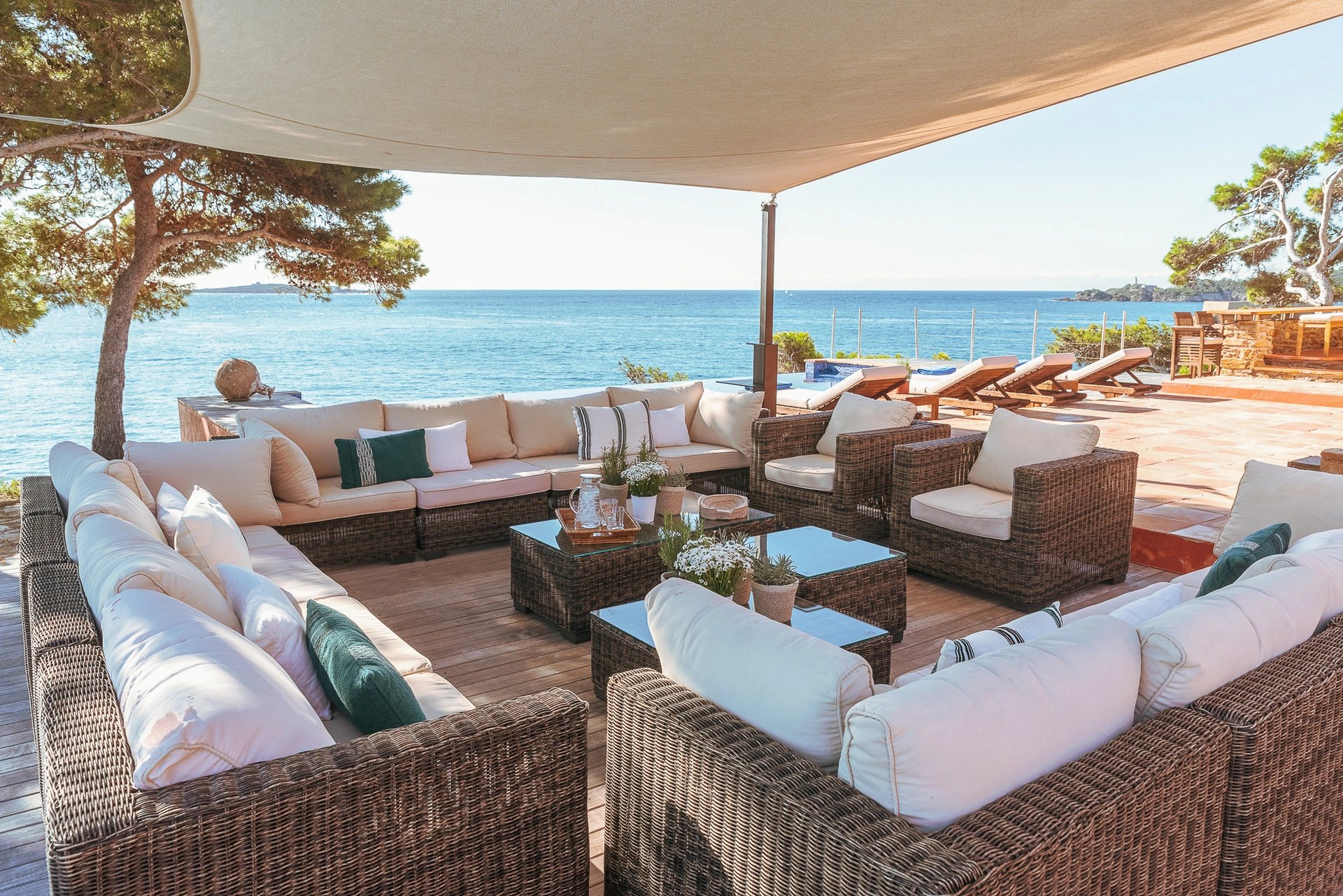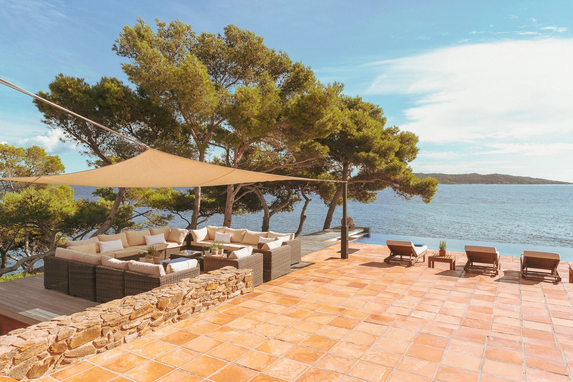 L’espace bain de soleil, aménagé d’un salon au mobilier confortable et élégant profite d’un ombrage à discrétion pour se prélasser en toute quiétude. Il se complète d’un espace bar-barbecue avec toujours cette vue imprenable sur la grande bleue. Lieu d’échange et de partage où l’on sirote cocktail en journée et qui évolue selon les envies en une accueillante table d’hôtes à l’heure des déjeuners et dîners.