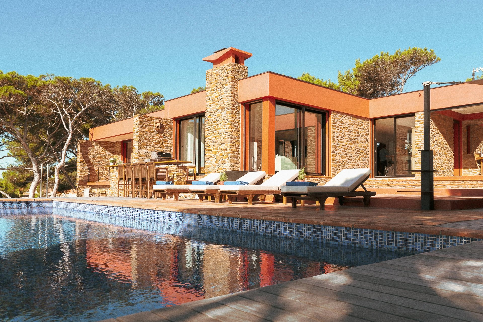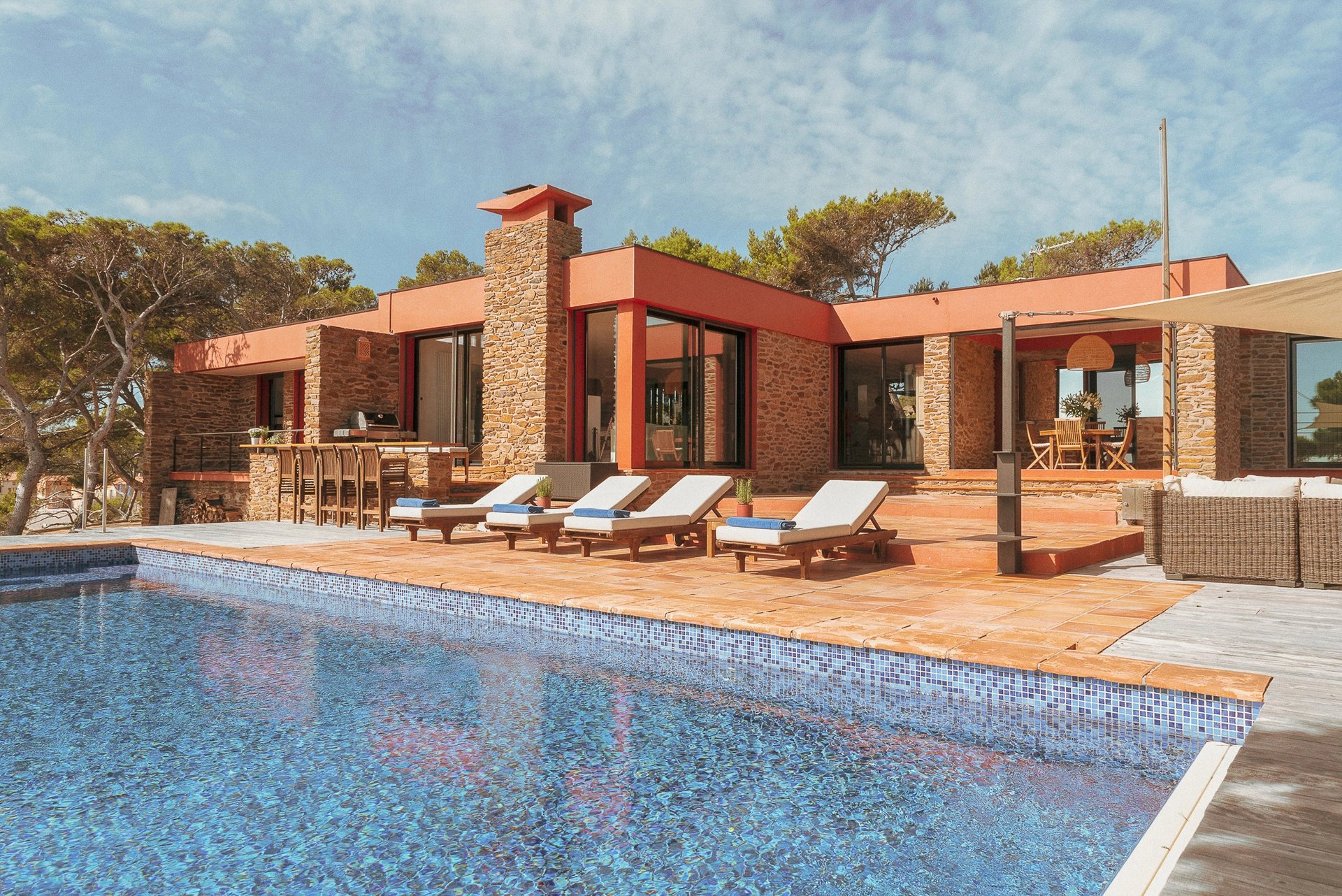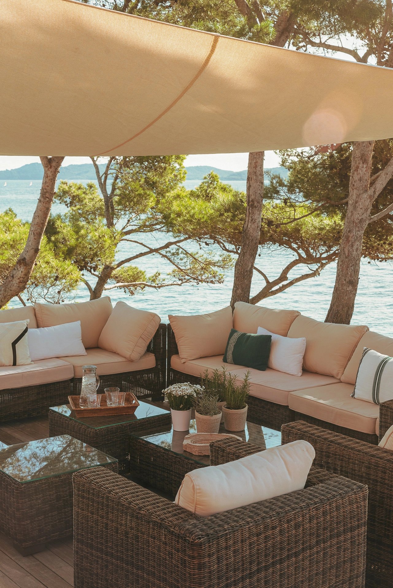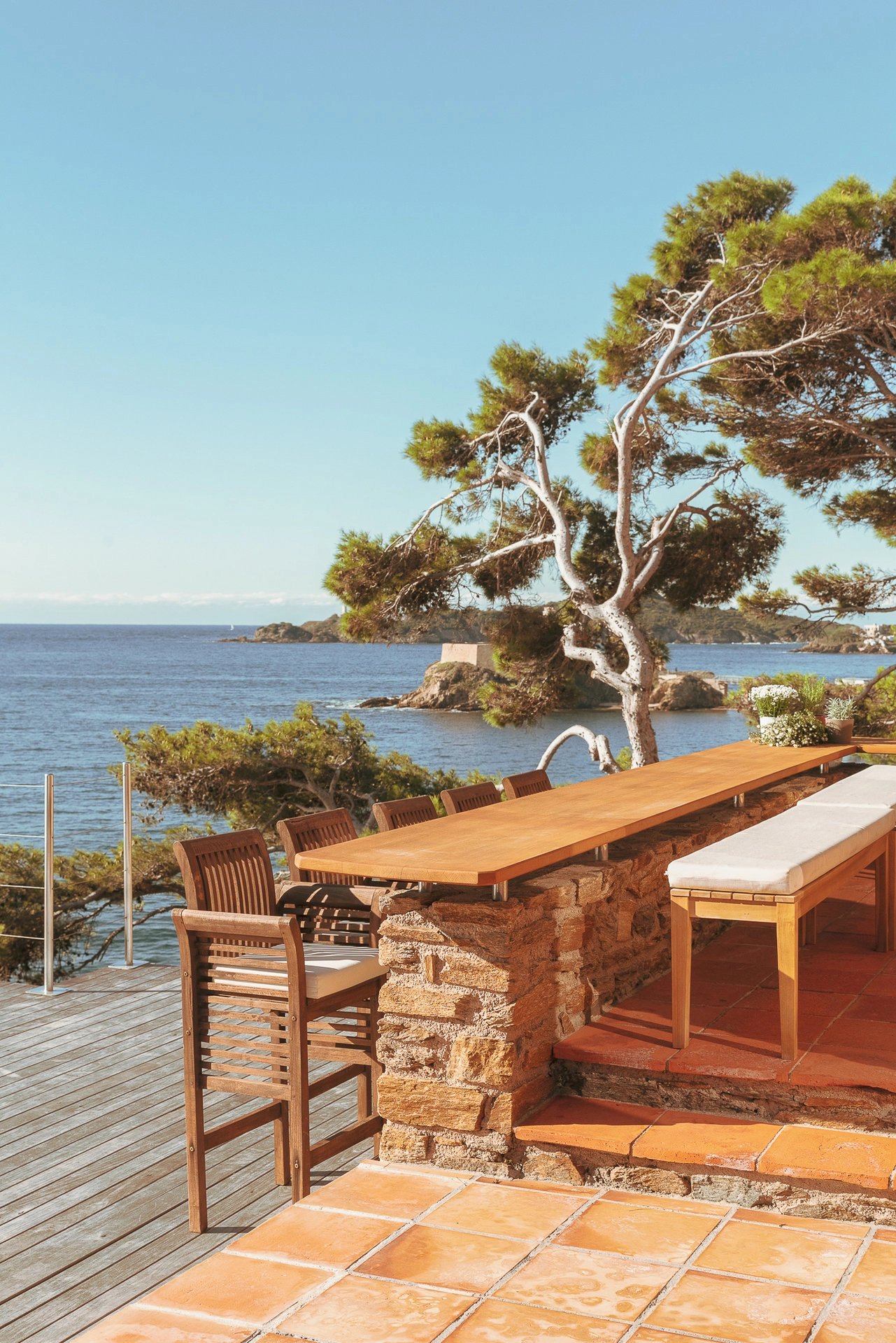 L’espace bain de soleil, aménagé d’un salon au mobilier confortable et élégant profite d’un ombrage à discrétion pour se prélasser en toute quiétude. Il se complète d’un espace bar-barbecue avec toujours cette vue imprenable sur la grande bleue. Lieu d’échange et de partage où l’on sirote cocktail en journée et qui évolue selon les envies en une accueillante table d’hôtes à l’heure des déjeuners et dîners.
