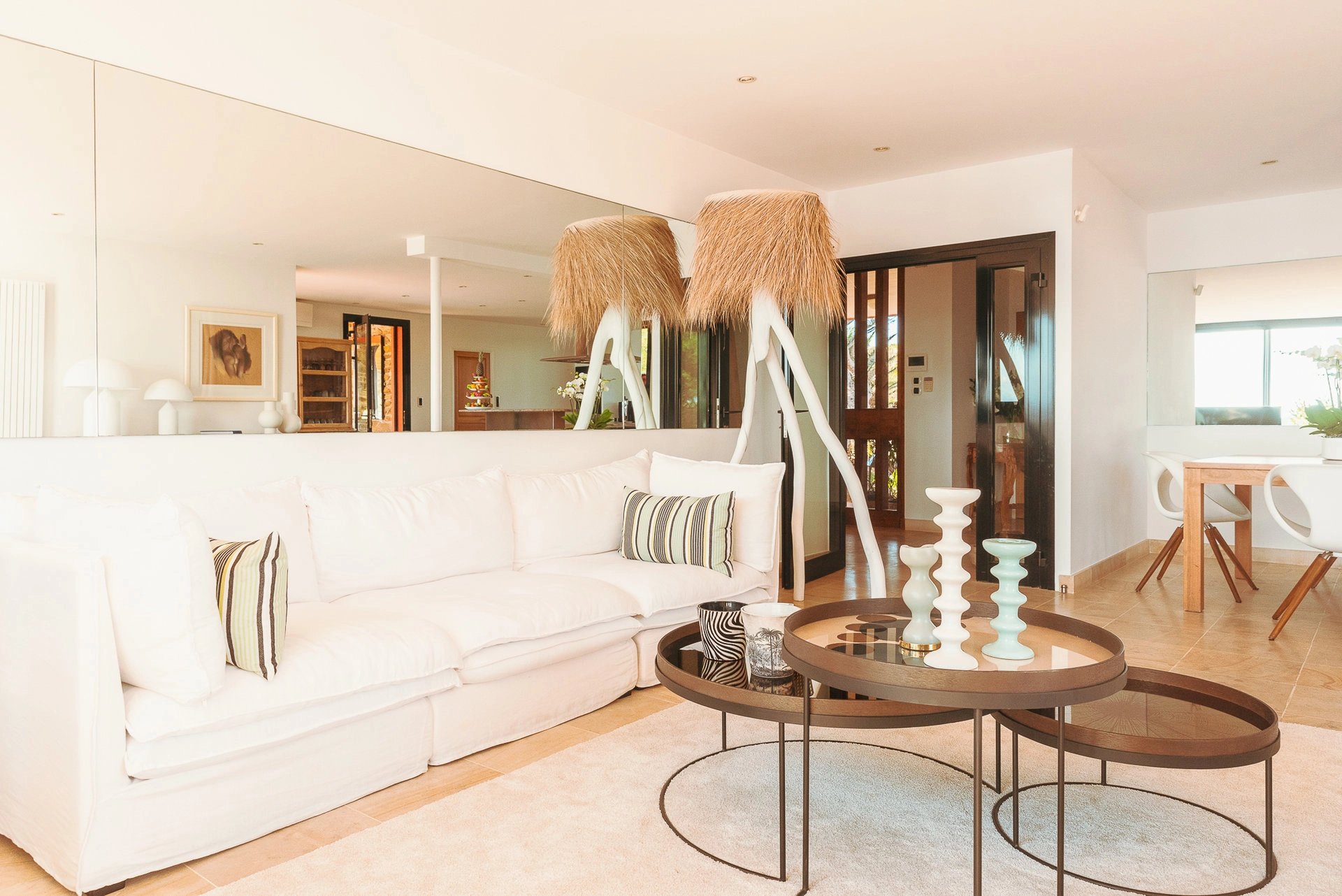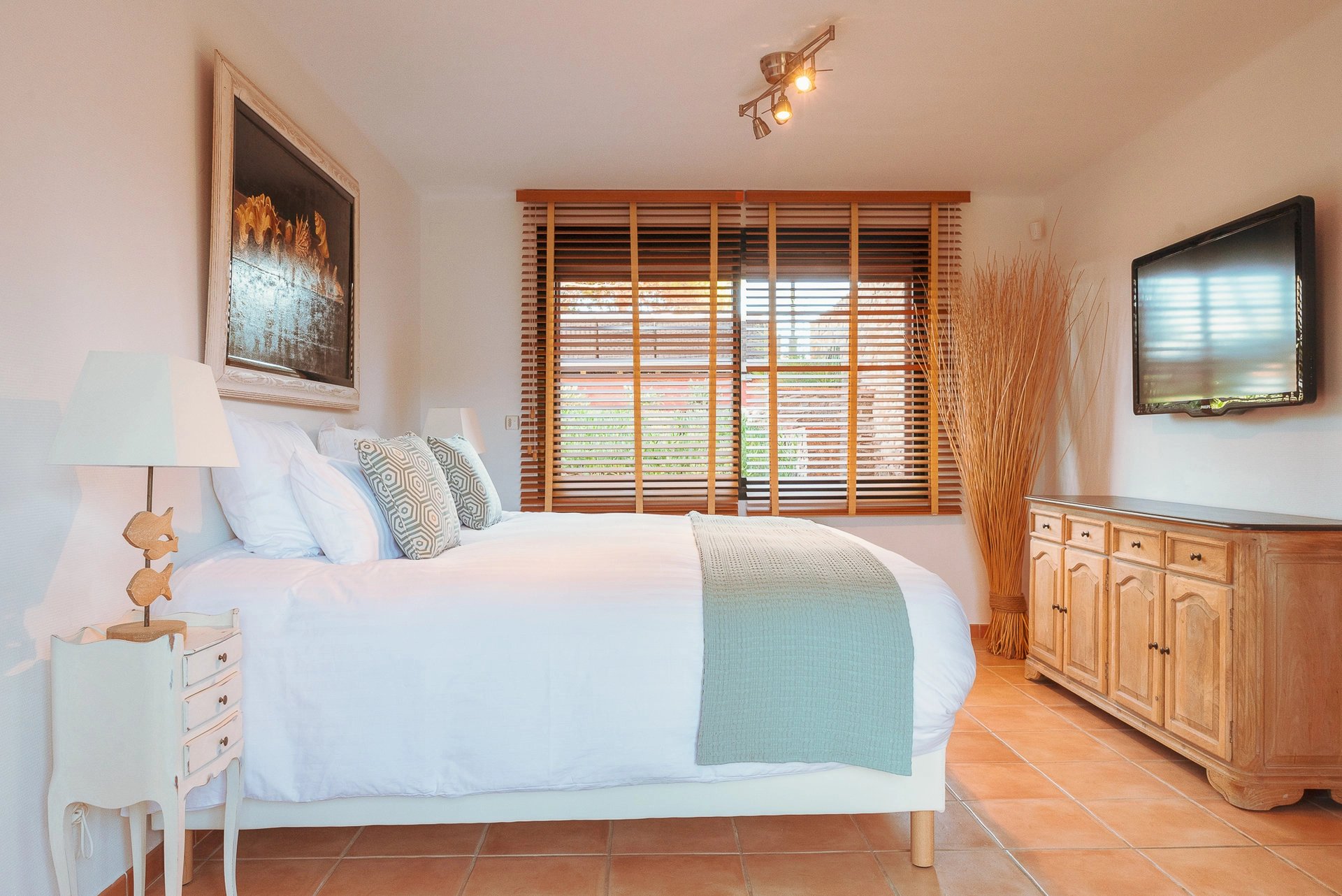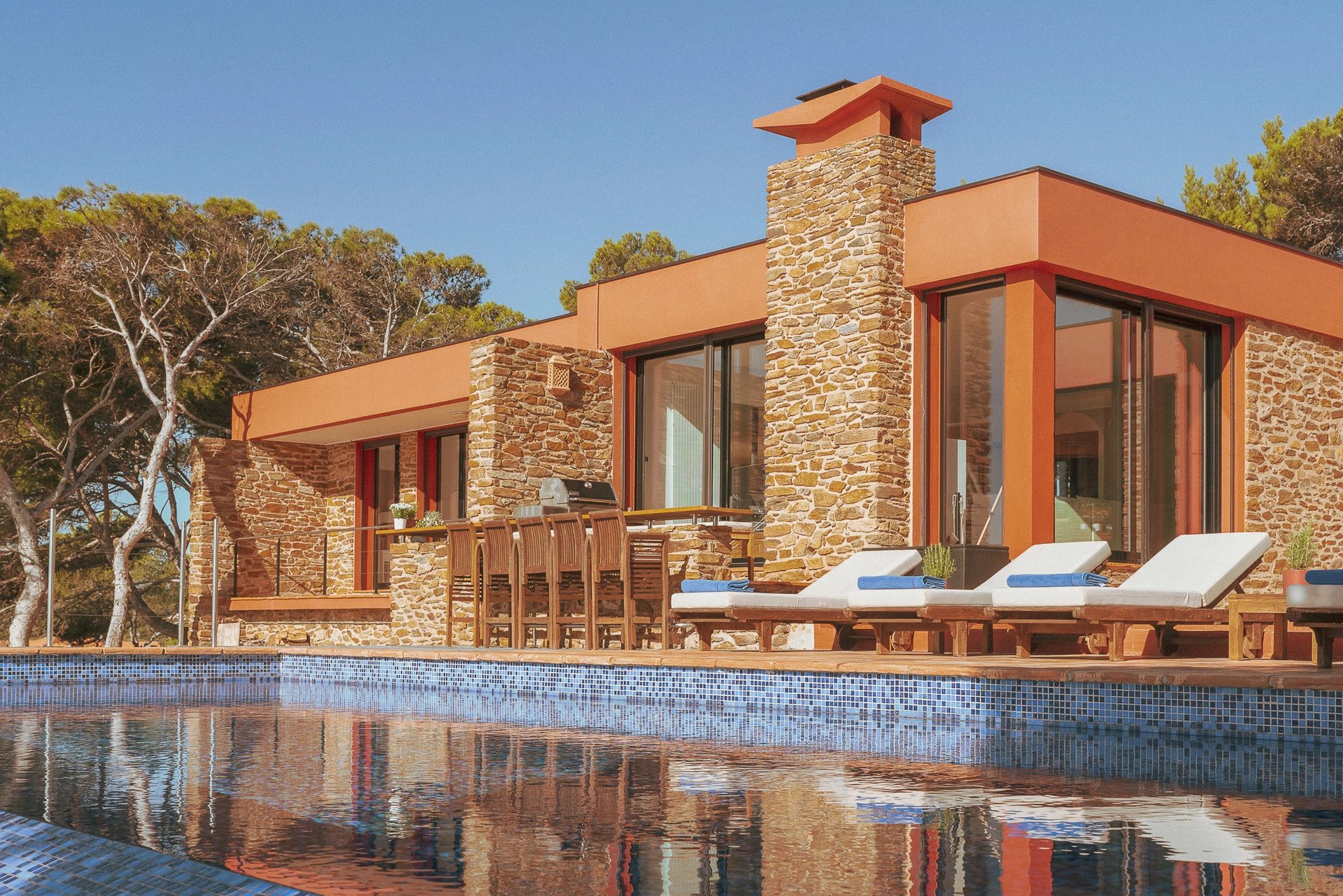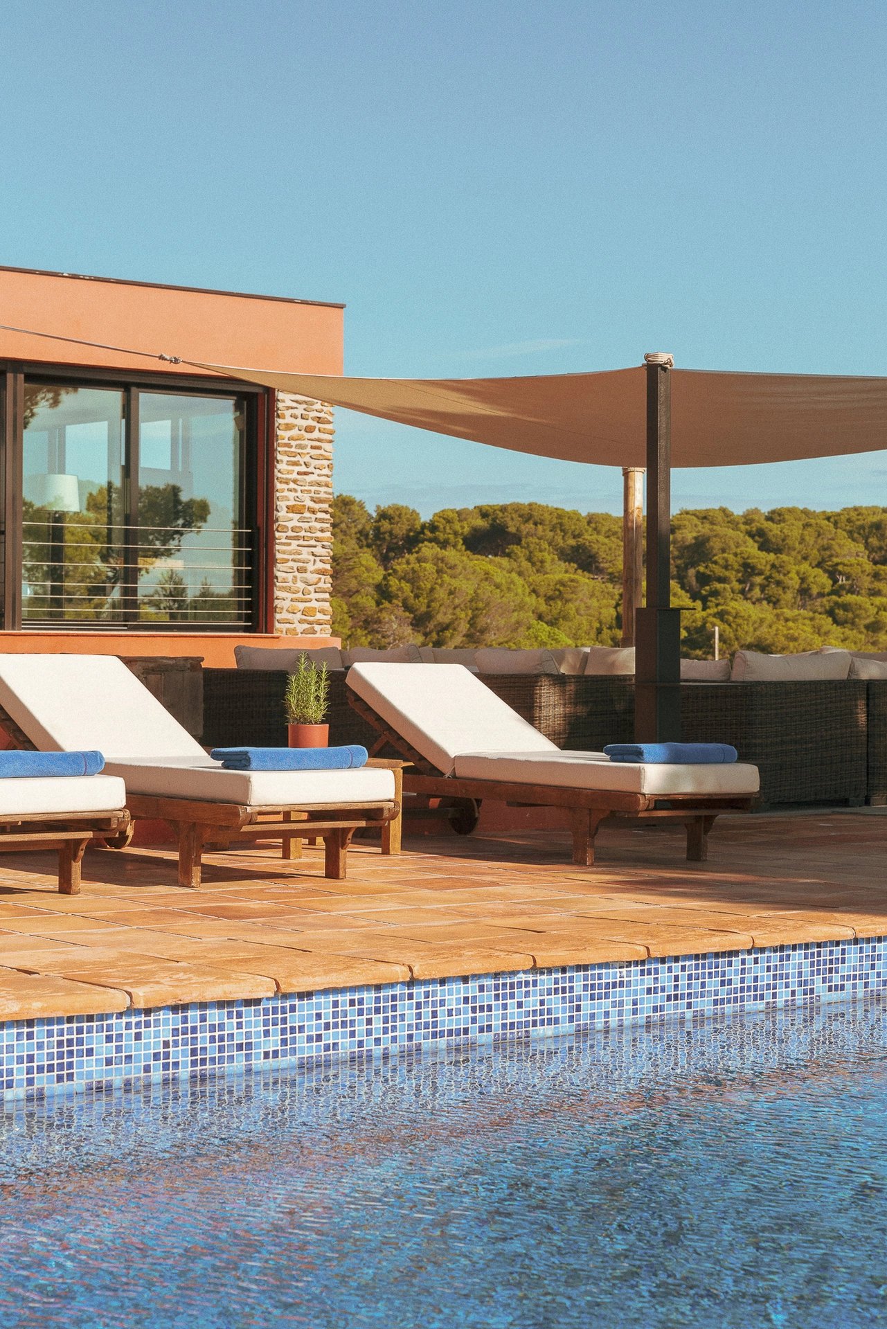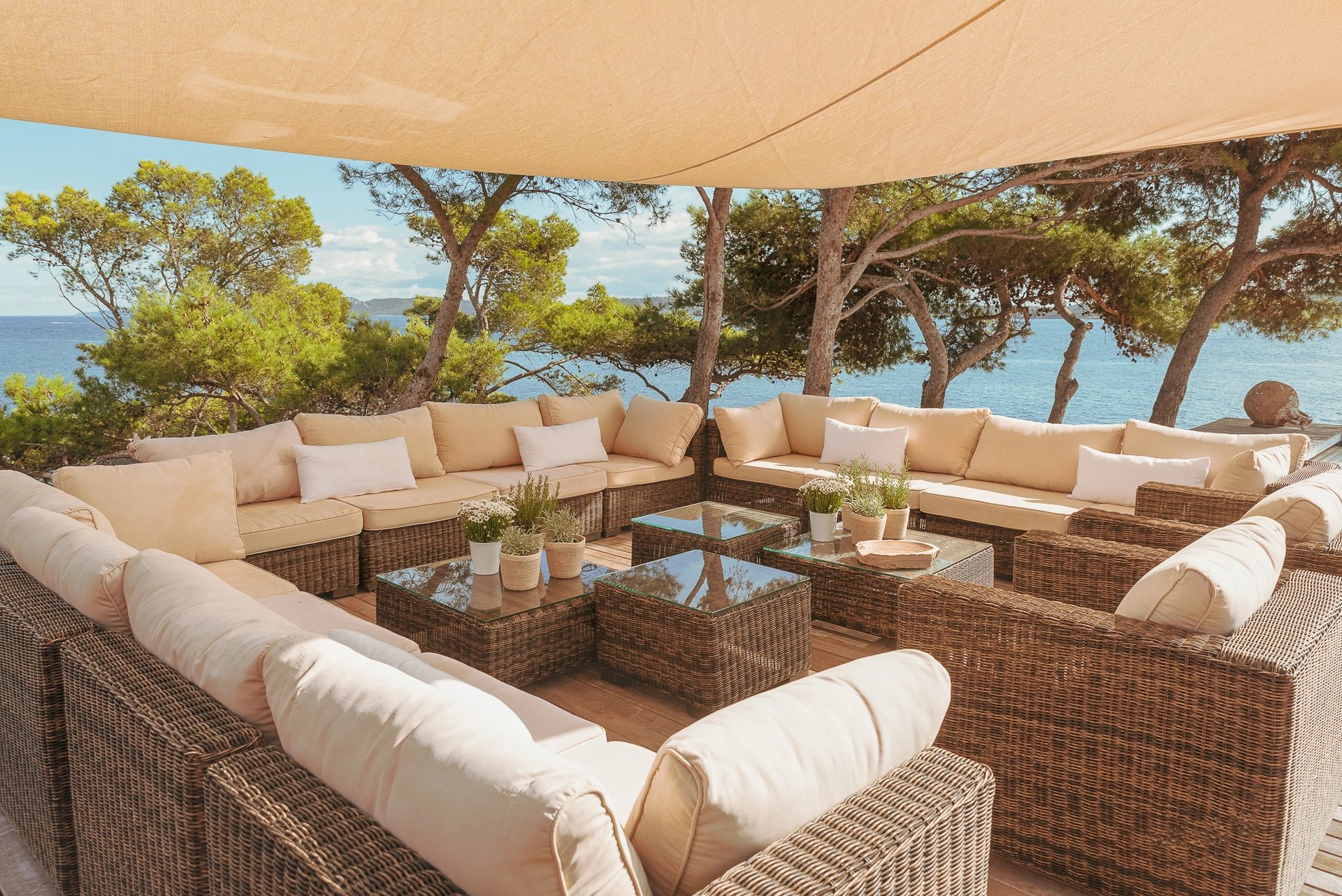 L’espace bain de soleil, aménagé d’un salon au mobilier confortable et élégant profite d’un ombrage à discrétion pour se prélasser en toute quiétude. Il se complète d’un espace bar-barbecue avec toujours cette vue imprenable sur la grande bleue. Lieu d’échange et de partage où l’on sirote cocktail en journée et qui évolue selon les envies en une accueillante table d’hôtes à l’heure des déjeuners et dîners.