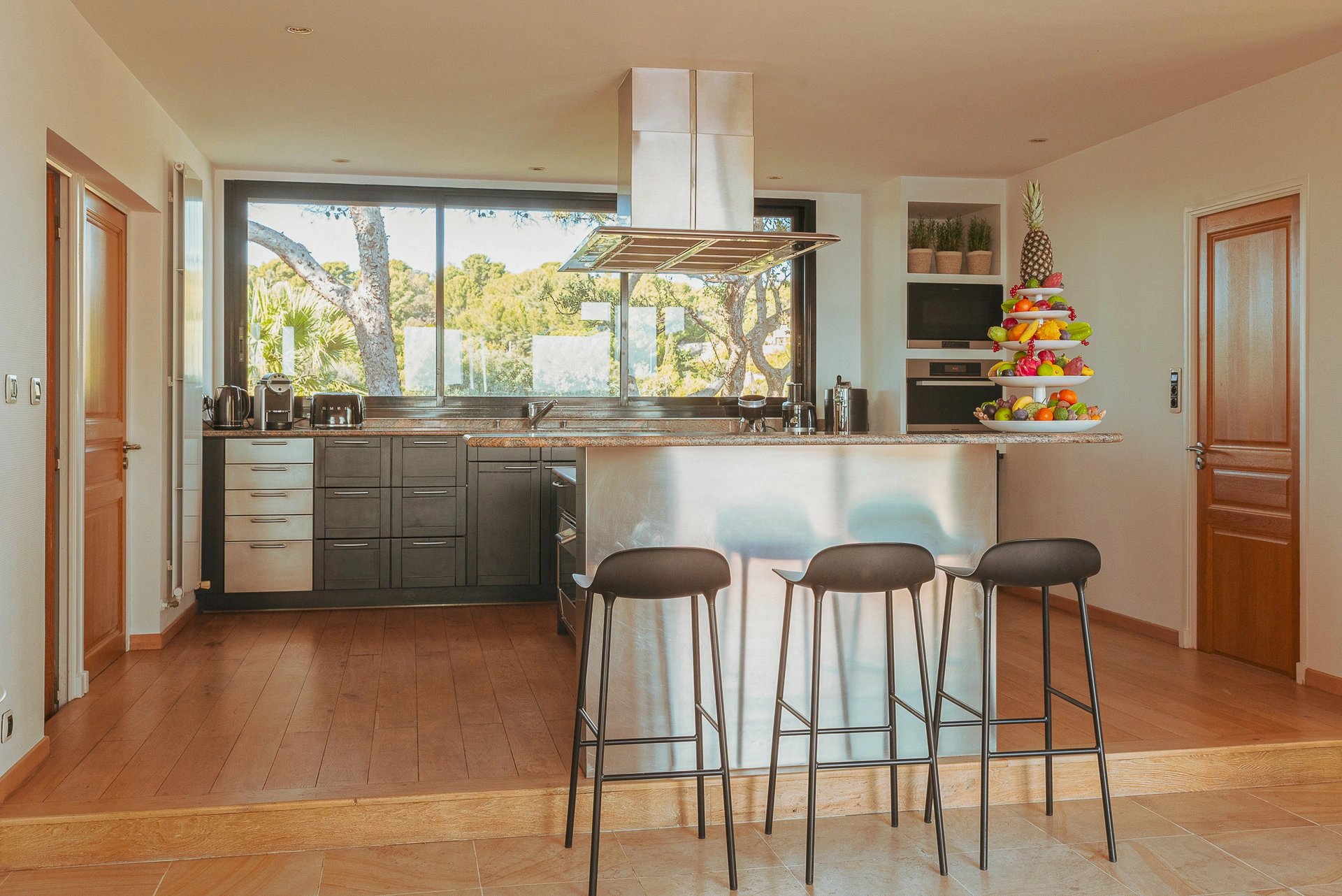 Rez de villa : une cuisine de service, chambre de service et salle de sport.
