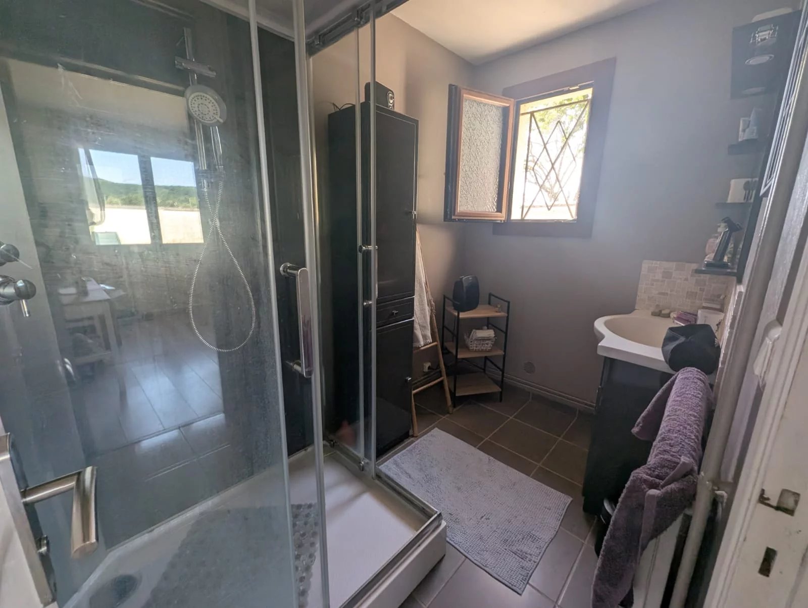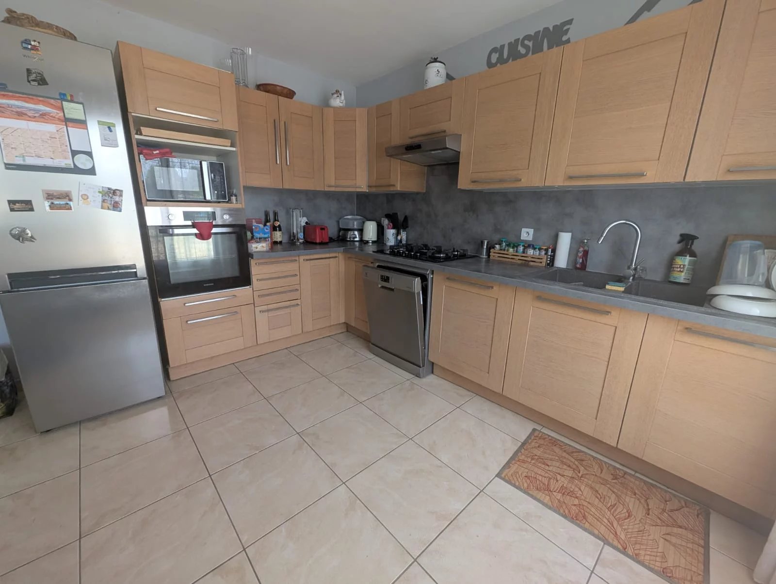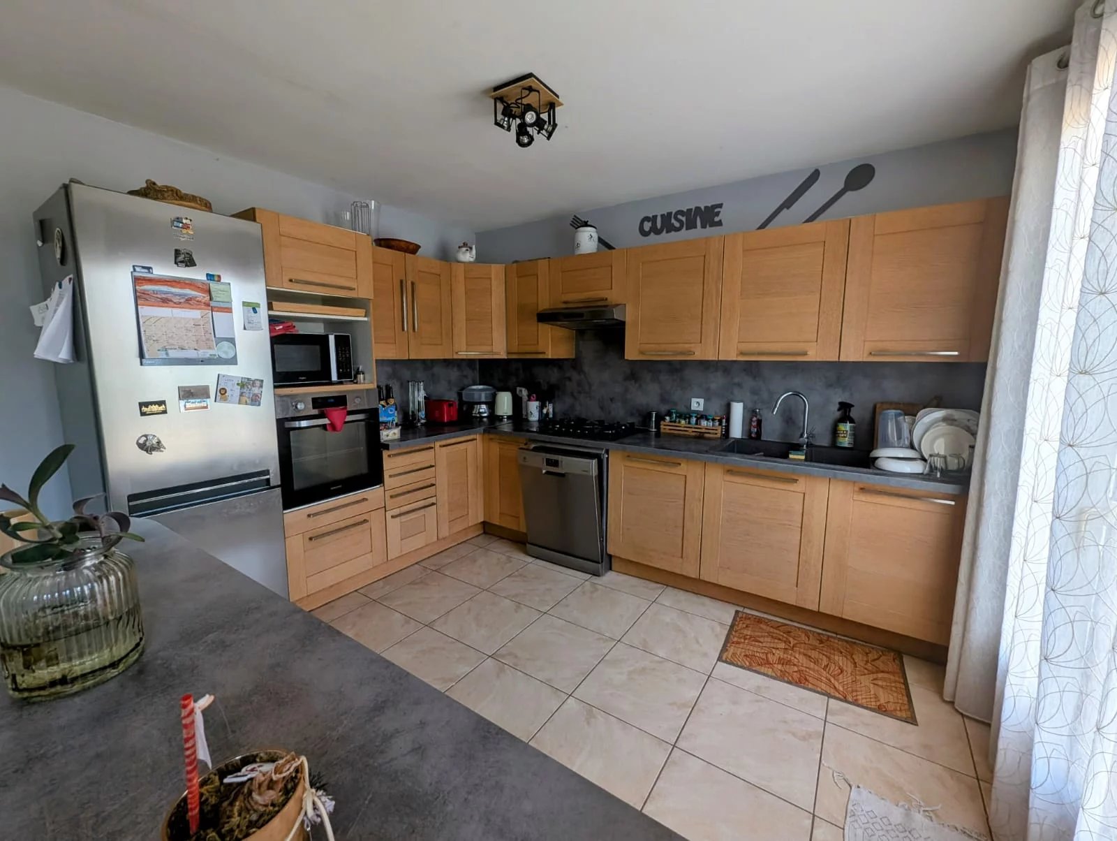 un séjour lumineux avec cheminée, une cuisine ouverte aménagée et équipée, 3 chambres, une salle d'eau, un toilette indépendant.