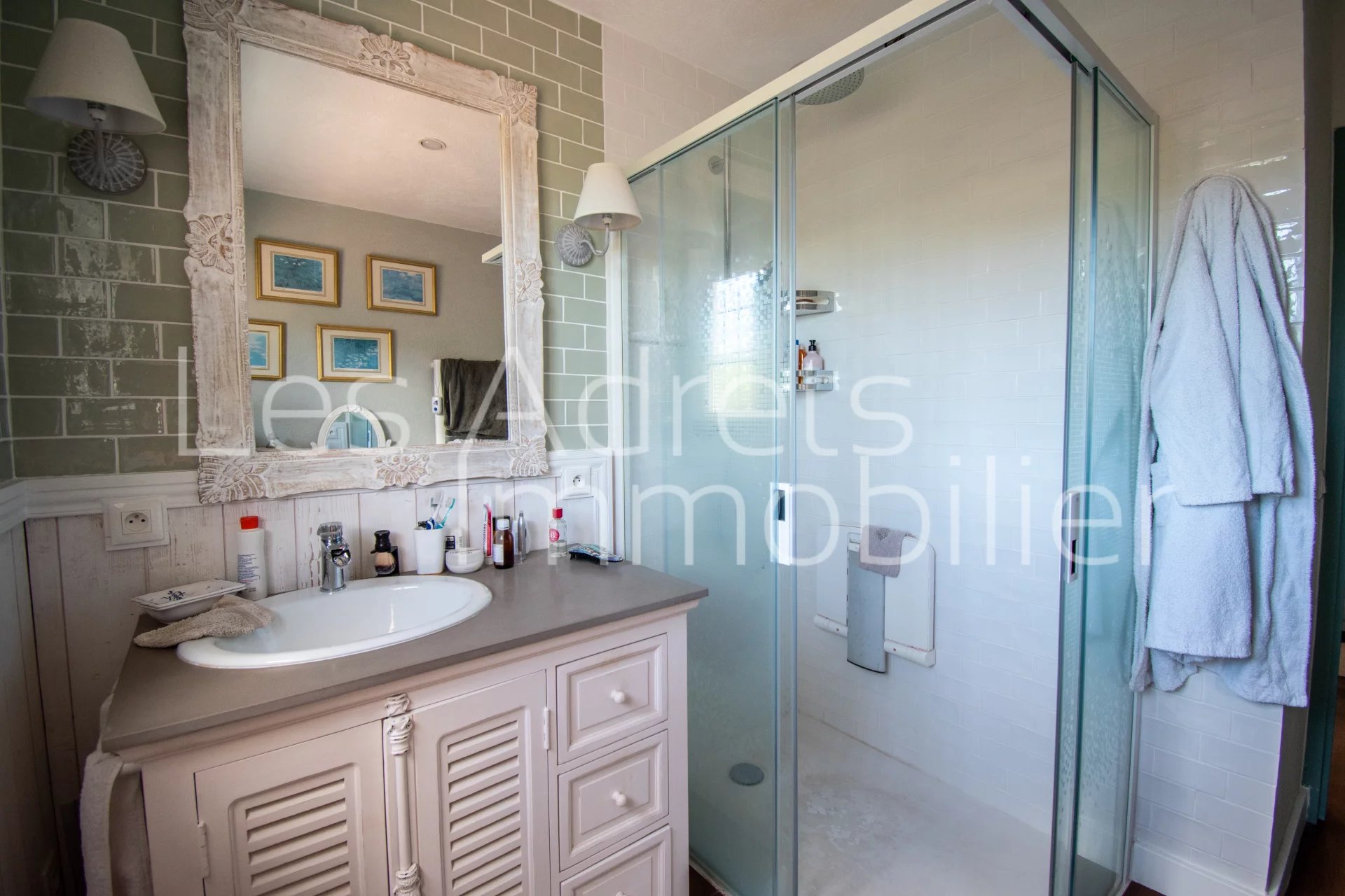 Au niveau du jardin, vous découvrirez un bel espace de vie de 41,5 m² regroupant le salon, la salle à manger et la cuisine ouverte, donnant accès à une terrasse et au jardin avec vue mer panoramique. Une troisième chambre avec sa propre salle d’eau et WC complète ce niveau.