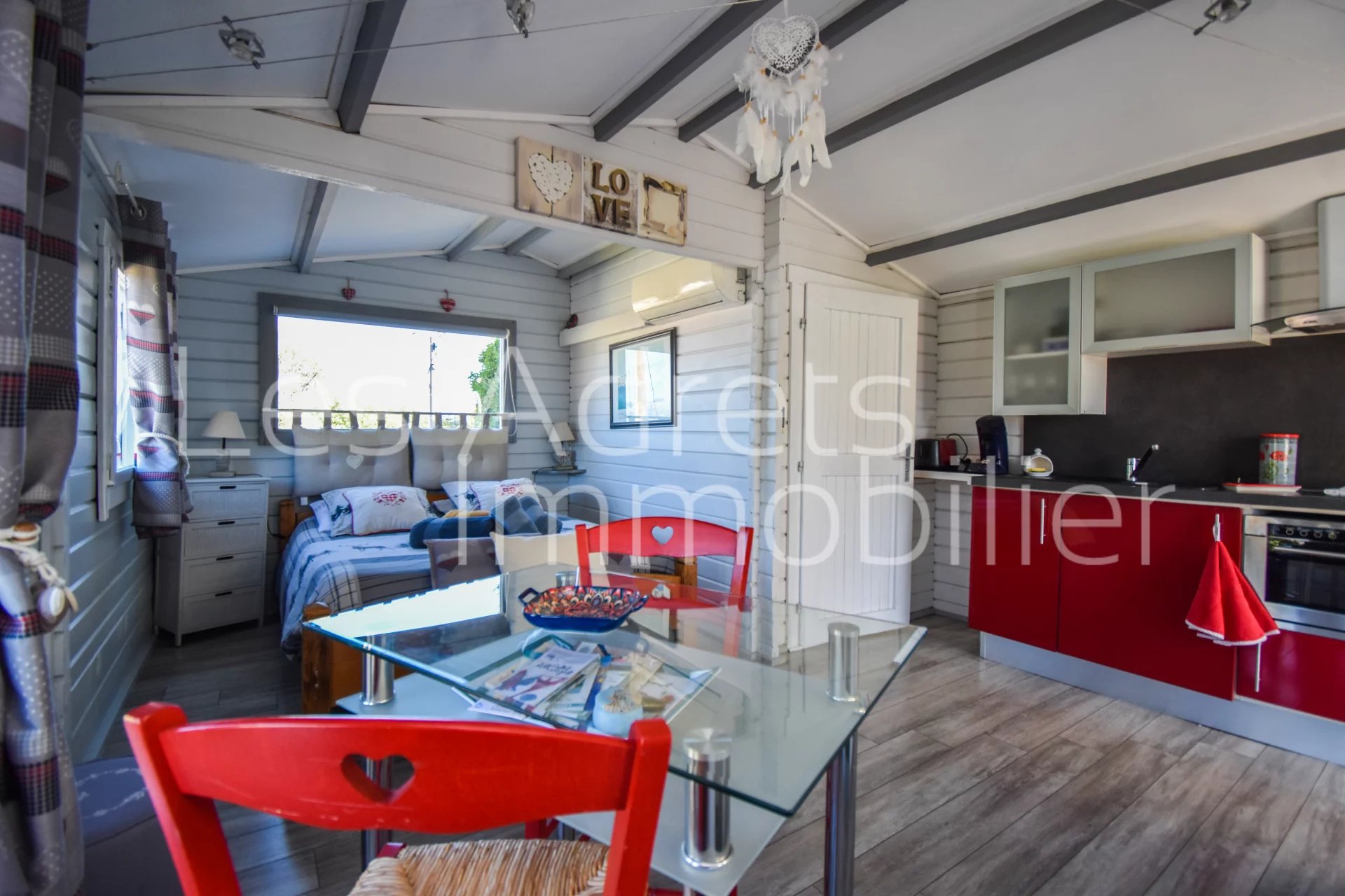 La maison principale d’environ 90 m² offre un bel espace de vie climatisé avec cheminée, une cuisine ouverte et une mezzanine surplombant le séjour, idéale pour un bureau ou un coin lecture. L’ensemble s’ouvre sur une vaste terrasse couverte avec cuisine d’été, parfaite pour prolonger les moments de convivialité. Deux chambres, dont une avec dressing, ainsi qu’une salle d’eau et des toilettes séparées complètent cette partie principale.