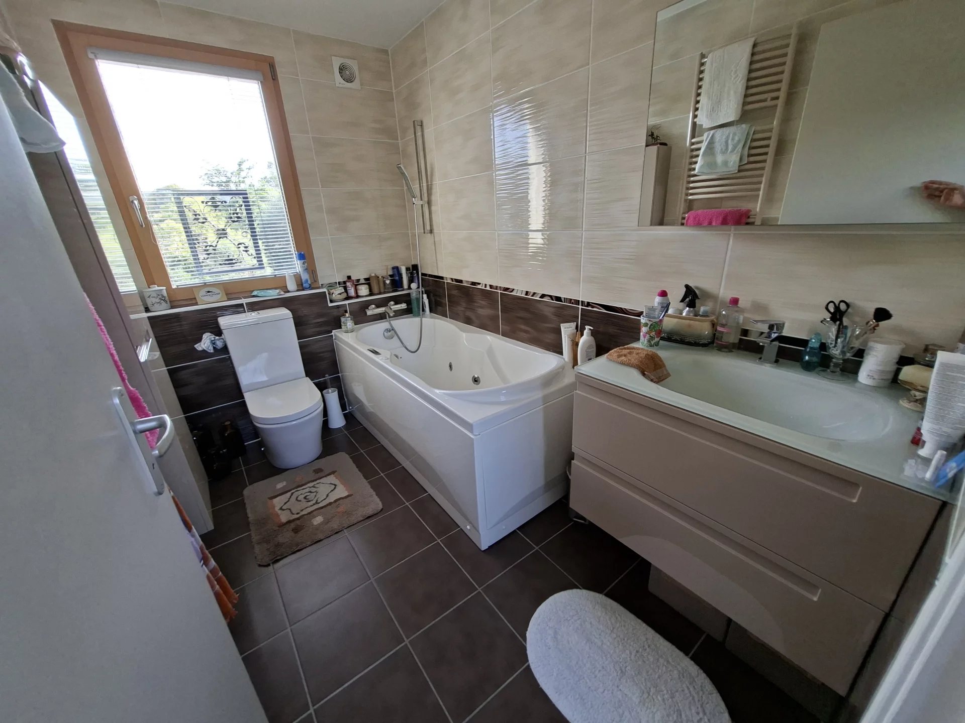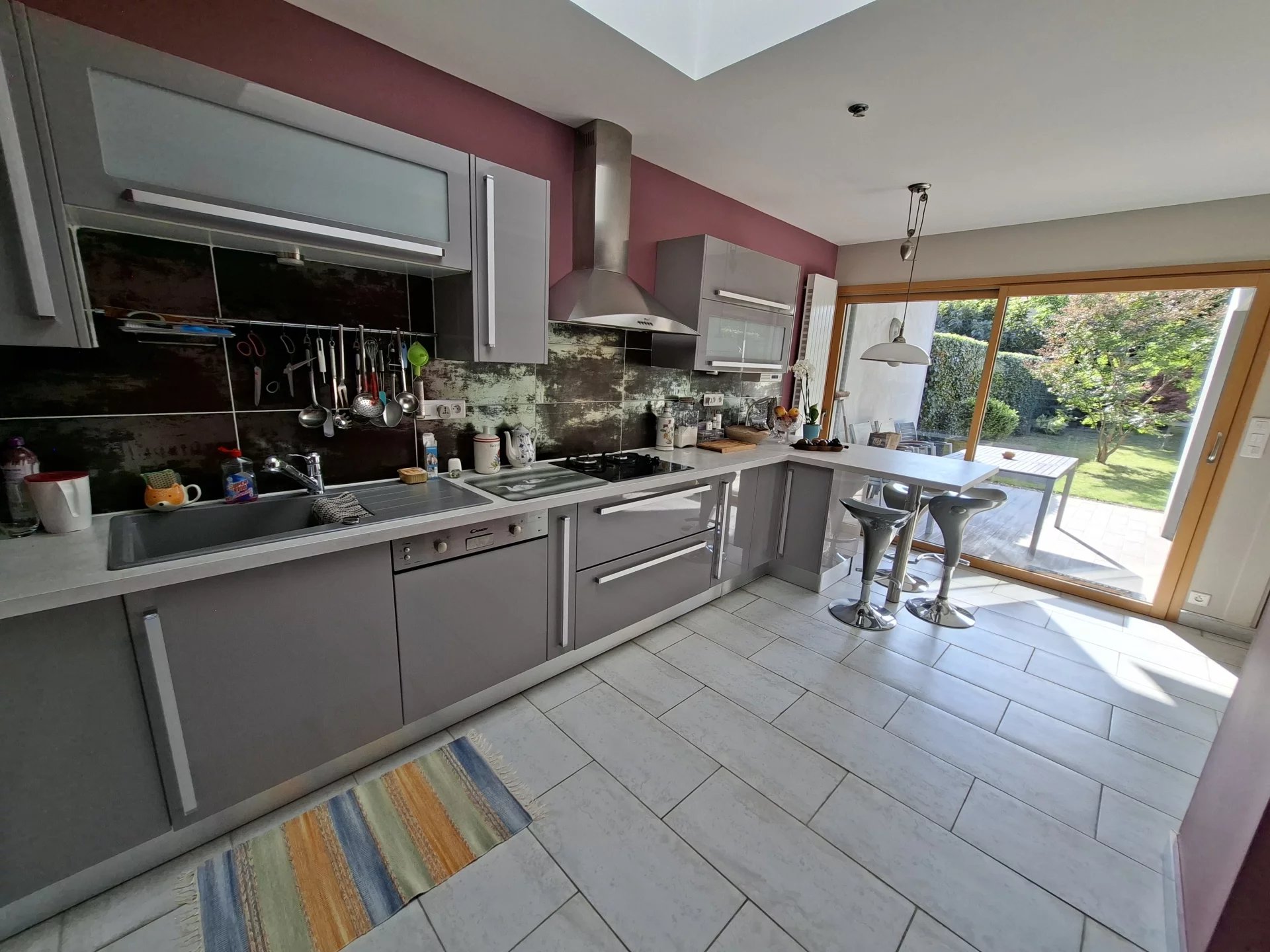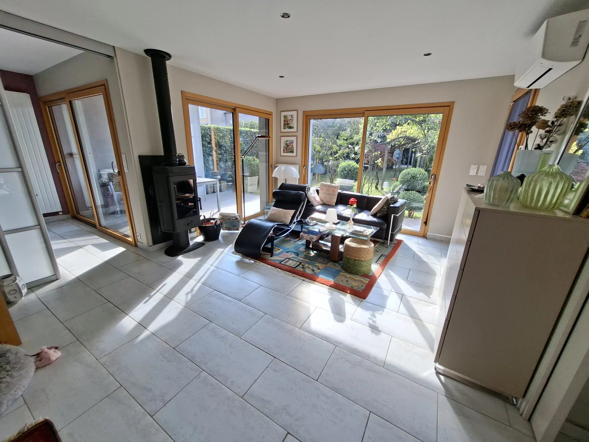 Poêle à bois, climatisation, volets roulants, puits de lumière et grande baies vitrées pour une luminosité optimale avec vue sur le jardin arboré et parfaitement entretenu.