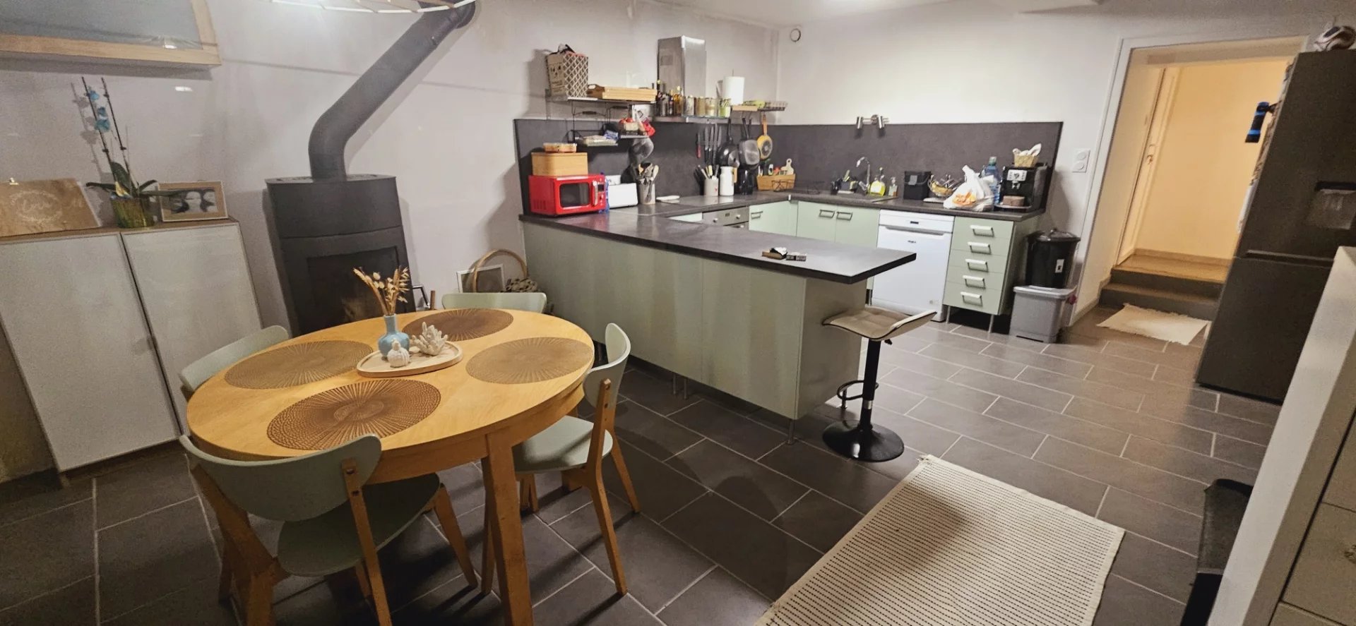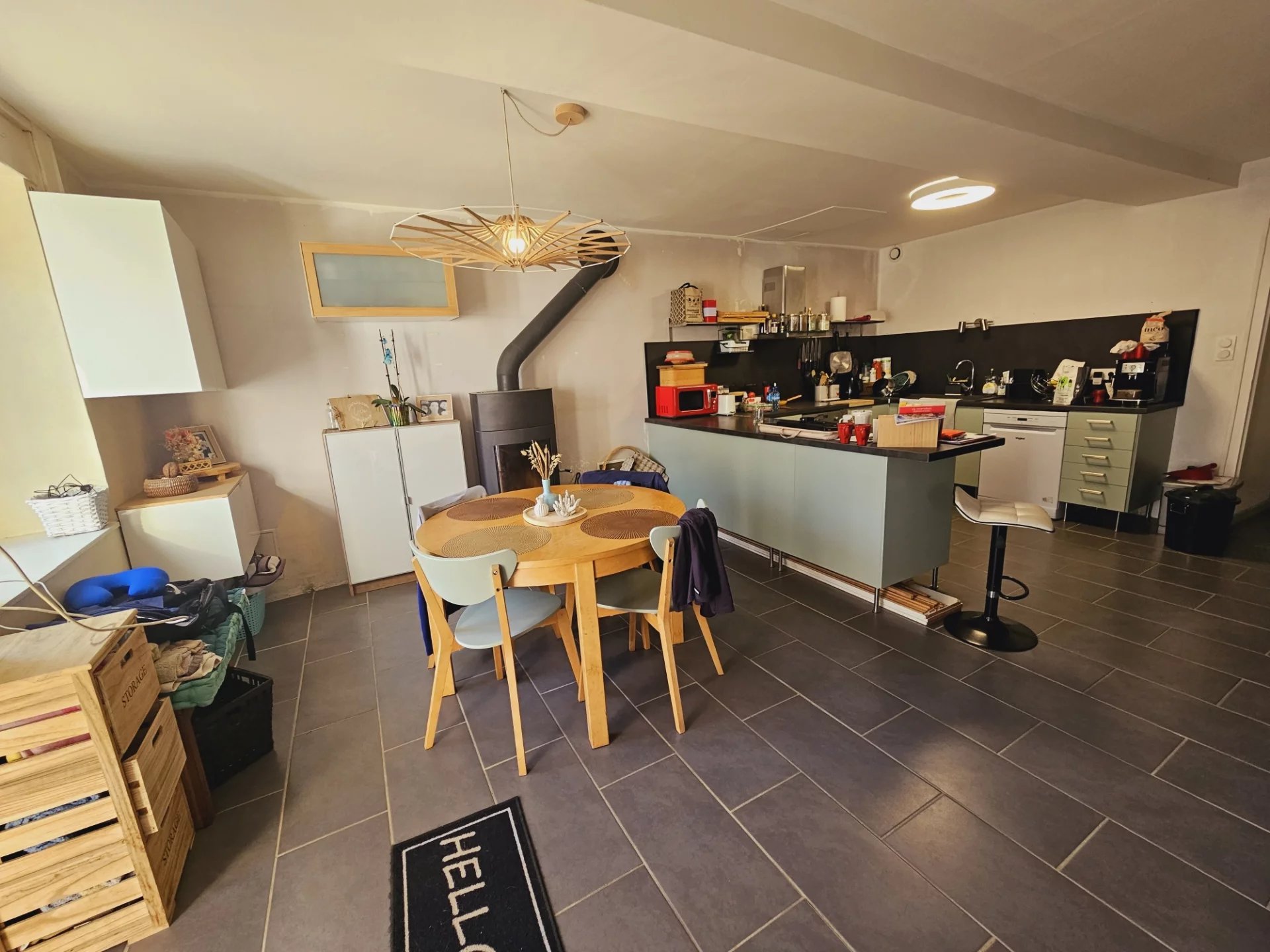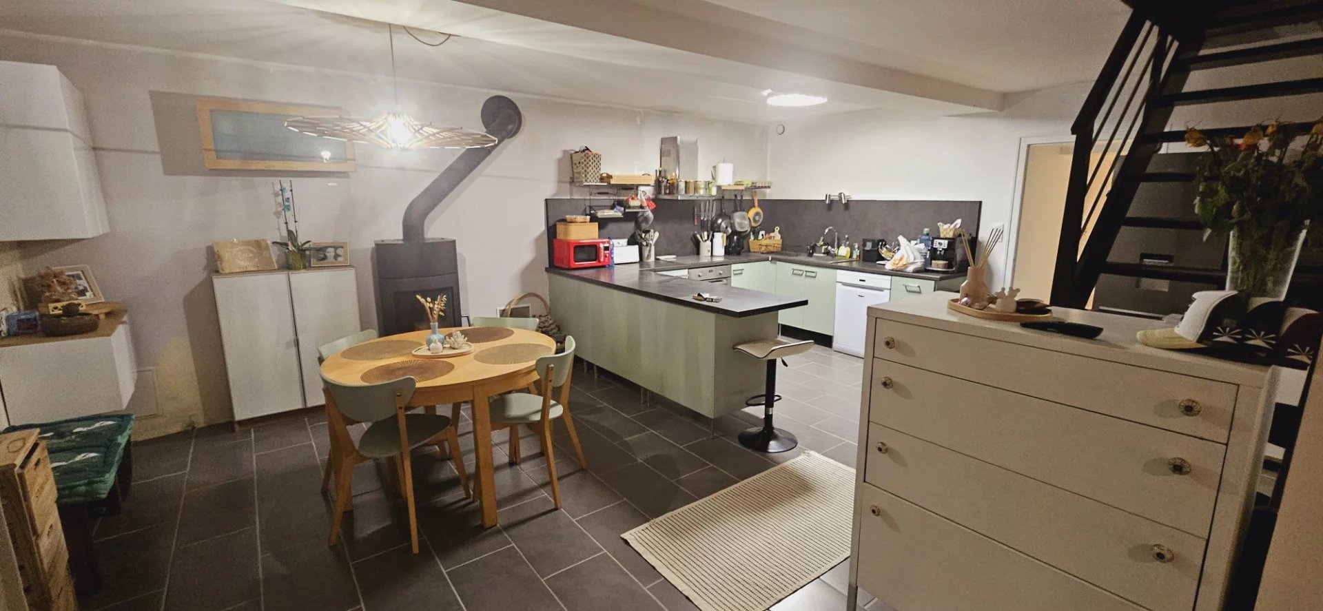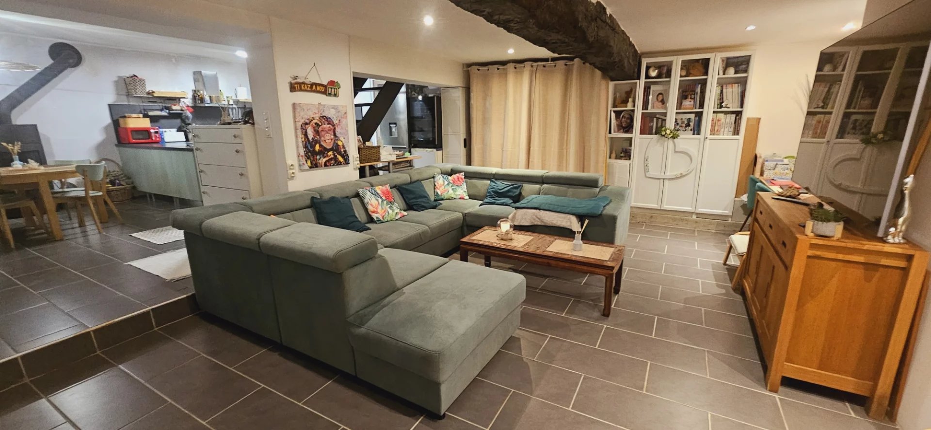 Cette maison est composée au RDC: d'une grande pièce de vie de 60m² comprenant une cuisine A/E, une salle à manger avec poële à bois et un grand séjour avec bibliothèque. Une chambre, un WC et une buanderie donnant accès sur l'extérieur viennent compléter ce niveau. À l'étage, un dégagement dessert une salle d'eau, trois chambres et une pièce pouvant servir de bureau ou de dressing.