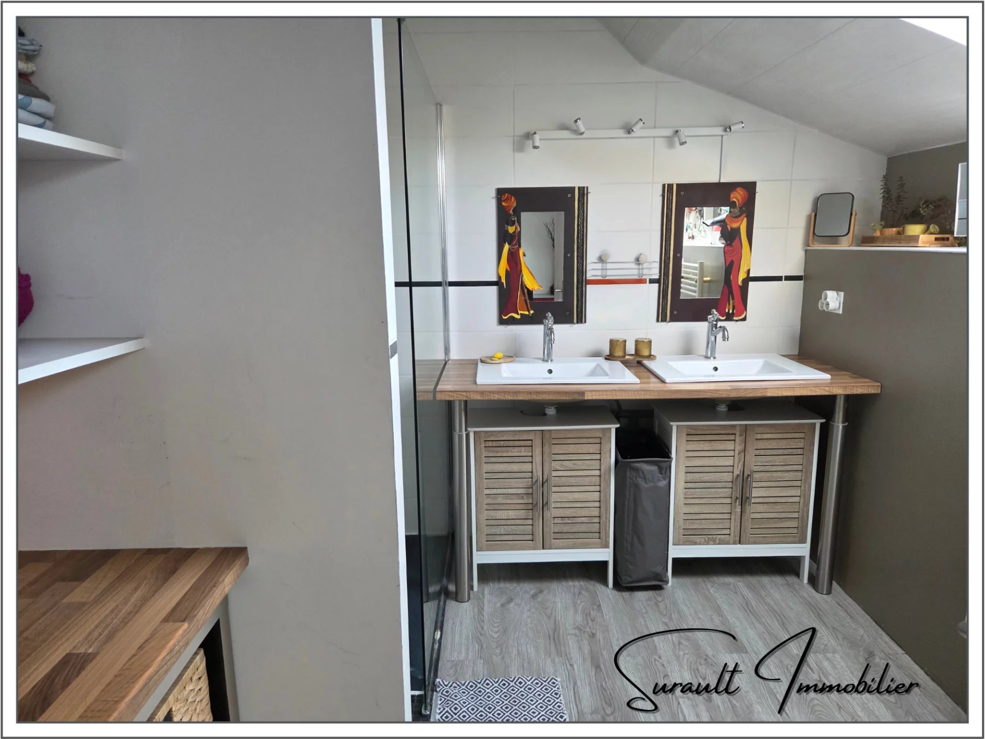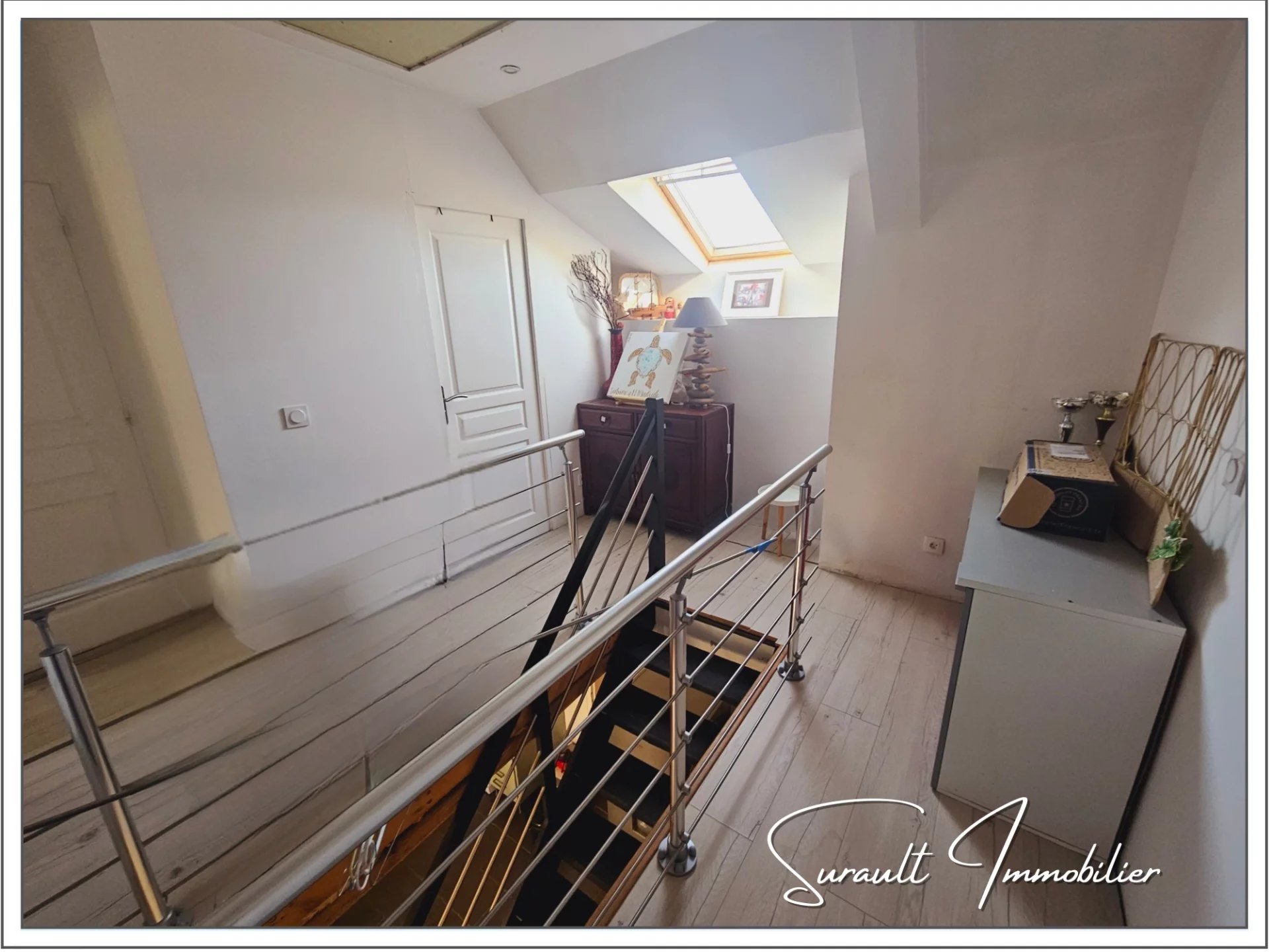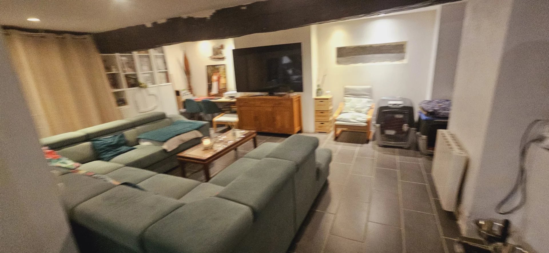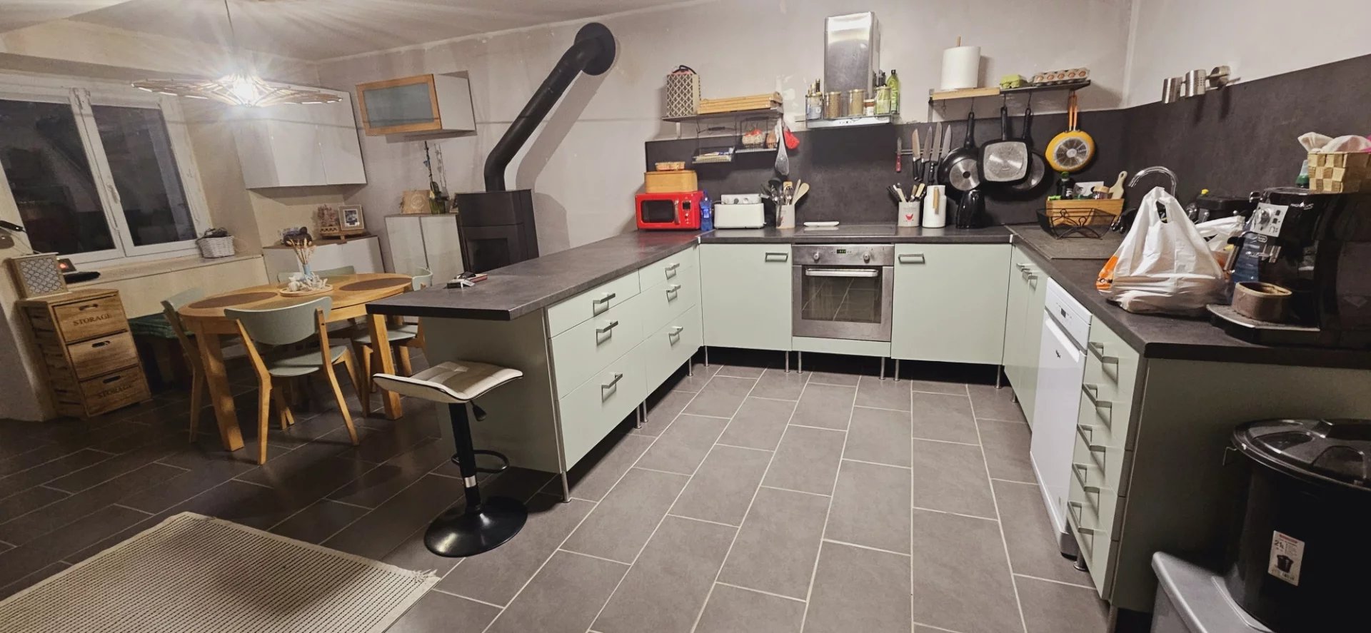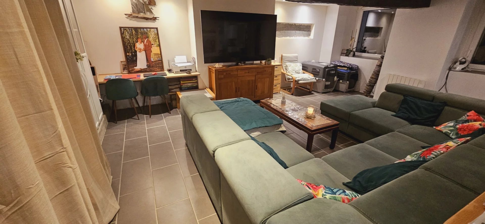 Cette maison est composée au RDC: d'une grande pièce de vie de 60m² comprenant une cuisine A/E, une salle à manger avec poële à bois et un grand séjour avec bibliothèque. Une chambre, un WC et une buanderie donnant accès sur l'extérieur viennent compléter ce niveau. À l'étage, un dégagement dessert une salle d'eau, trois chambres et une pièce pouvant servir de bureau ou de dressing.