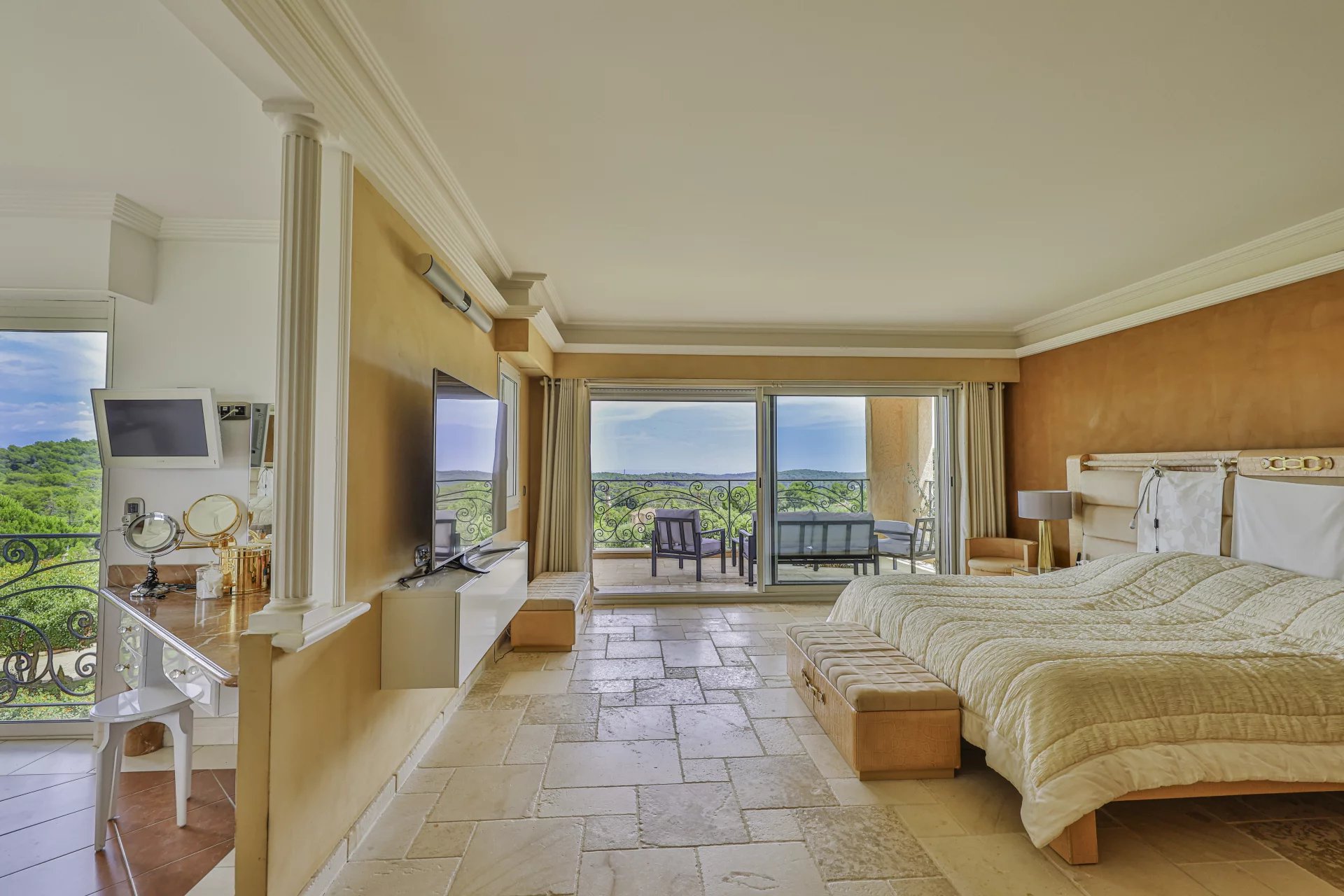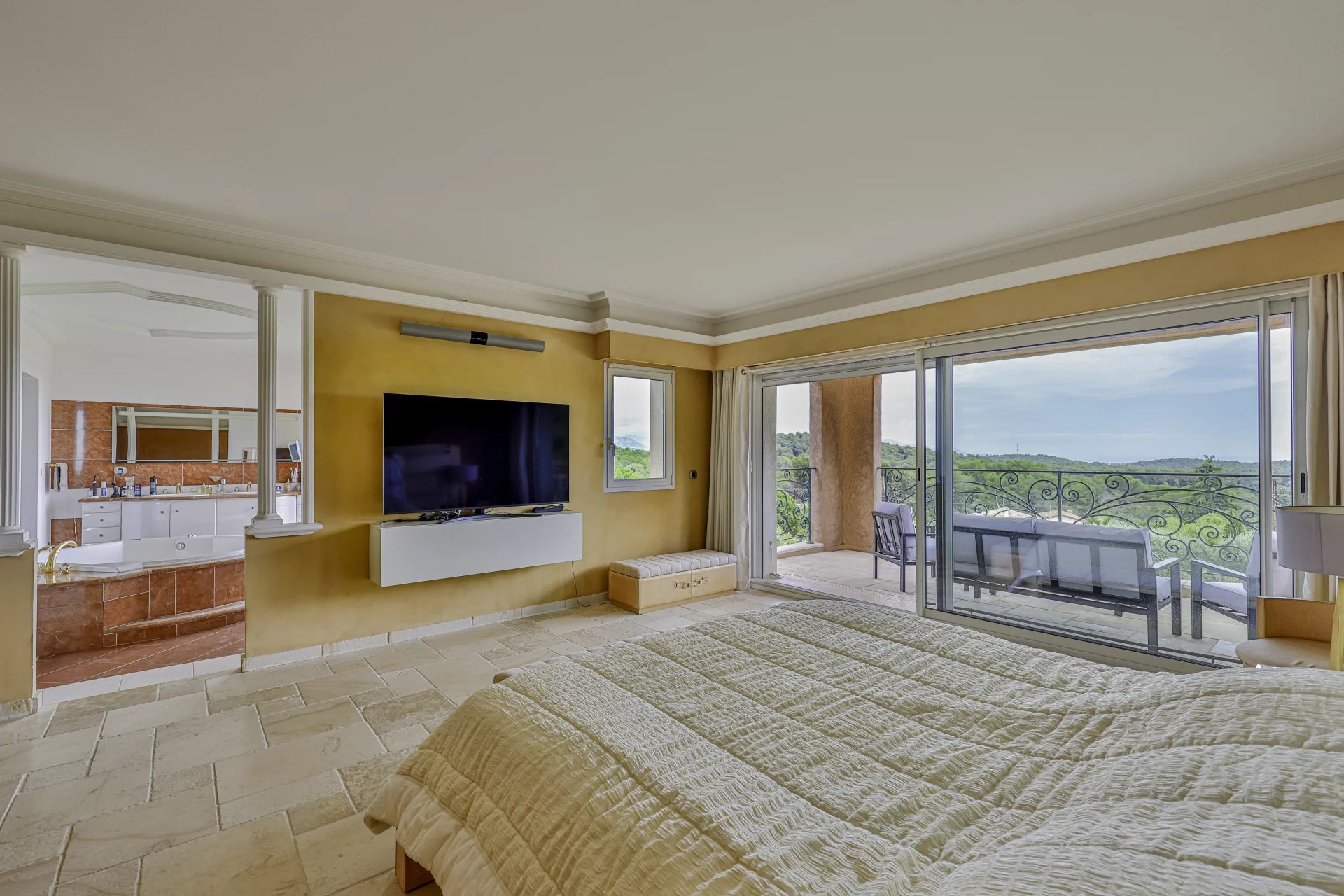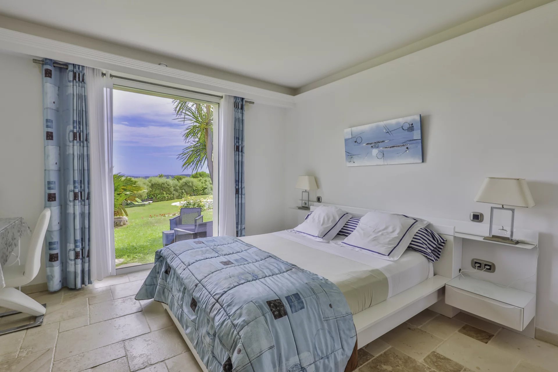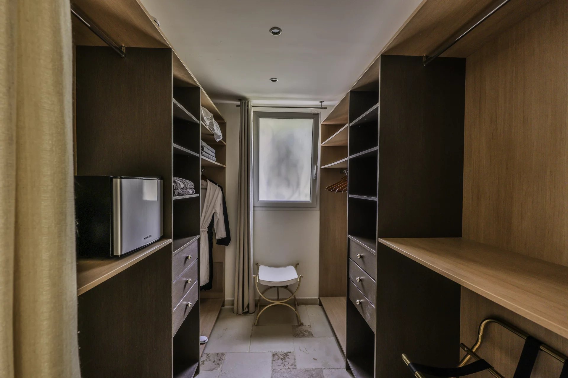 A l'étage, nous y retrouvons une grande chambre de maitre avec salle de bain, dressing et terrasse privée offrant une vue panoramique sur les collines et la mer au fond.