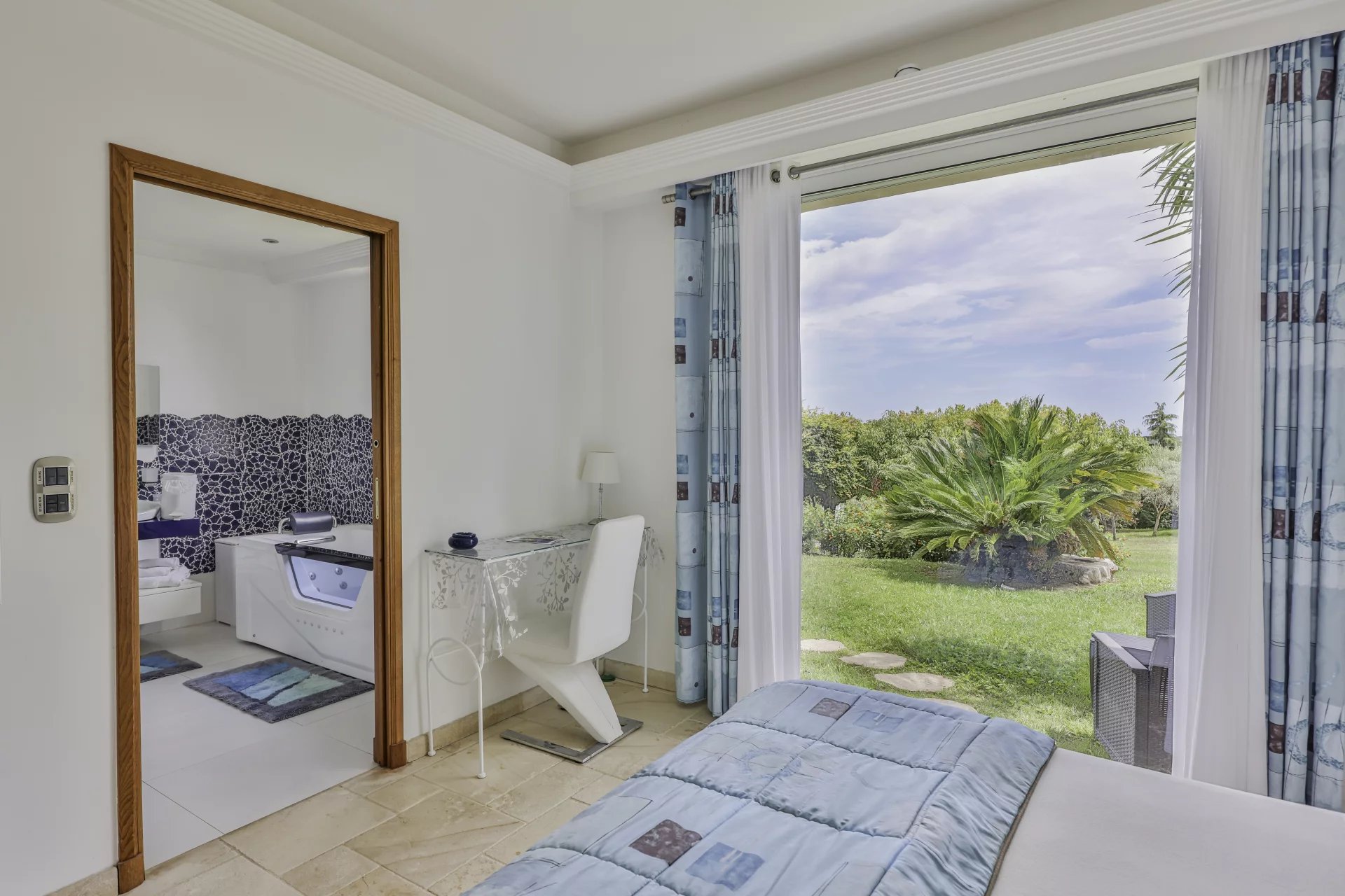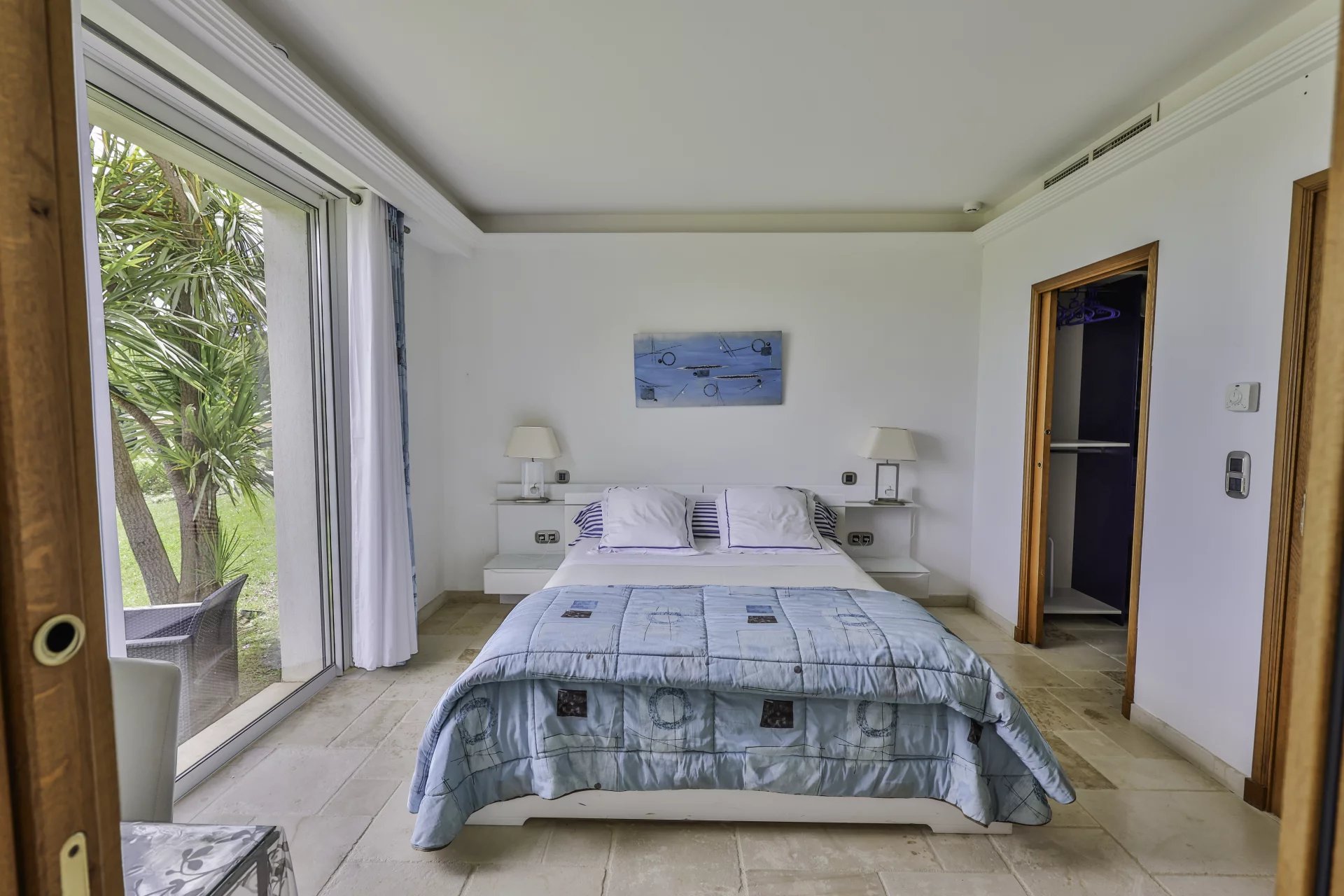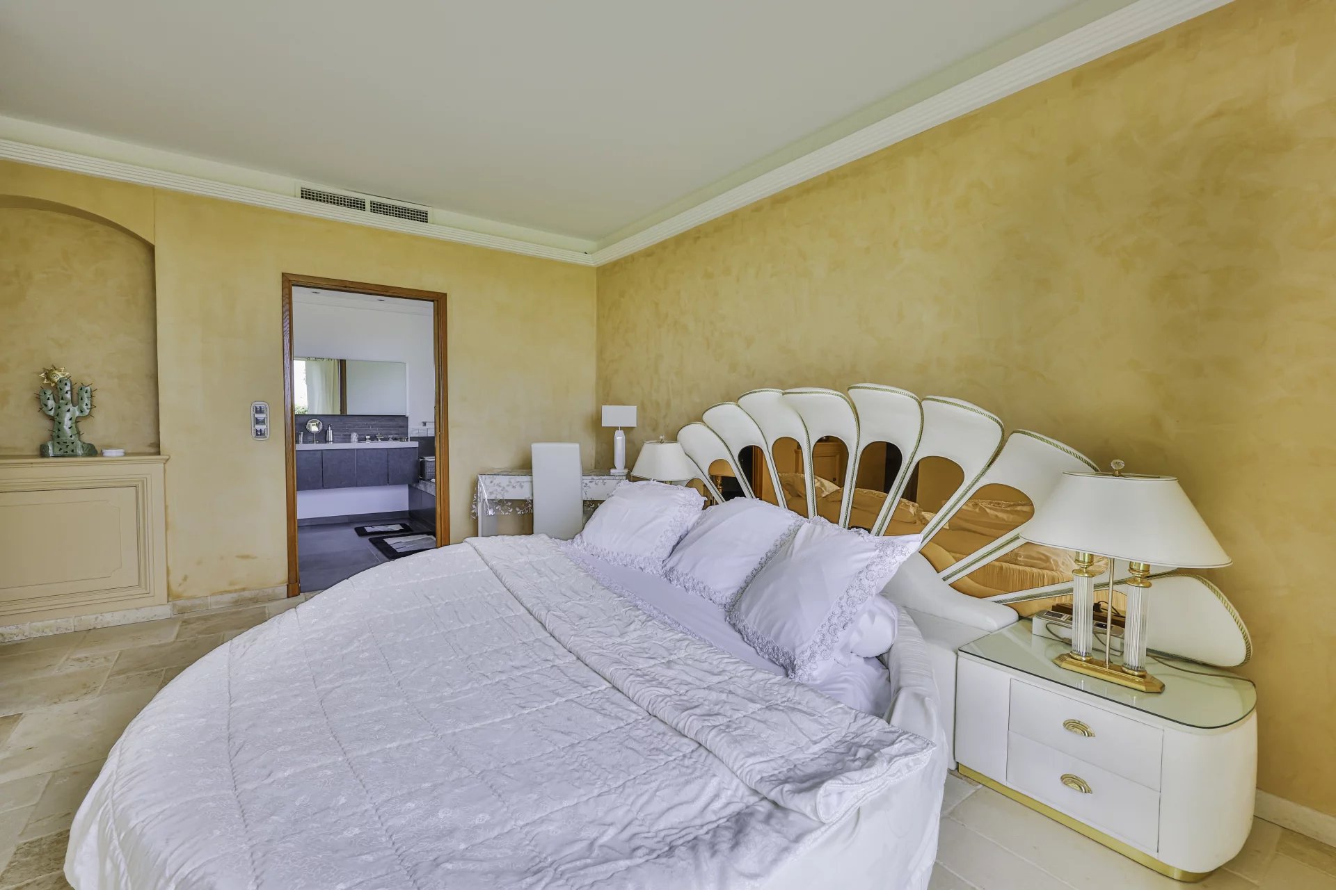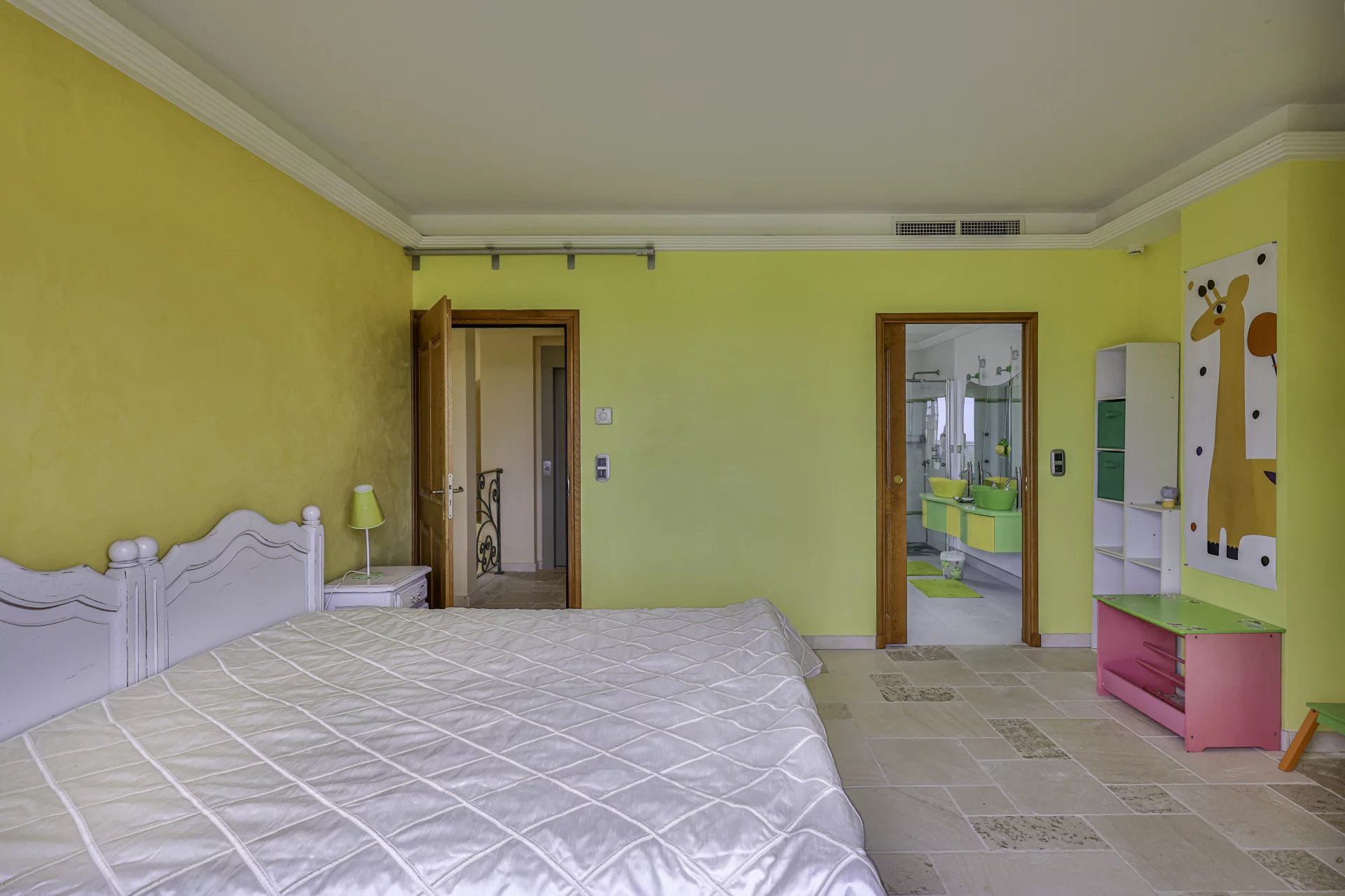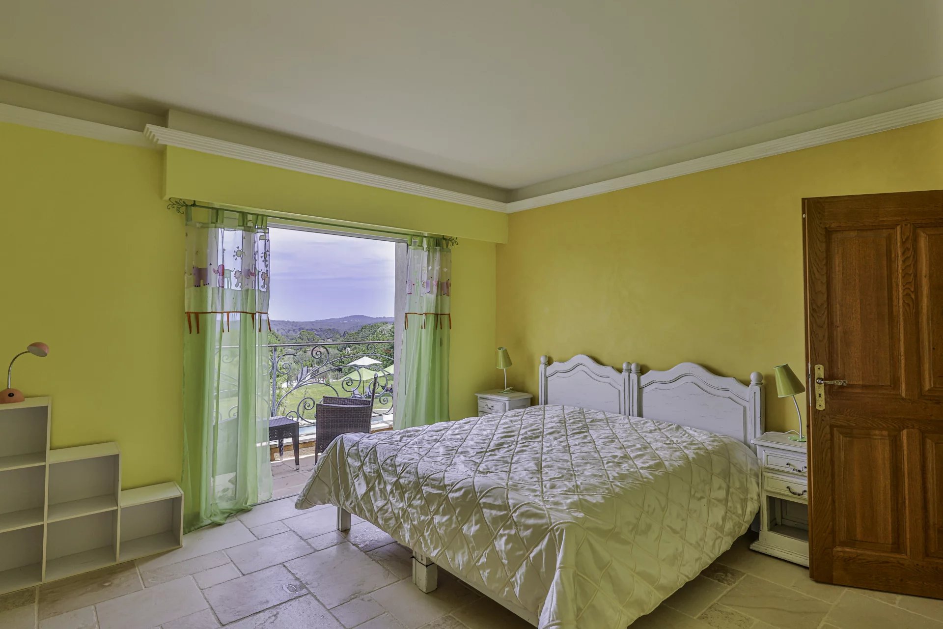 A l'étage, nous y retrouvons une grande chambre de maitre avec salle de bain, dressing et terrasse privée offrant une vue panoramique sur les collines et la mer au fond.