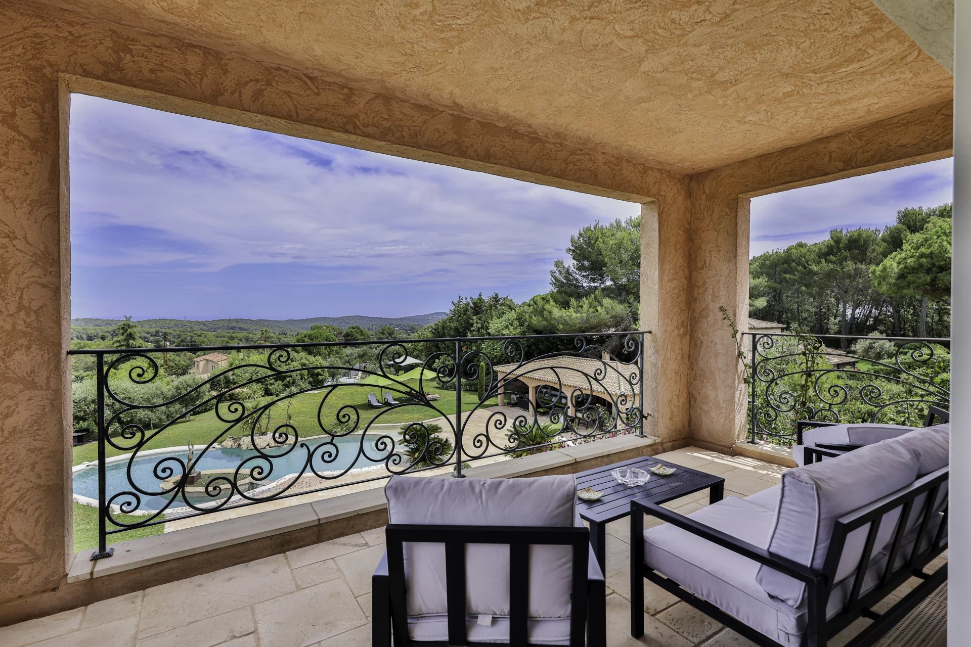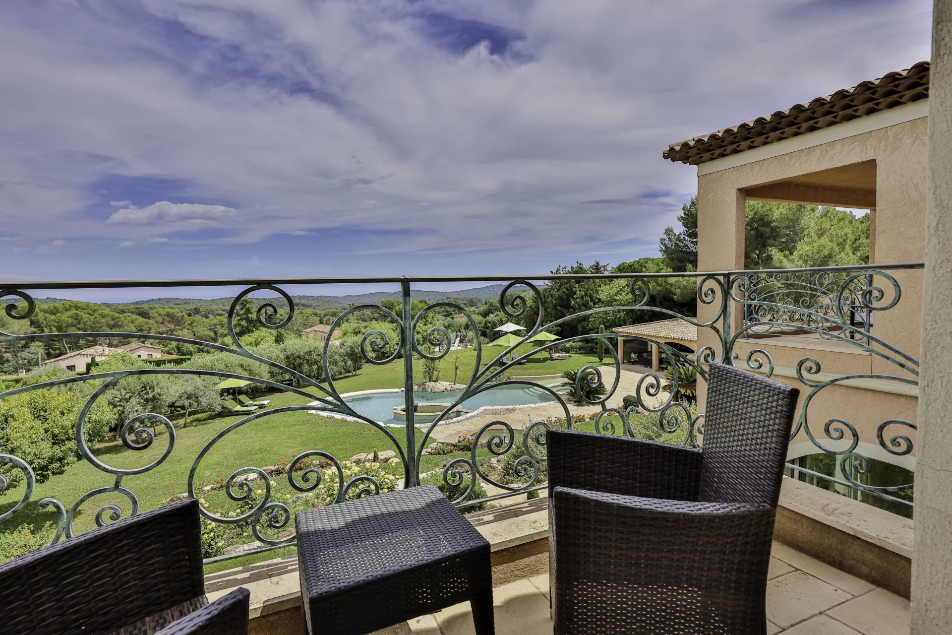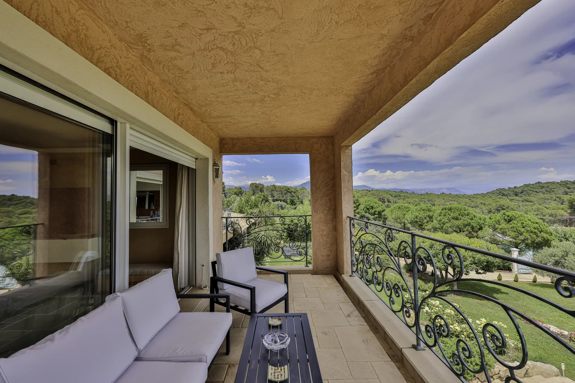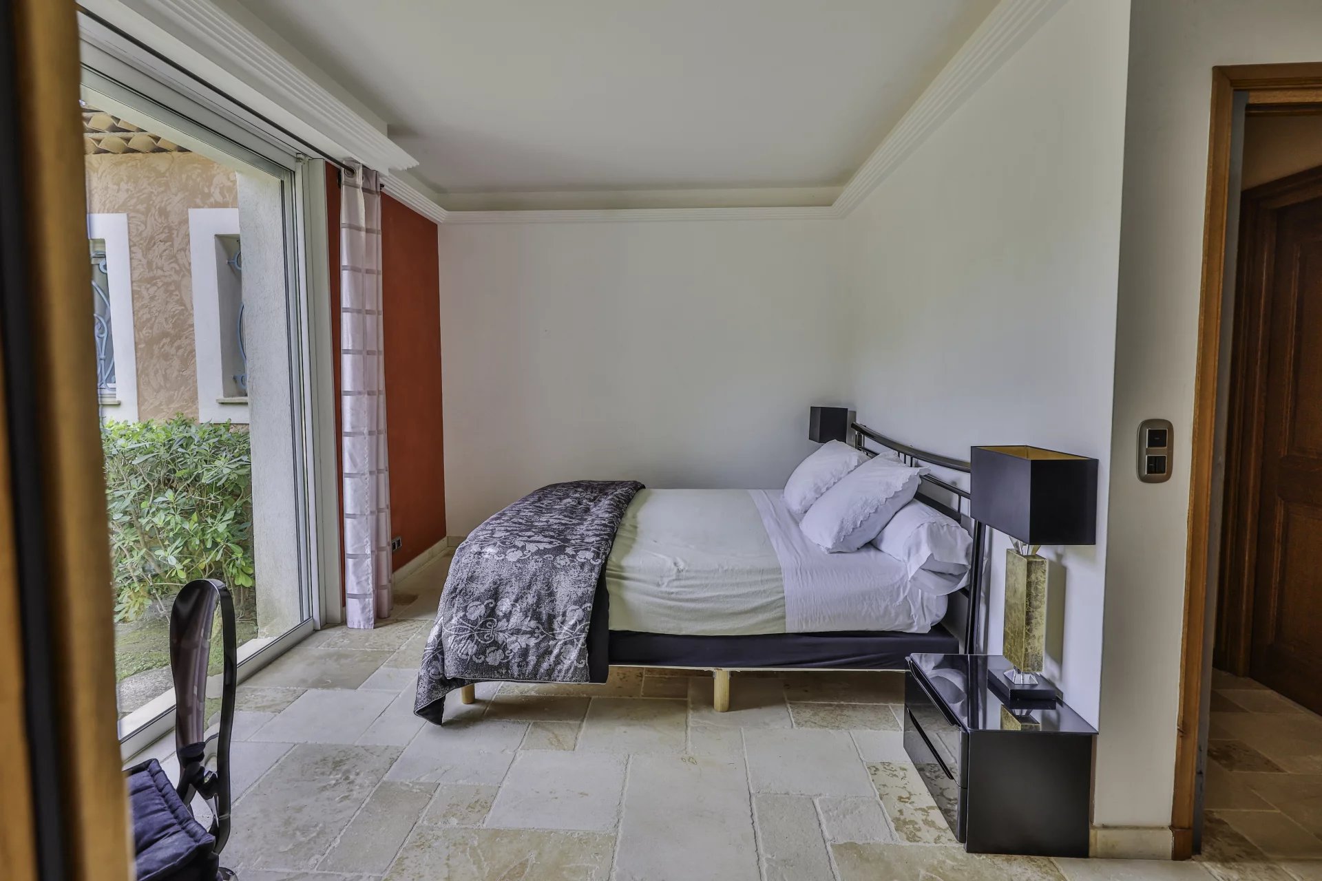 A l'étage, nous y retrouvons une grande chambre de maitre avec salle de bain, dressing et terrasse privée offrant une vue panoramique sur les collines et la mer au fond.