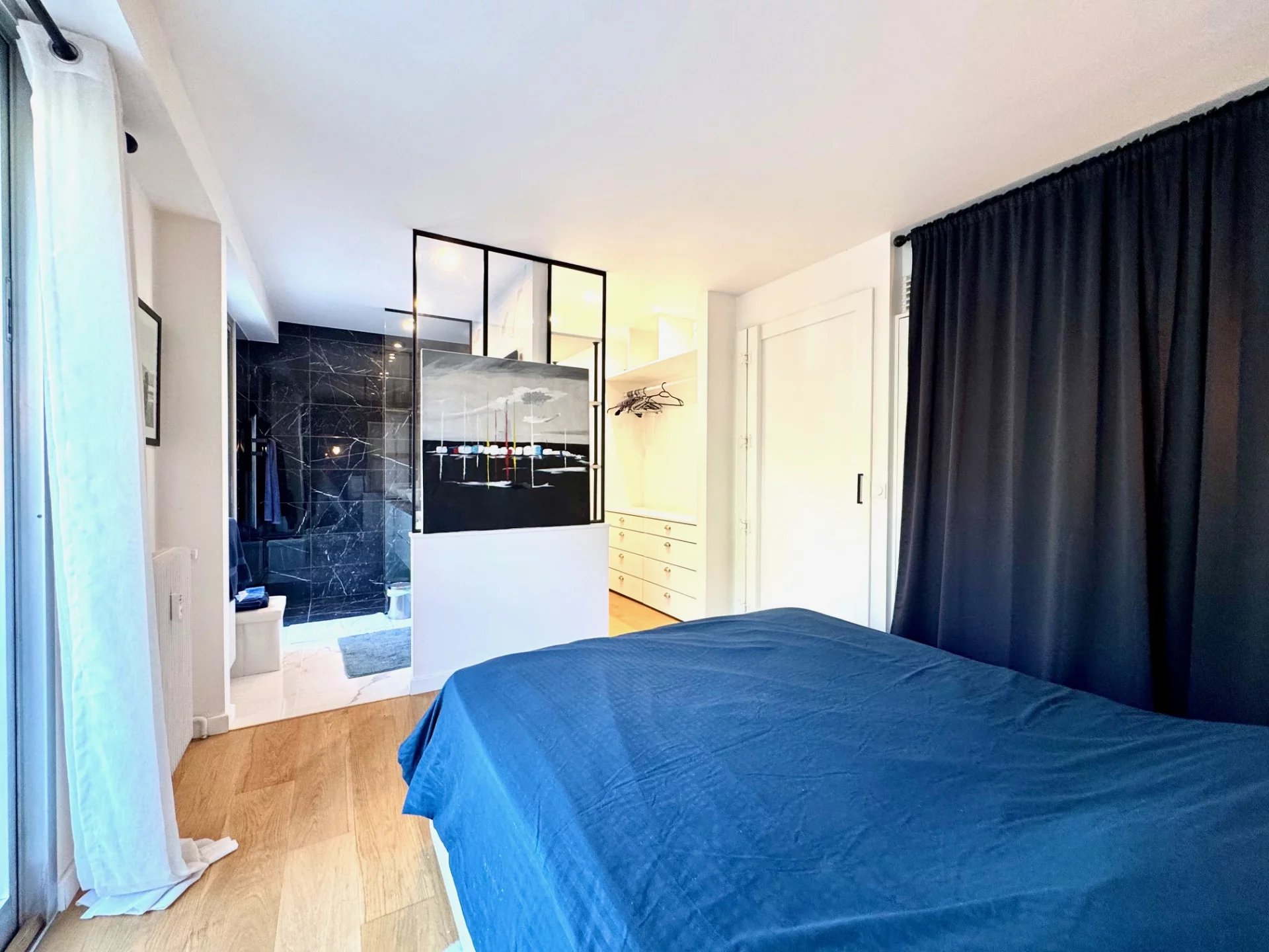 Il est composé d'un hall d'entrée distribuant un séjour confortable avec une belle cuisine ouverte équipée pour bénéficier de la vue au maximum l'ensemble donnant sur une terrasse ,une belle chambre avec un dressing un placard et sa salle de douche italienne avec double vasque .