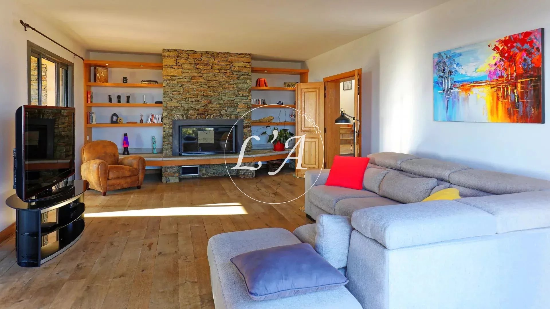 L’agencement intérieur allie élégance et fonctionnalité, avec un vaste salon agrémenté d’une cheminée, un séjour-salle à manger baigné de lumière naturelle et une cuisine entièrement équipée aux finitions haut de gamme.