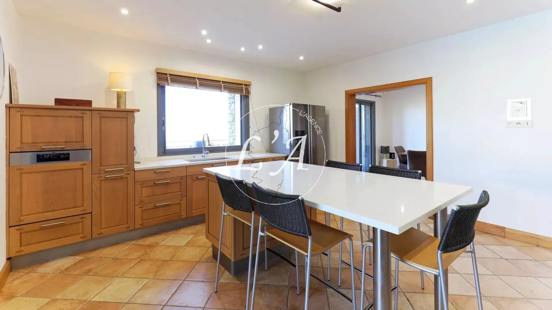 L’ensemble s’ouvre sur une immense terrasse dominant la piscine à débordement et sa cuisine d’été, véritable invitation à la détente en plein air.