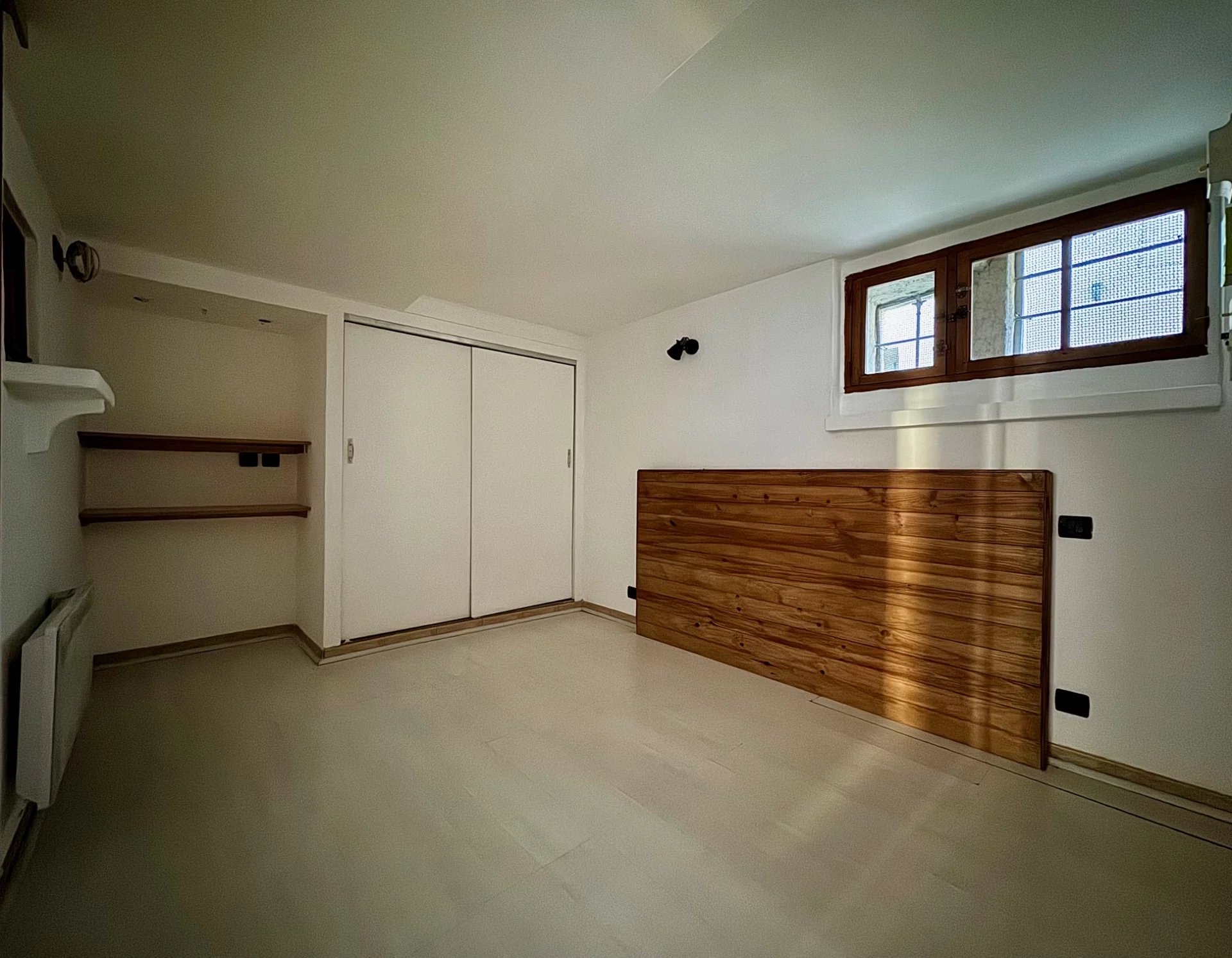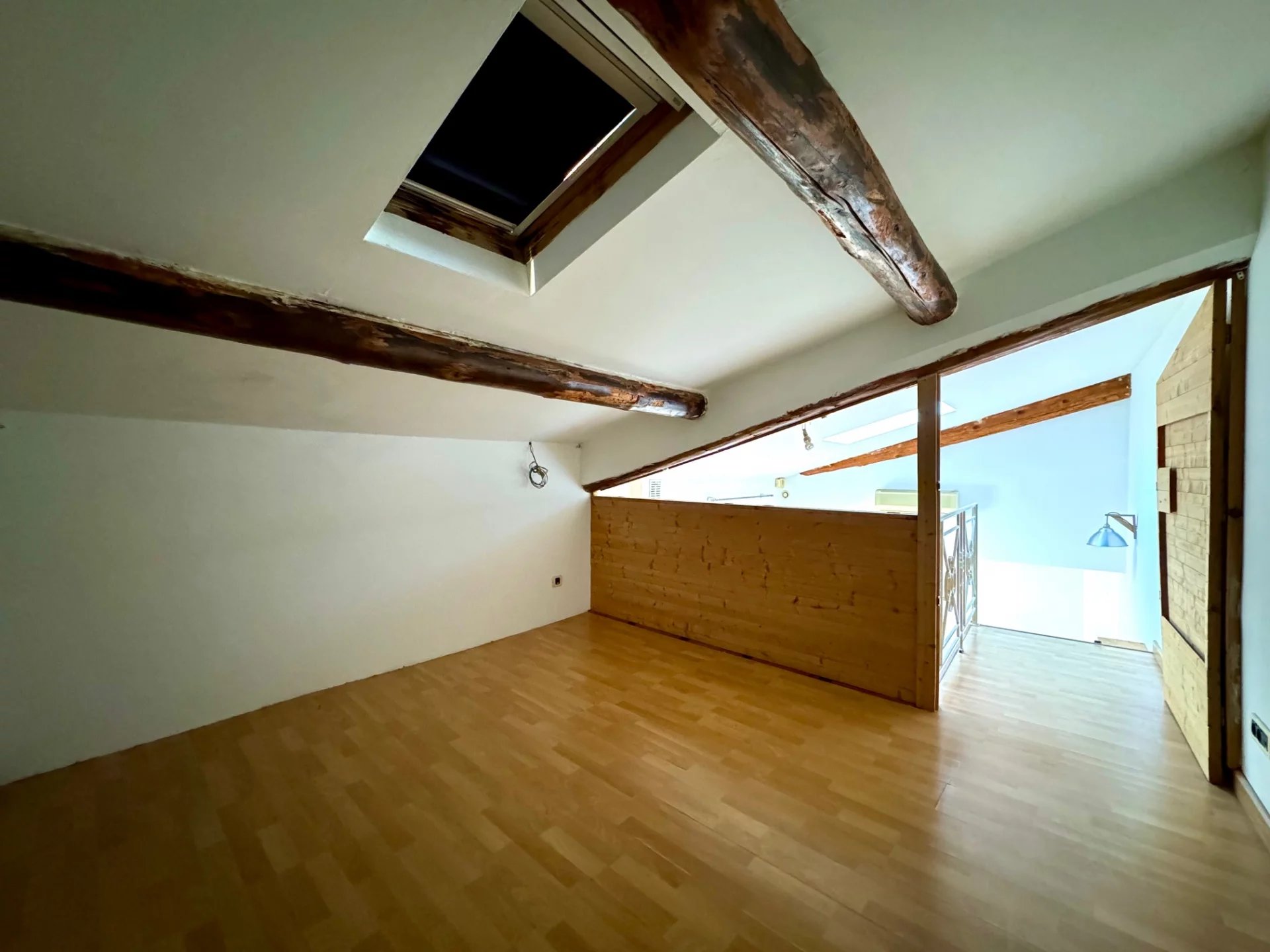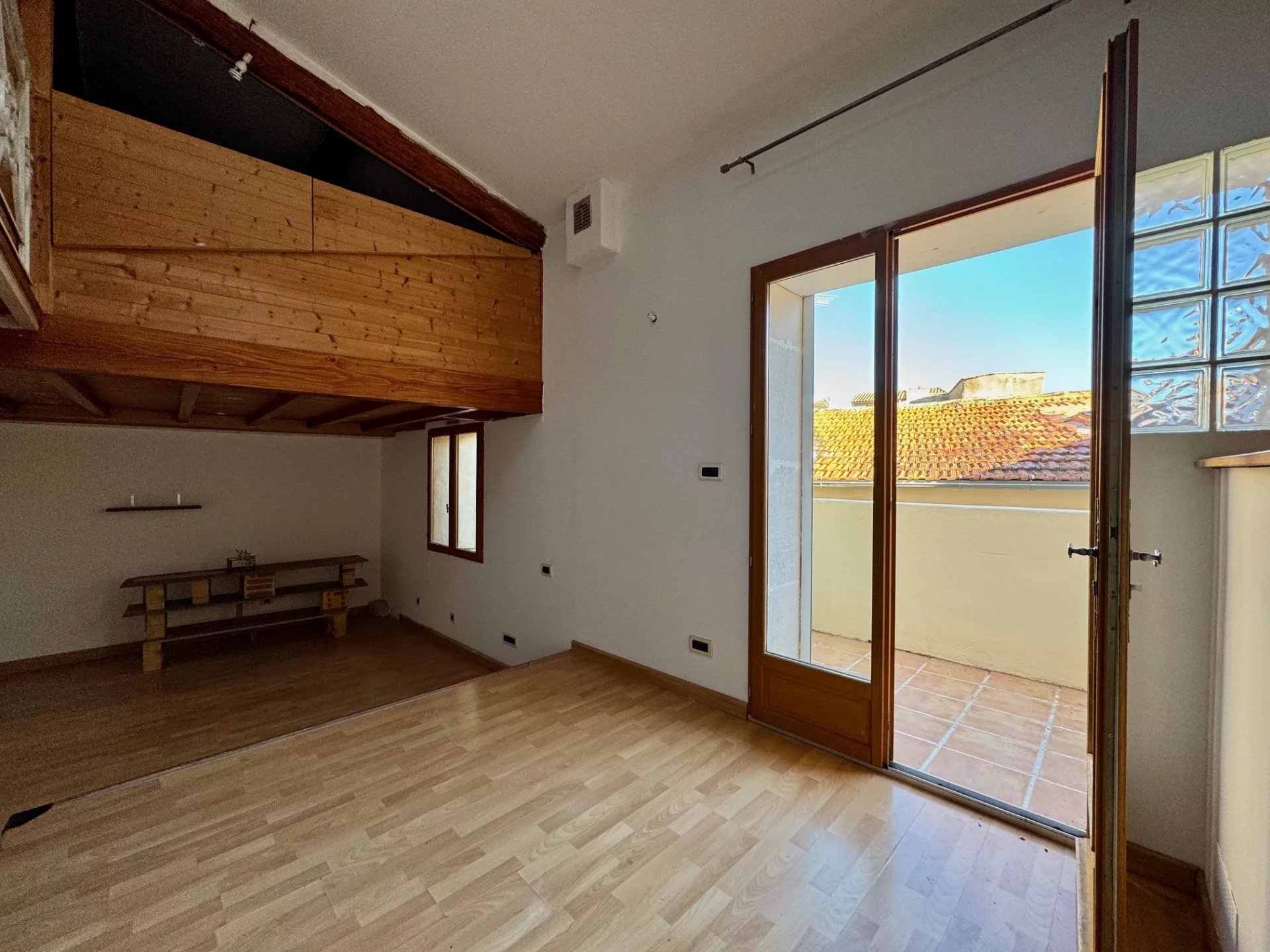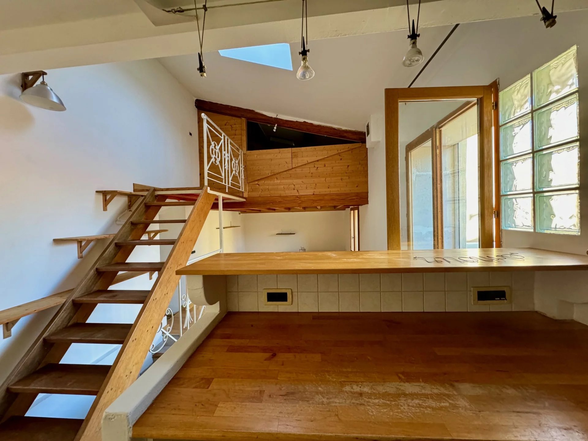 A l'étage : Palier avec séjour - mezzanine, cuisine ouvrant sur un balcon à l'est, dégagement, chambre avec placard penderie et salle d'eau-wc.