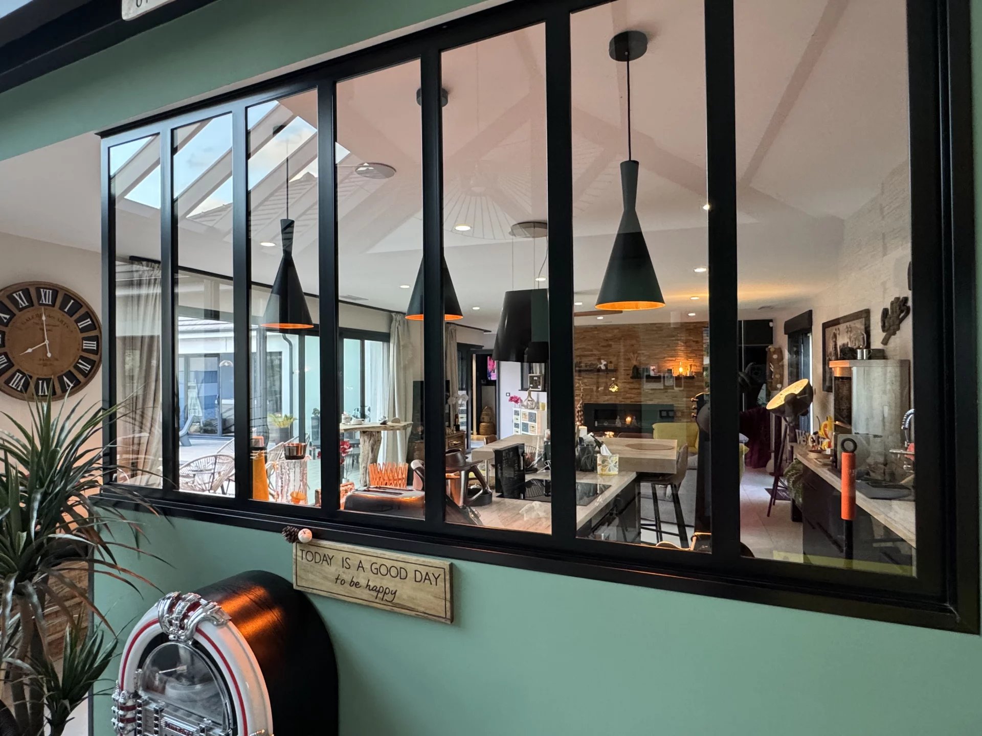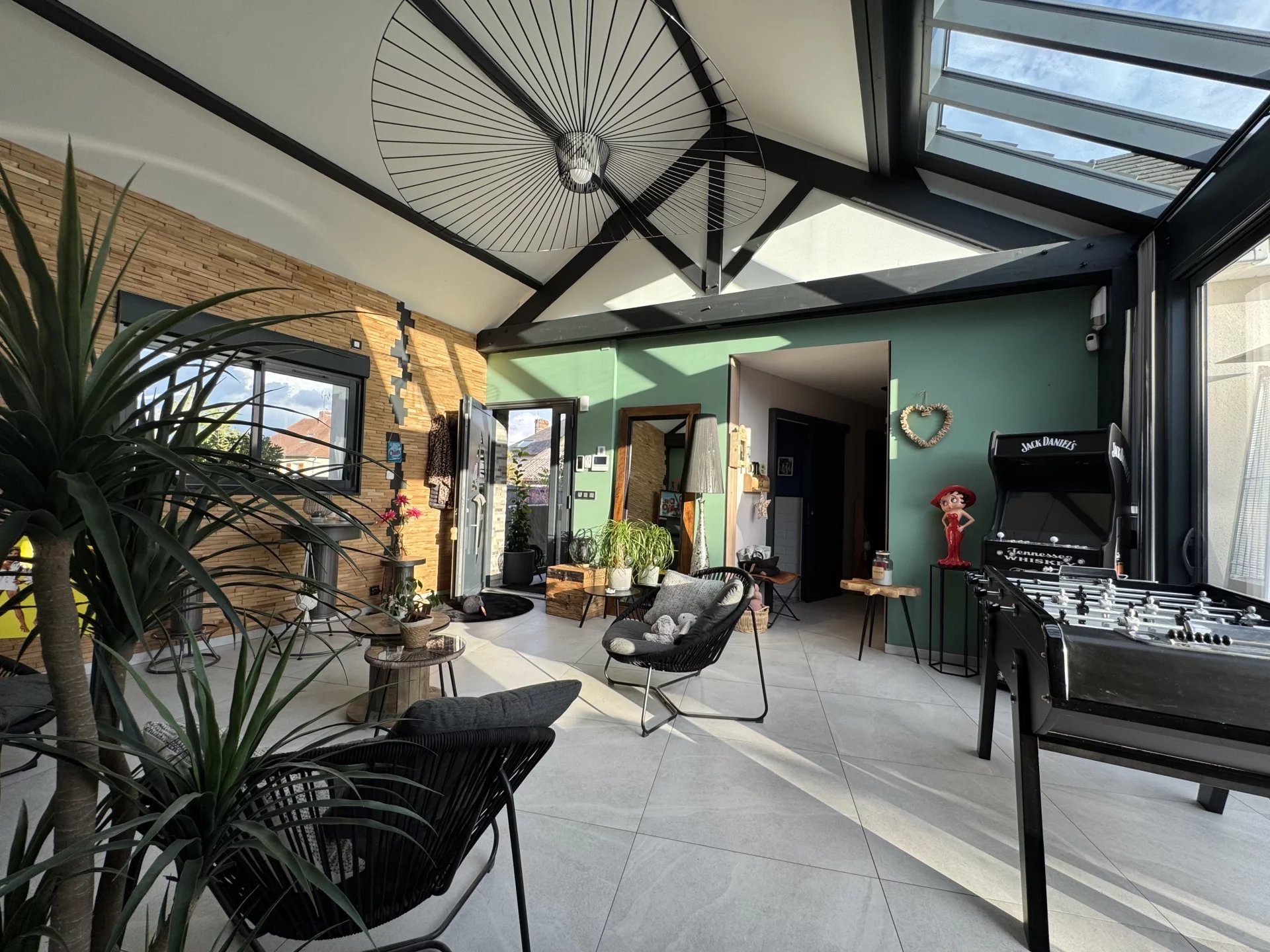 . Un vaste séjour baigné de lumière naturelle , avec vue sur le jardin et la piscine , toit cathédrale vitré .