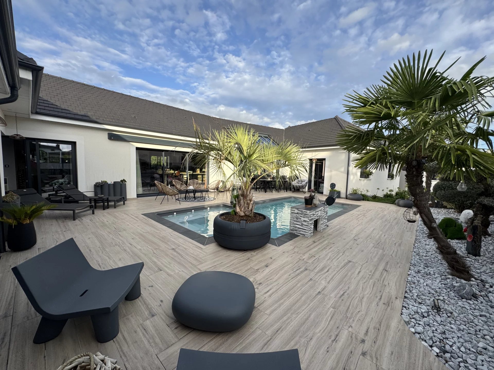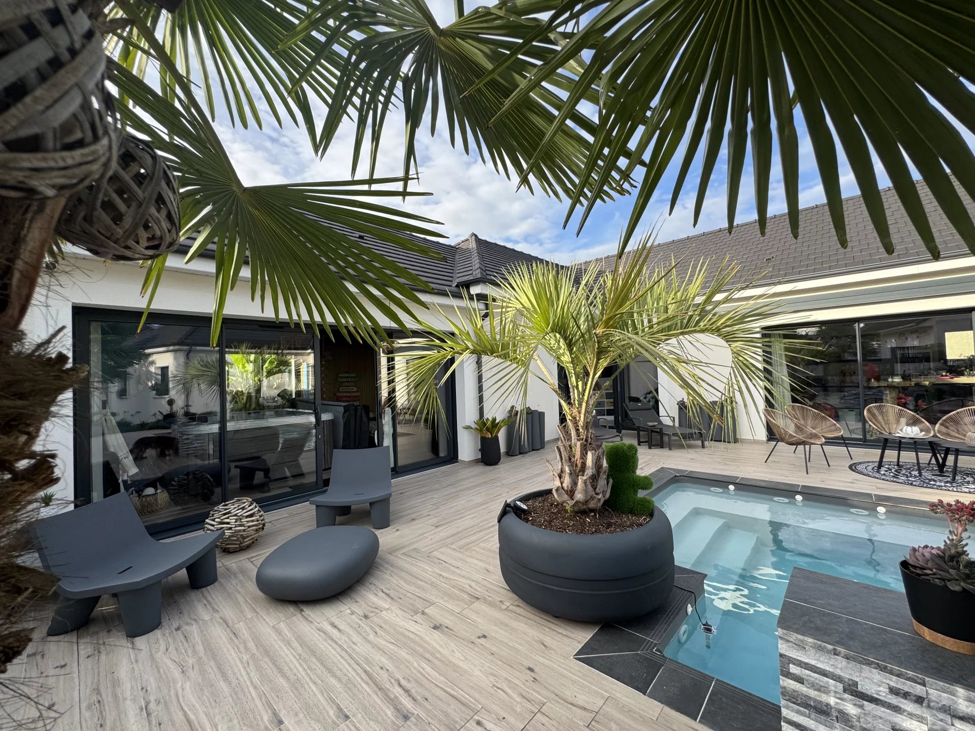 Dès l'entrée elle séduit par ses espaces de vie spacieux , et lumineux , notamment grâce à de grandes baies vitrées en aluminium qui ouvrent sur une vaste terrasse entourant une piscine chauffée de 6 m X 3 m .