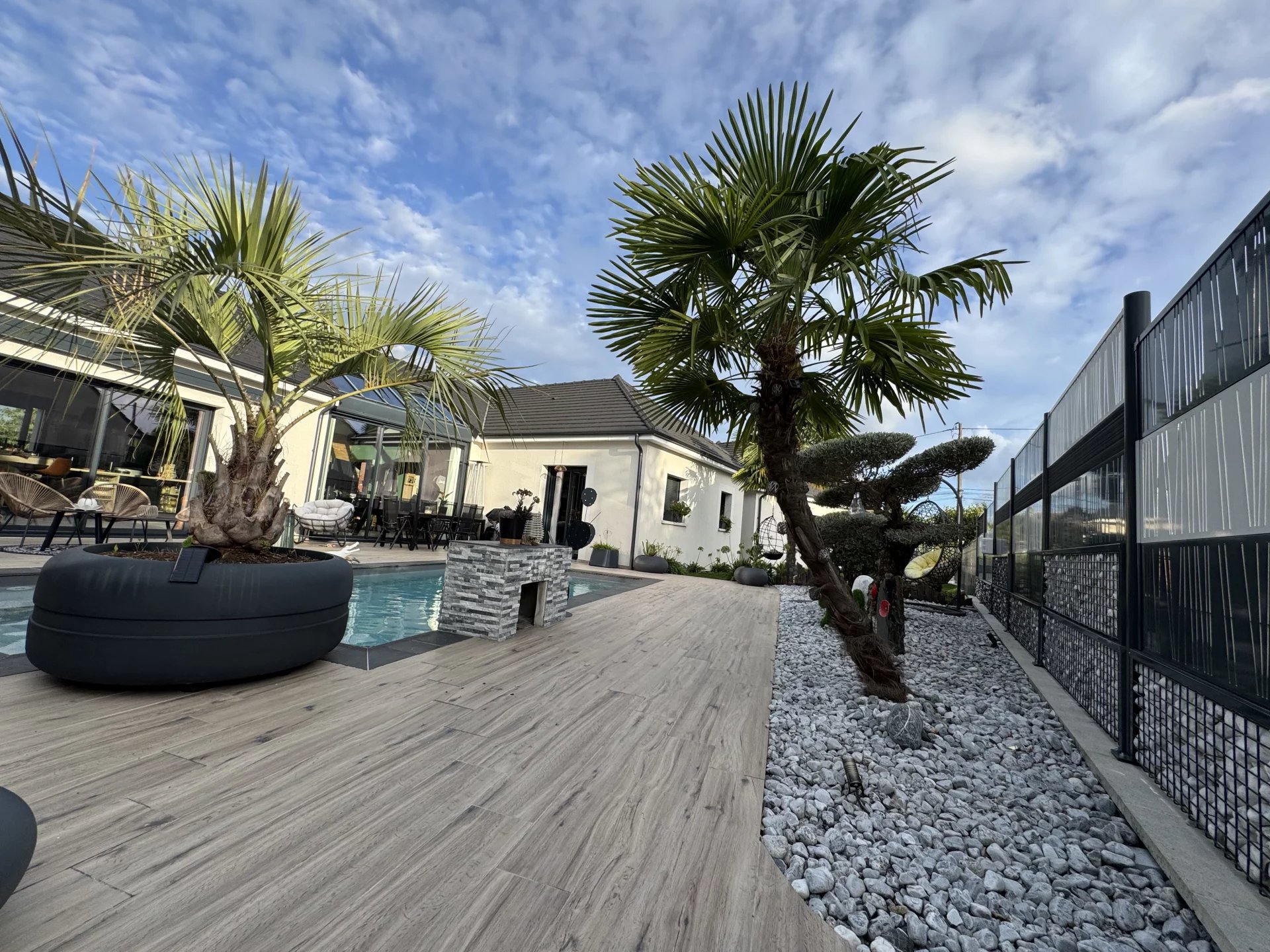 Dès les premiers instants, cette propriété d'exception vous plonge dans un environnement raffiné , où l'architecture contemporaine se marie harmonieusement avec un jardin soigneusement aménagé et agrémenté de multiples essences d'arbres et d'arbustes .