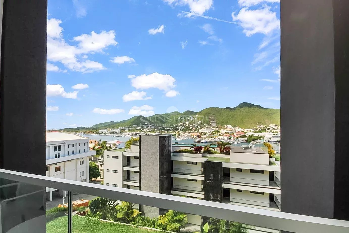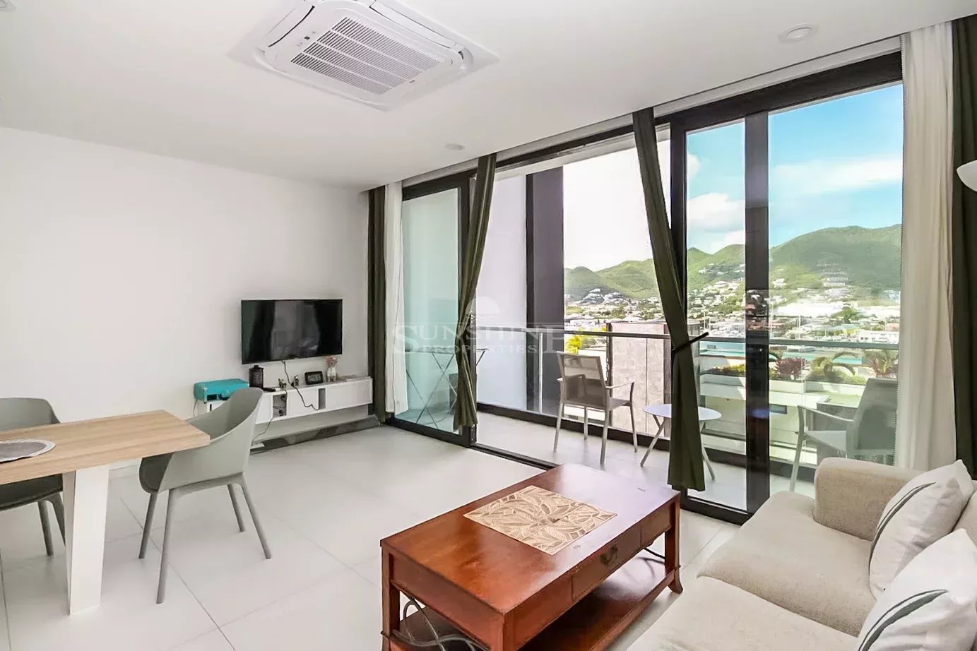 Fully furnished with modern décor and sleek contemporary furnishings, neutral tones, and elegant finishes create a chic, move-in-ready space. The open-concept living area is bright and airy with floor-to-ceiling glass sliding doors that open to a private balcony with panoramic views of the Simpson Bay Lagoon. The fully equipped kitchen boasts stainless steel appliances, stone countertops, and custom cabinetry, providing a clean, functional layout for any culinary enthusiast. Retreat to the spacious bedroom with a custom wallboard, contemporary finishing offering a tranquil haven.