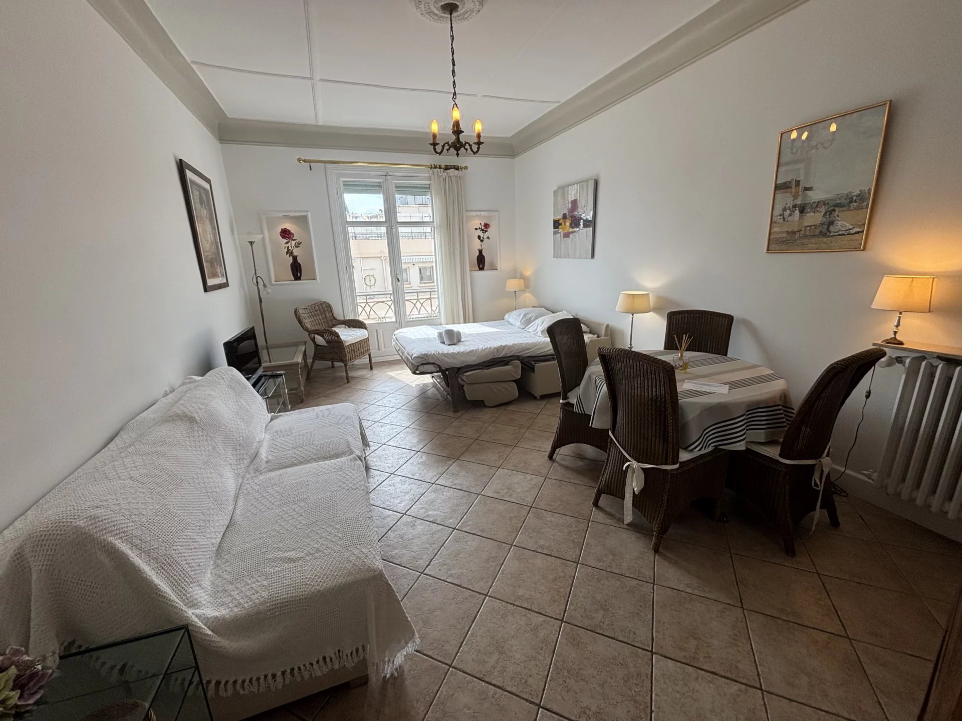 A Cannes, sur le Boulevard de La Croisette, entre les hôtels Carlton et Martinez, dans une résidence de grand standing avec gardien, joli appartement de 34,86 m2 Loi Carrez avec un balcon à la vue mer latérale. Entrée avec placards, pièce principale ouvrant sur le balcon, cuisine séparée et salle de douches avec WC. Une cave en sous-sol.