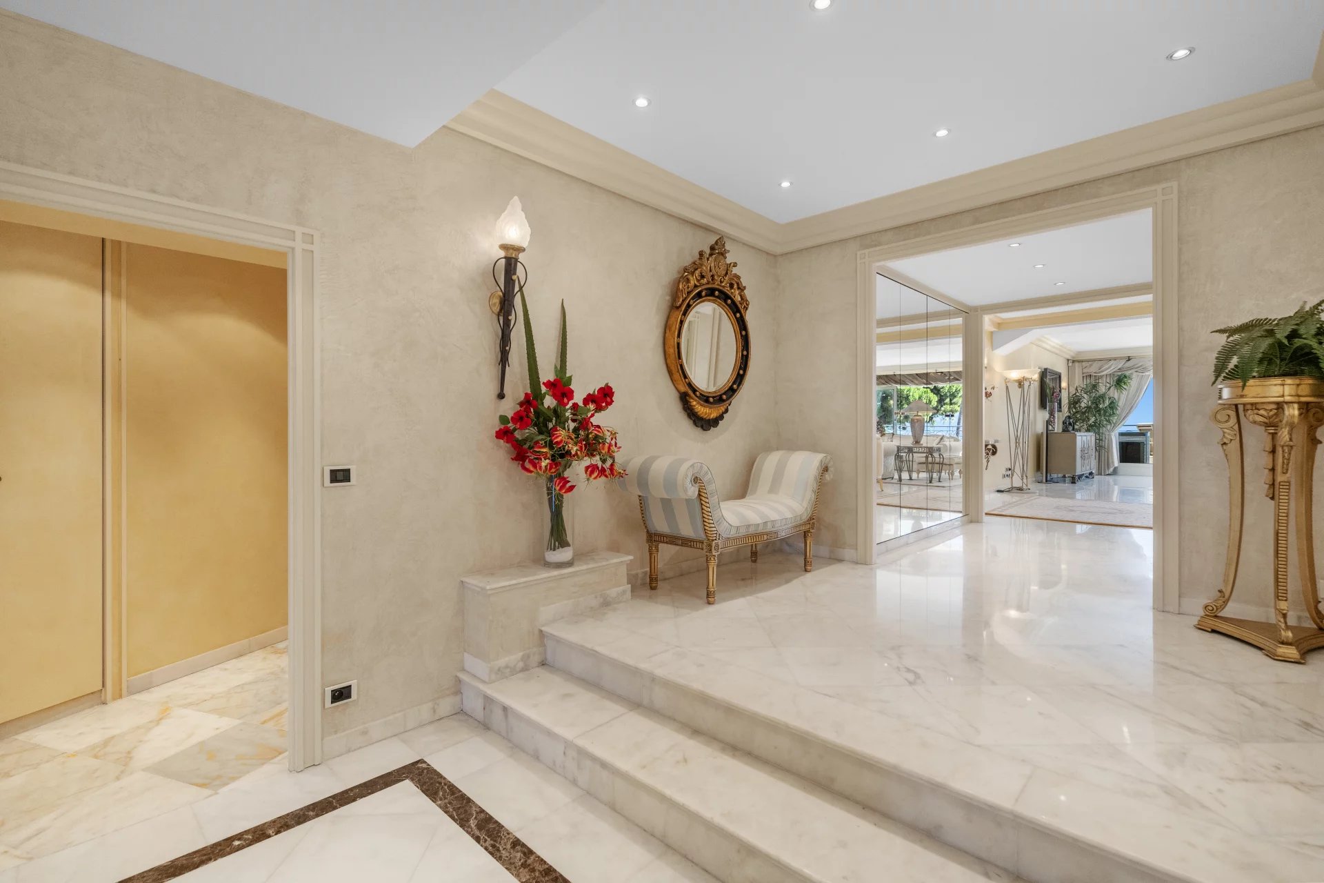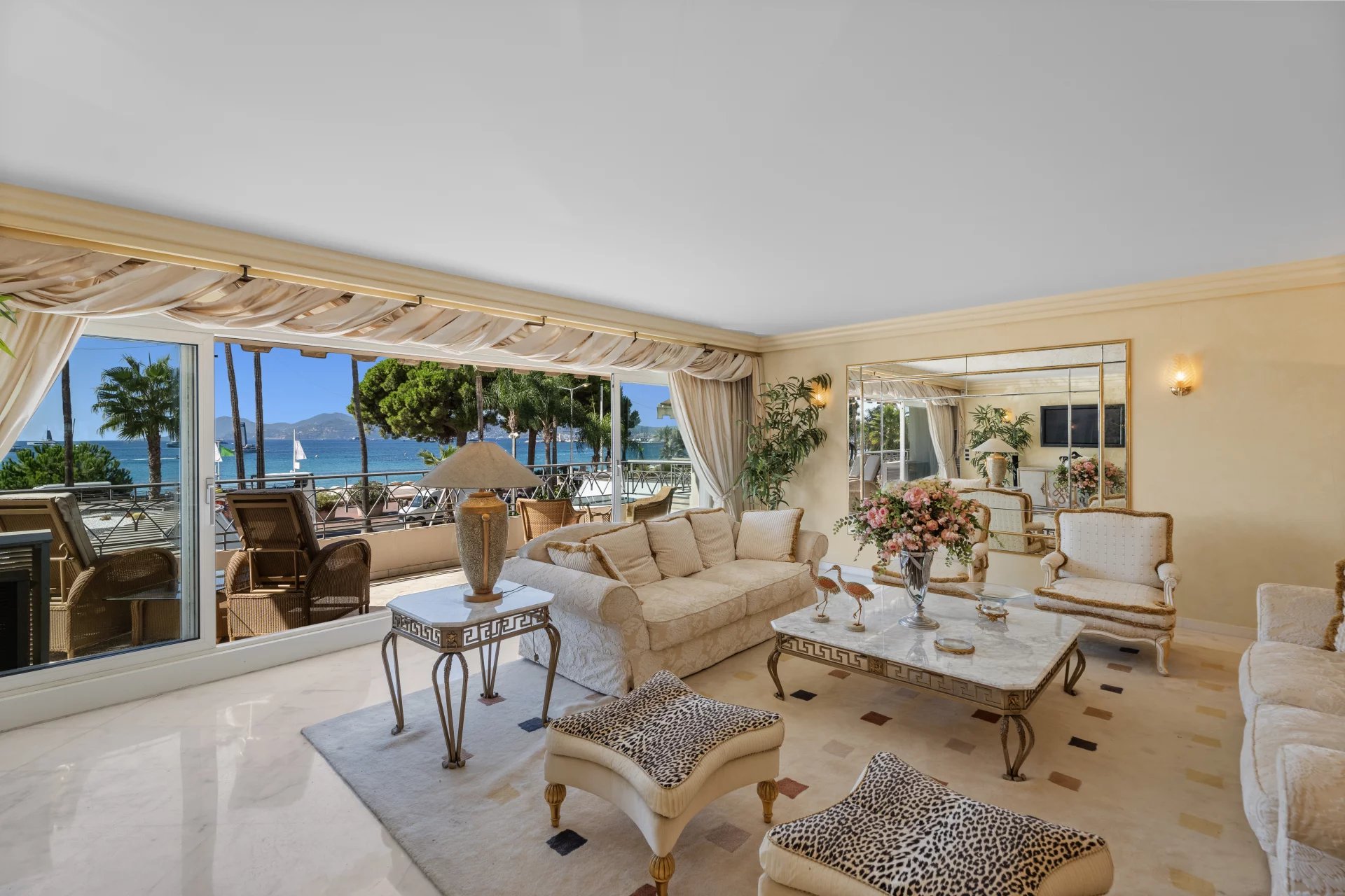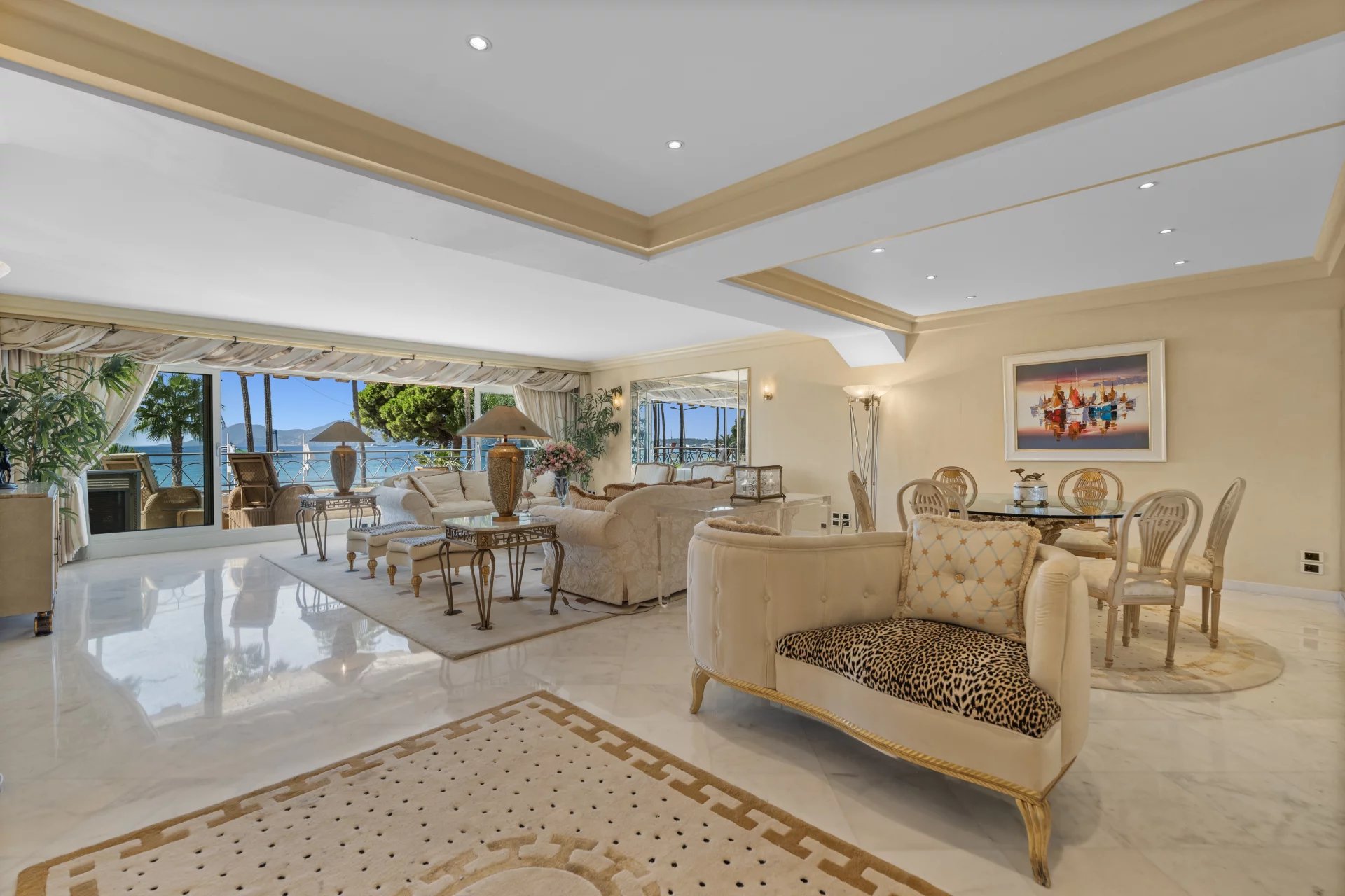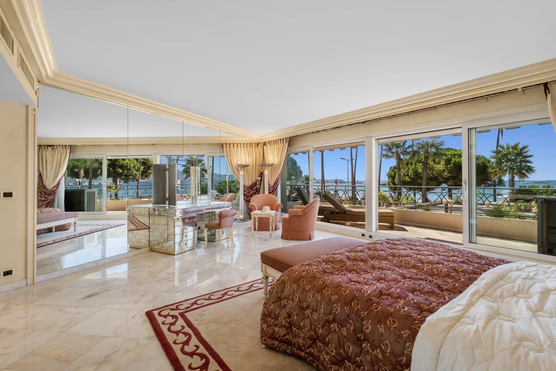 A Cannes, sur le Boulevard de La Croisette, entre les hôtels Carlton et Martinez, dans une résidence de grand standing avec gardien et service de sécurité 24/24h et 7/7j, spacieux appartement traversant de 4 pièces principales d'une superficie de 245 m2 avec studio attenant de 33 m2.