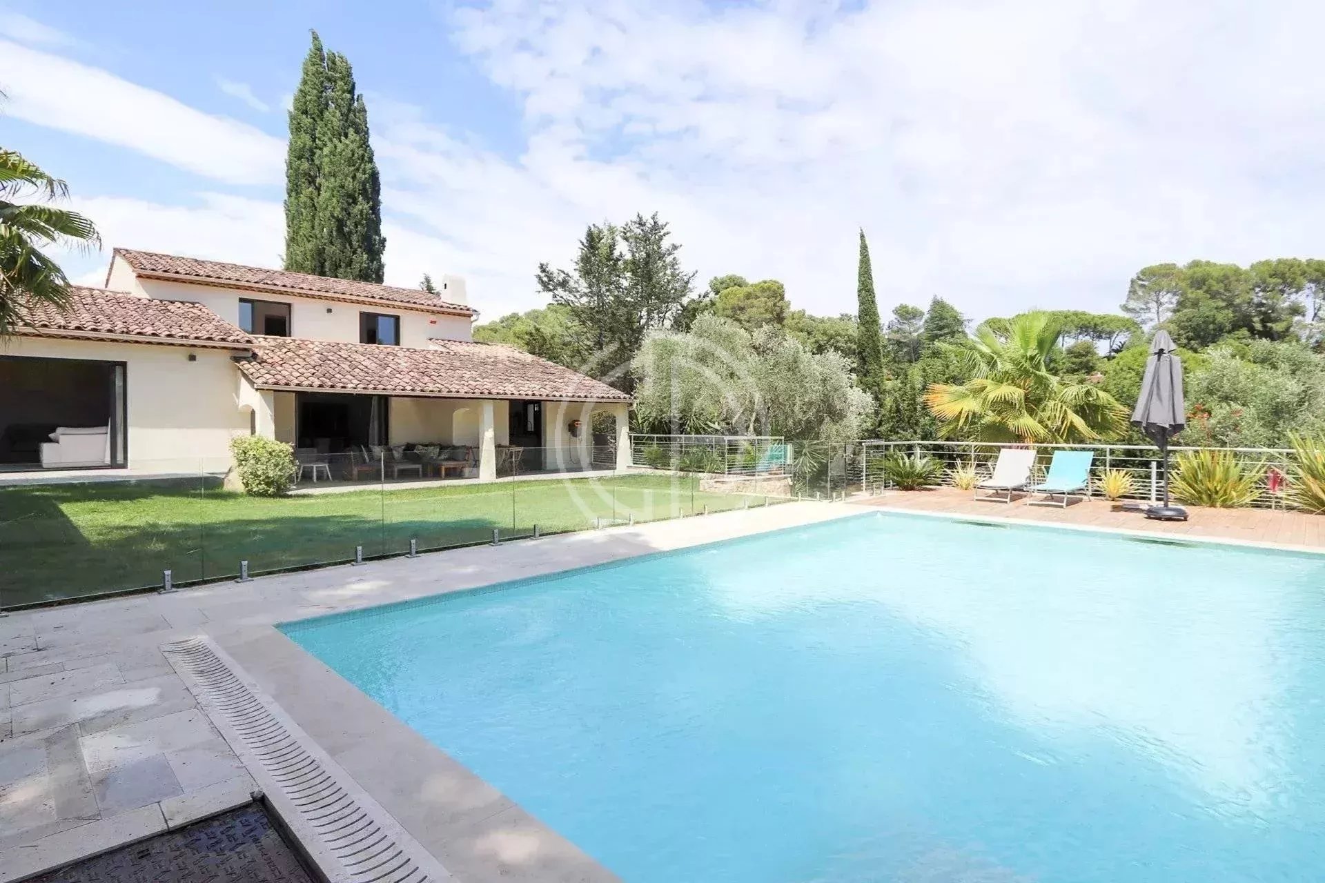 MOUGINS - Dans une secteur résidentiel et facile d'accès, belle villa moderne de 220m2 récemment rénovée, avec des dépendances. La villa dispose de beaux volumes, séjour et salle à manger, une cuisine contemporaine avec buanderie attenante. Pour la partie nuit: 2 chambres, un espace dressing/bureau et une salle de douche. A l'étage: 2 chambres en suite avec chacune leur salle de bain et dressing. En rez de jardin, un studio indépendant pour vos invités ou locatif. Un terrain exposé Sud de 1400 m² complanté avec des arbres fruitiers et oliviers, autour d'une belle piscine au sel chauffée, nage à contre courant et un pool house avec douche et cuisine aménagée. Un garage et stationnements complètent ce bien familial à proximité des commerces et écoles, Un permis de construire pour une villa de 120 m² + annexes a été obtenu et permettrait de détacher une parcelle de 900m2 environ sur la parcelle totale de 2300m2. Prix en supplément - Informations sur demande